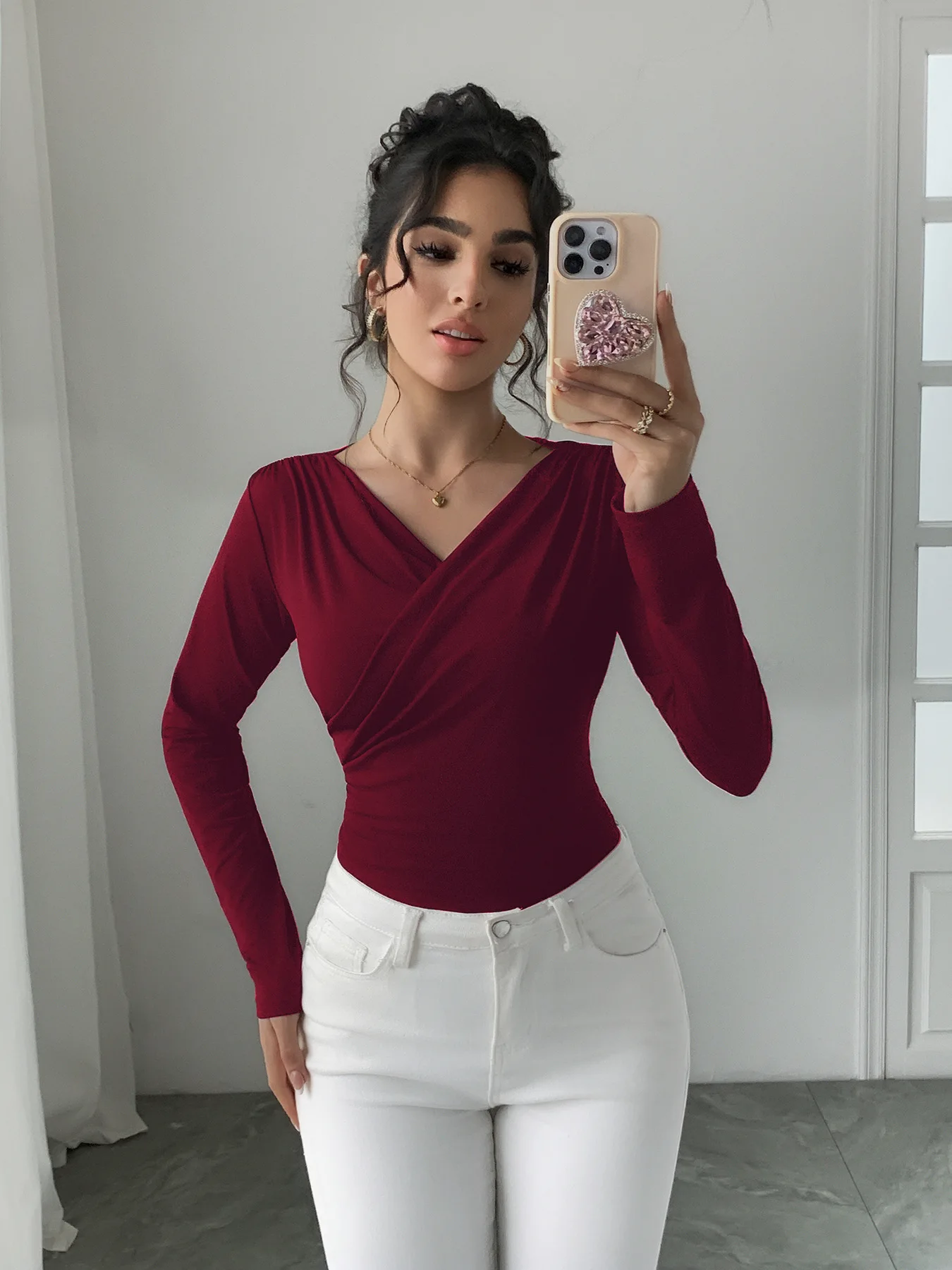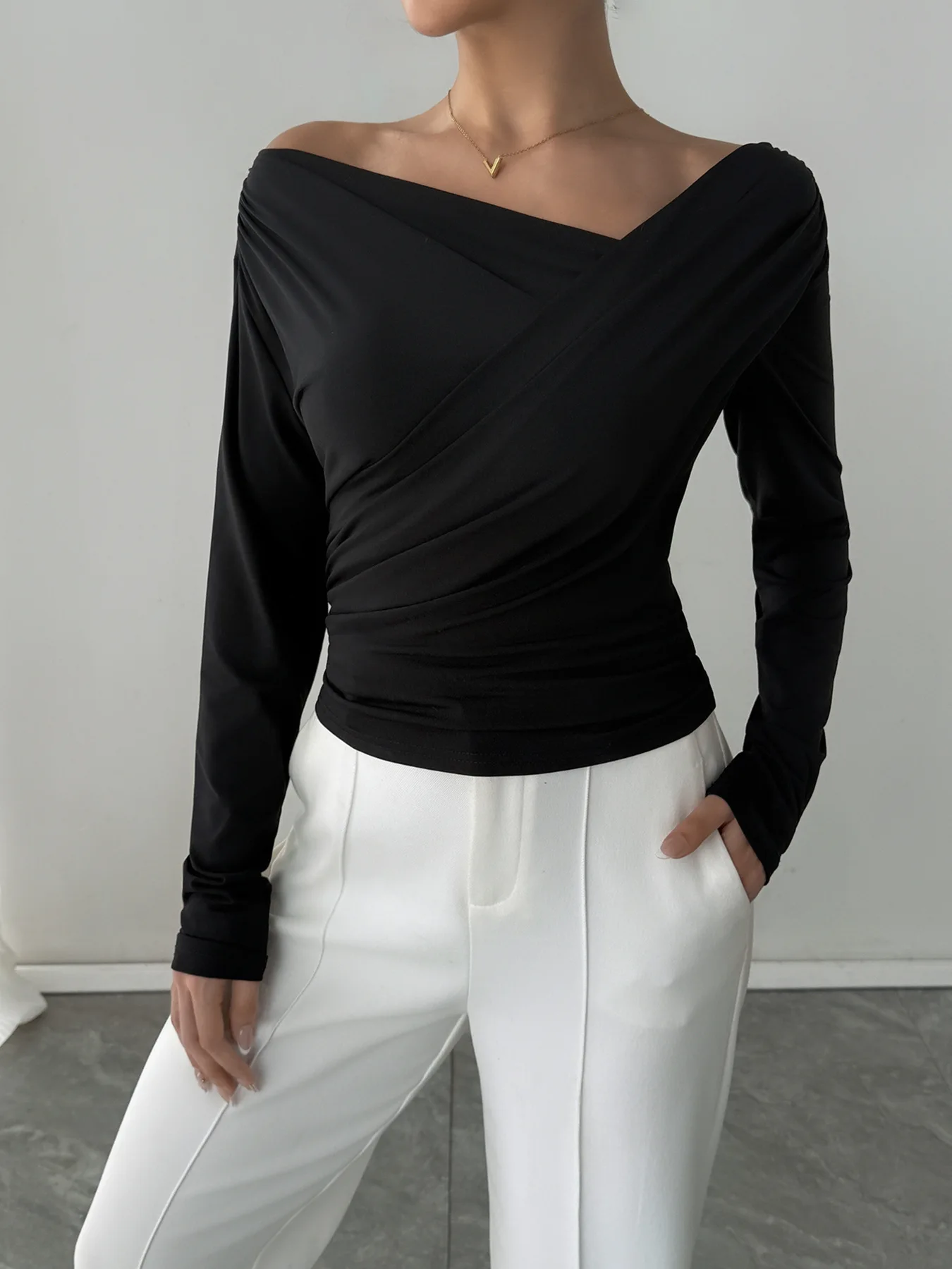 2025 Autumn and Winter New Pure Color Fashion Cross-Shoulder Off-the-Shoulder Slimming Long-Sleeve Versatile T-Shirt Top