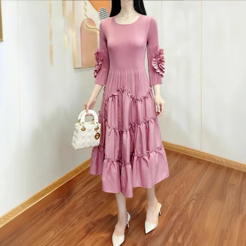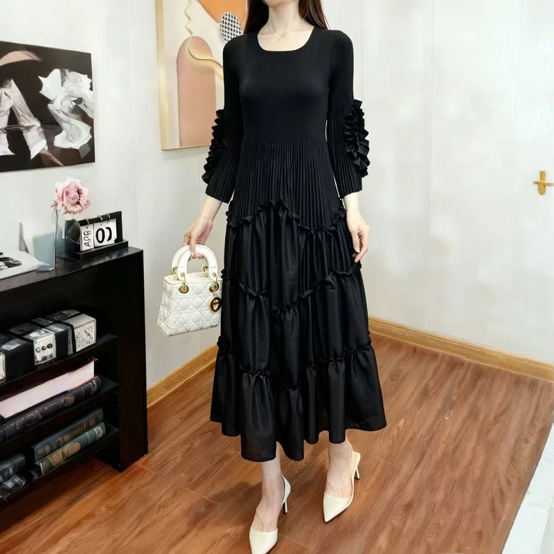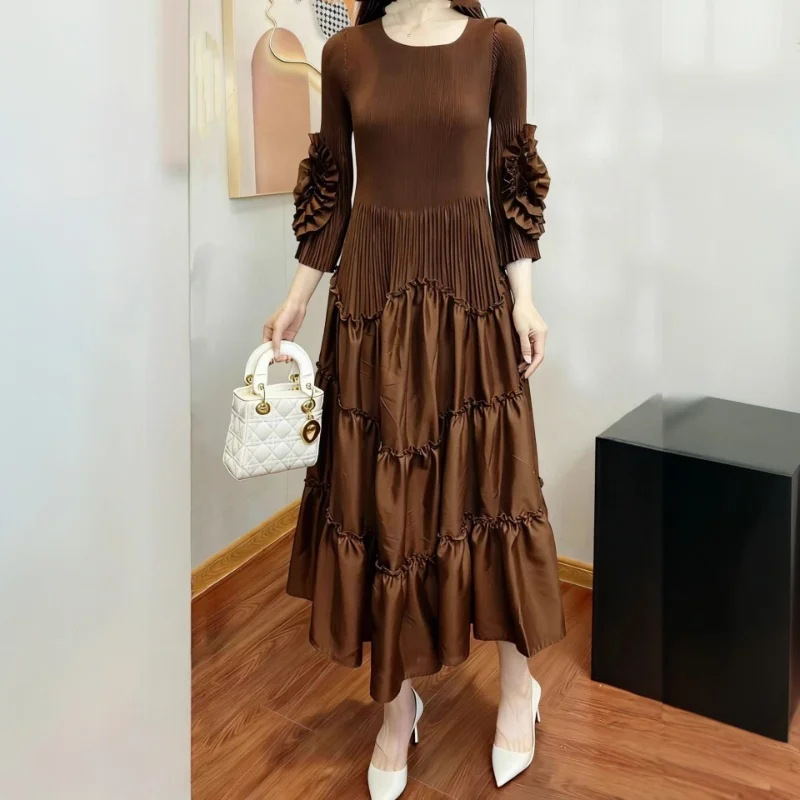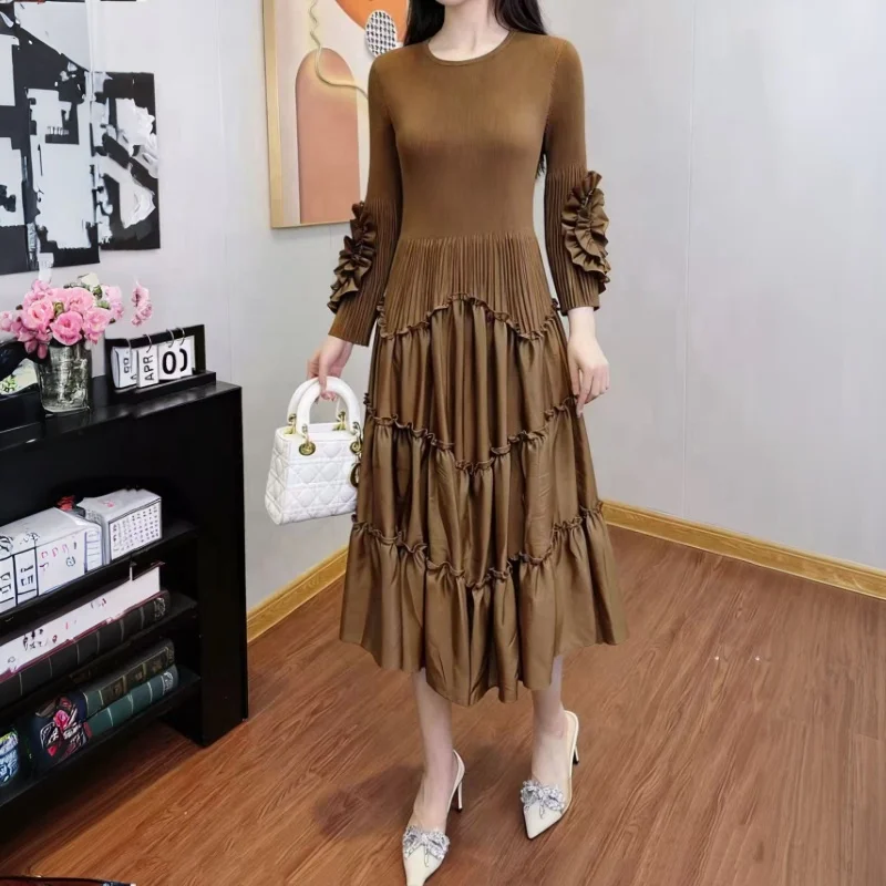 Factory Direct Spot Summer Ladies Casual A-Line Pleated Design Petal Sleeve Long Sleeve Shirt Dress Free Size Miyake Dress