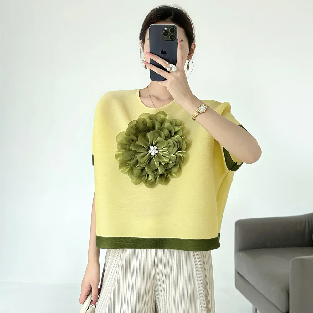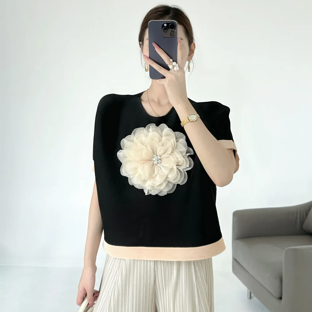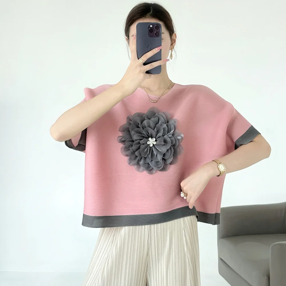 Miyake Women's Summer Joker T-Shirt Pleated Three-Dimensional Embroidered Design Contrast Color Simple Loose Commuter Style