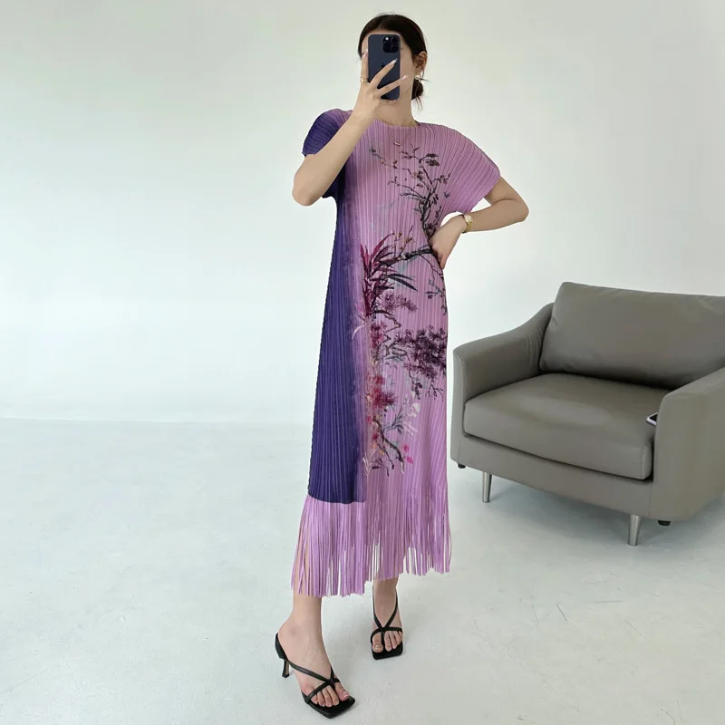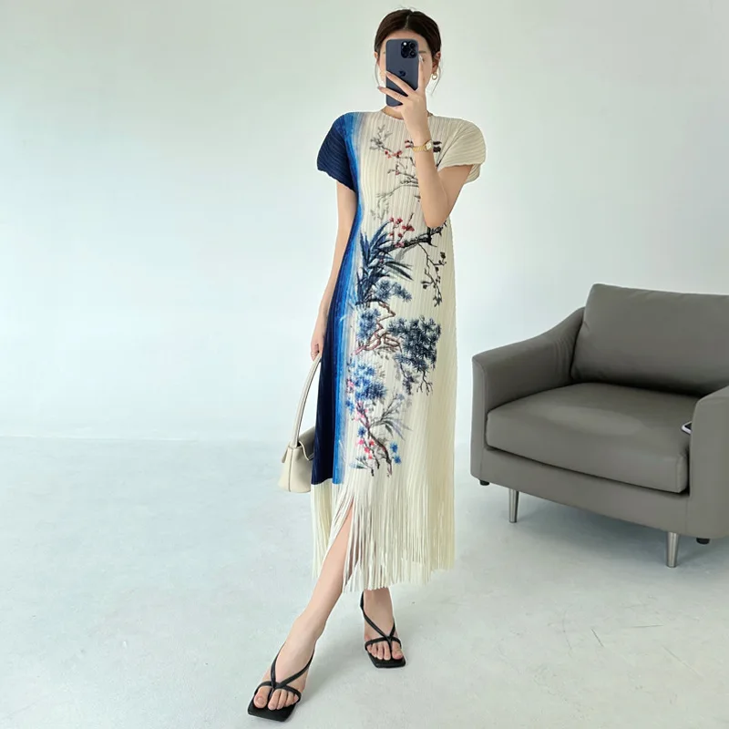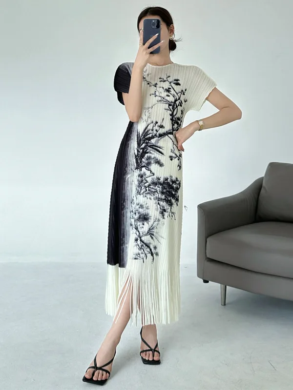 2025 Summer Retro Guofeng Chinese Tassel Dress for Women Miyake Pleat Short Sleeve Age Reduction Eco-Friendly Natural