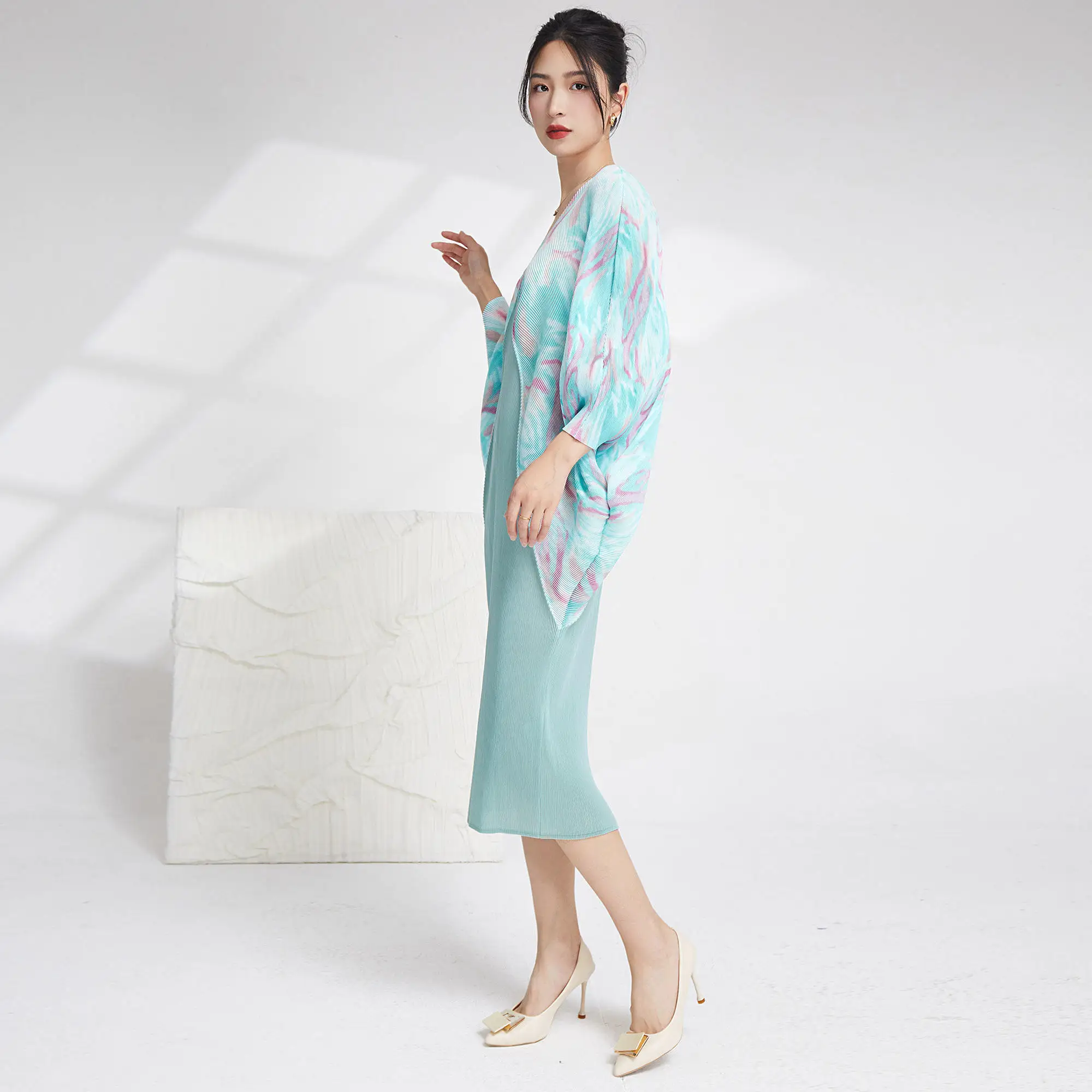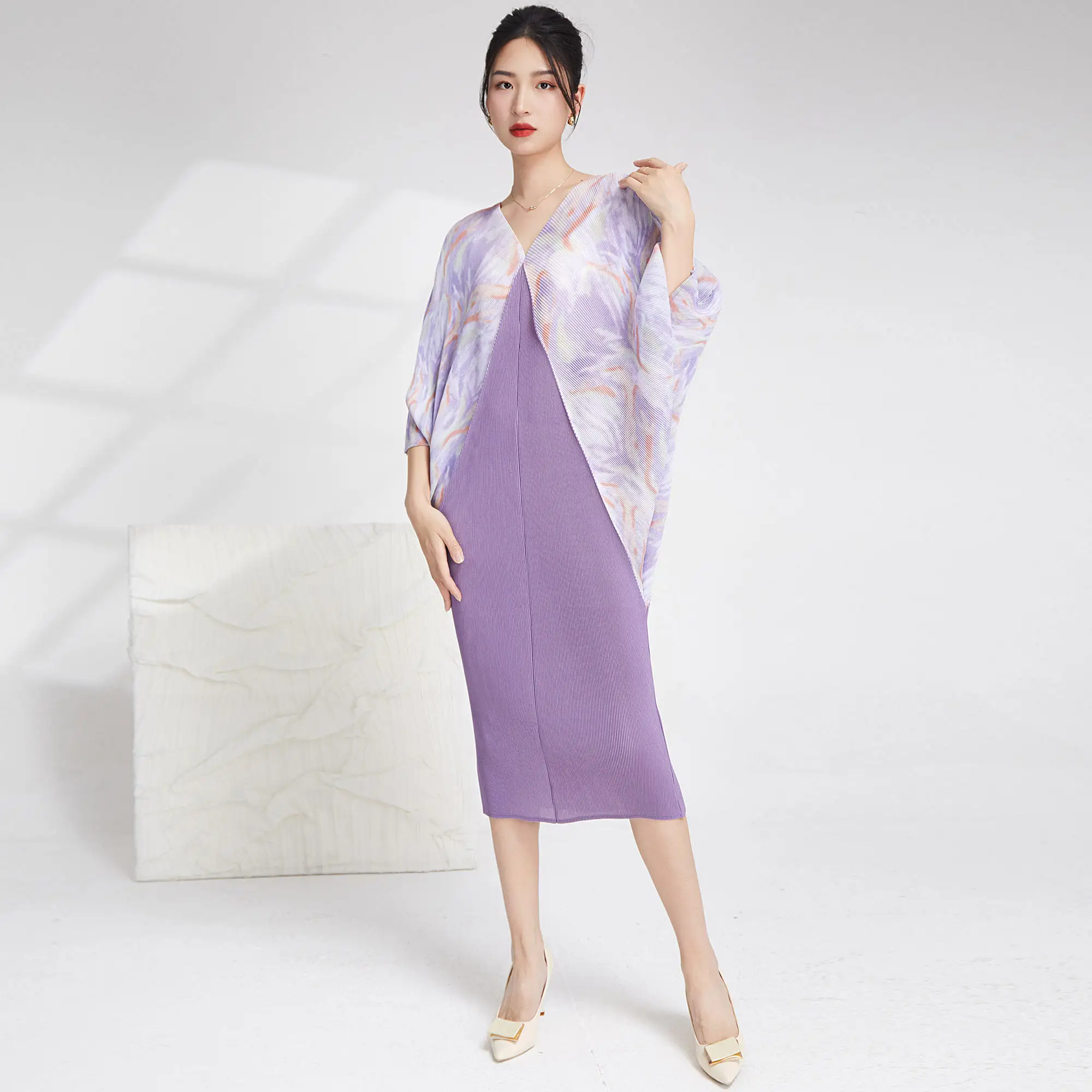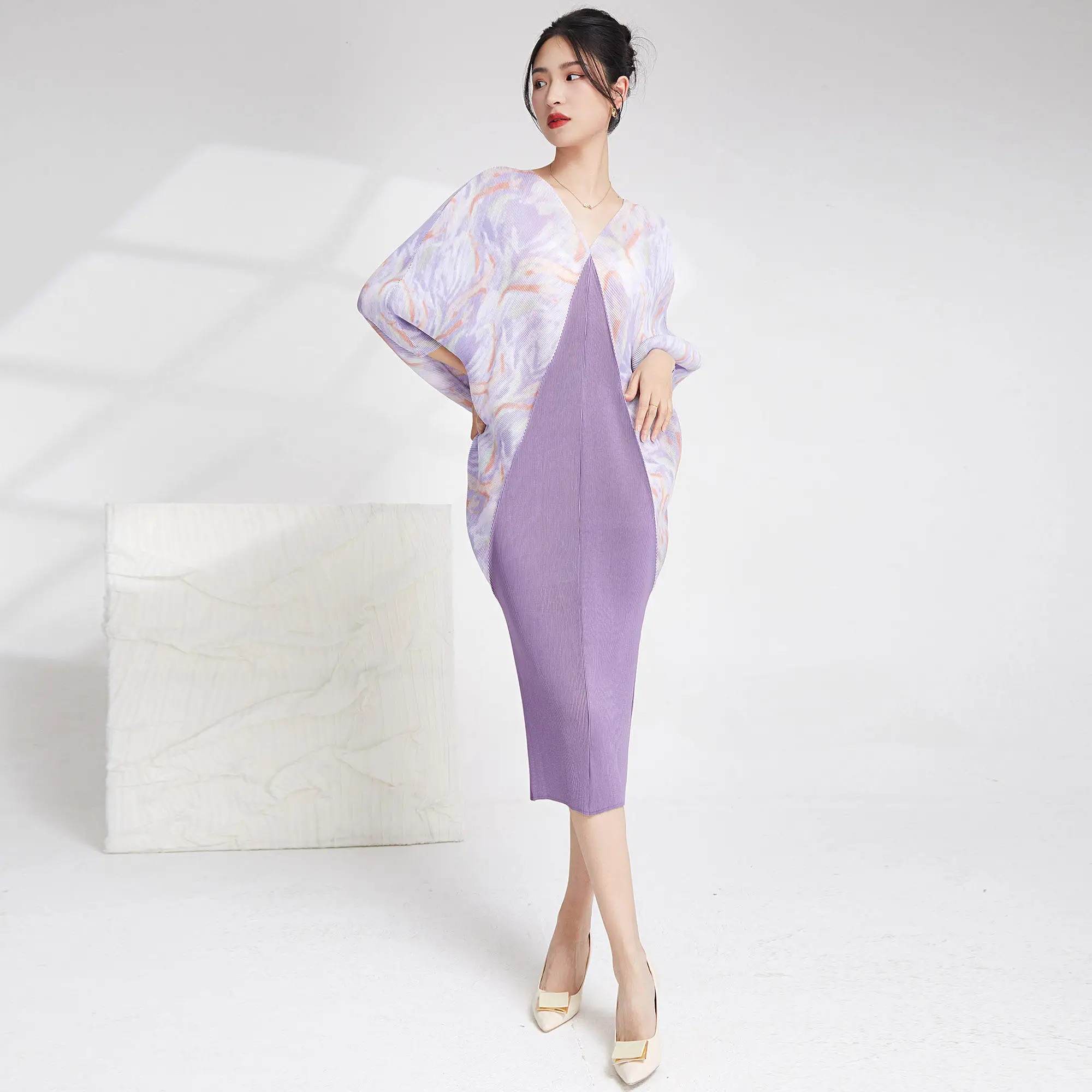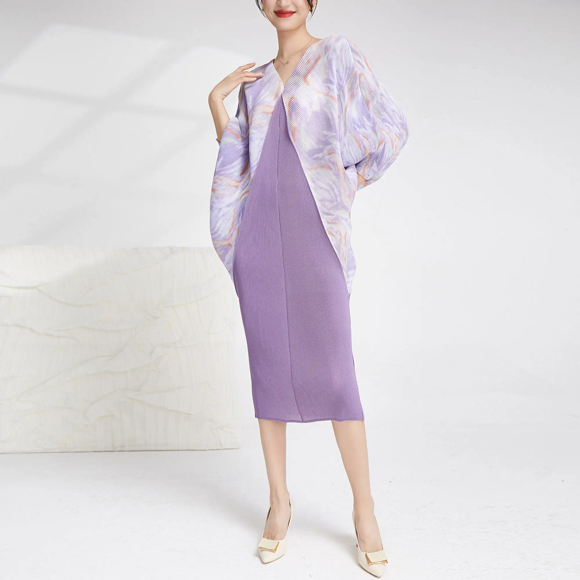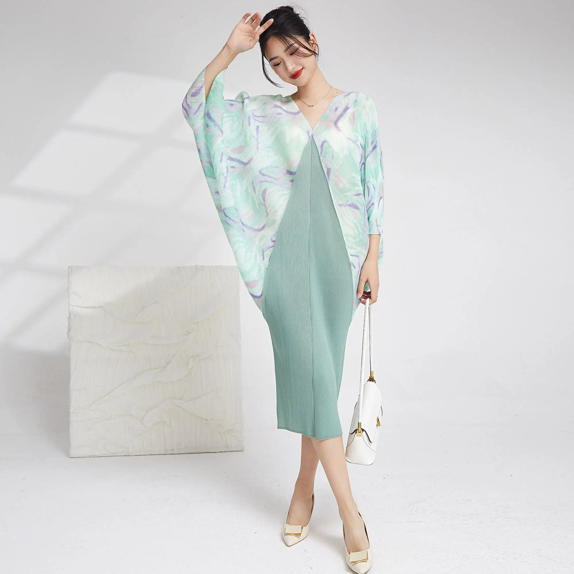 Summer 2025 Casual Style Women's Dress European and American Fashion Long Bat Sleeves Plus Size Miyake Pleated Woven Dress