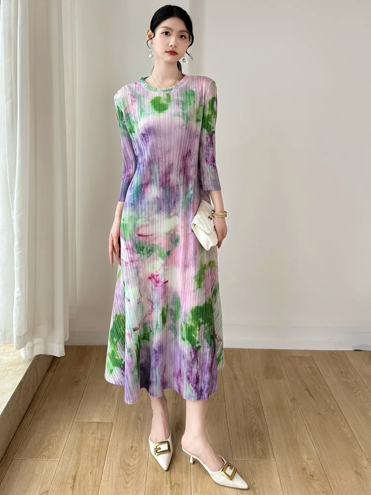 Miyake 2025 Spring Autumn Women's Pleated Dress New Foreign Style Large Size Printed Neck Meat Cover Fashion Age Plus Size Dress