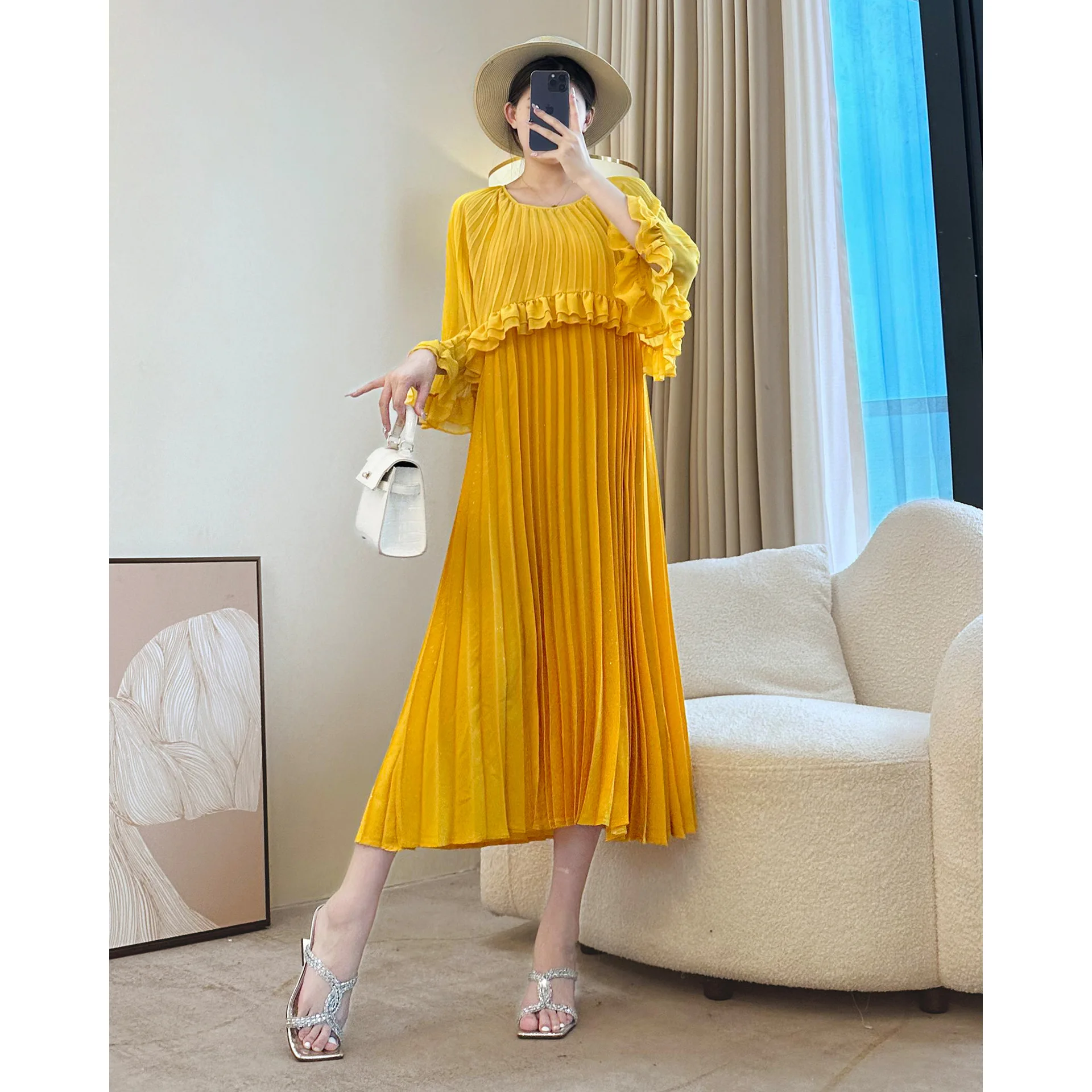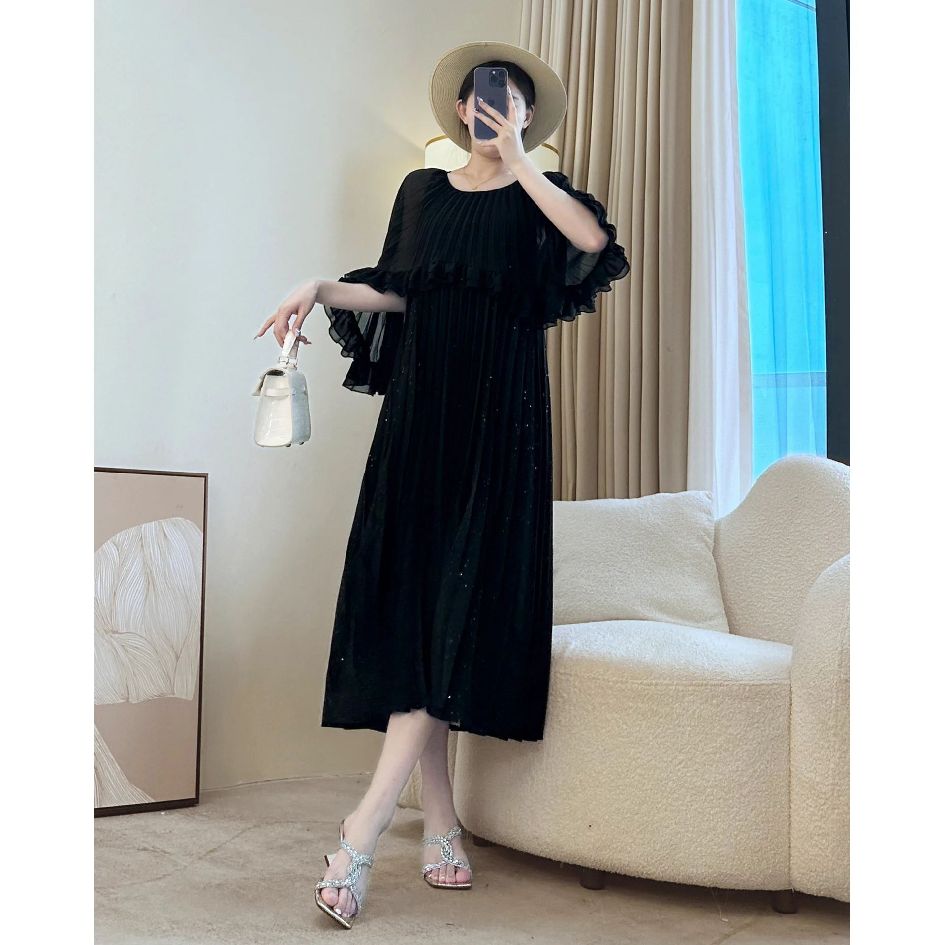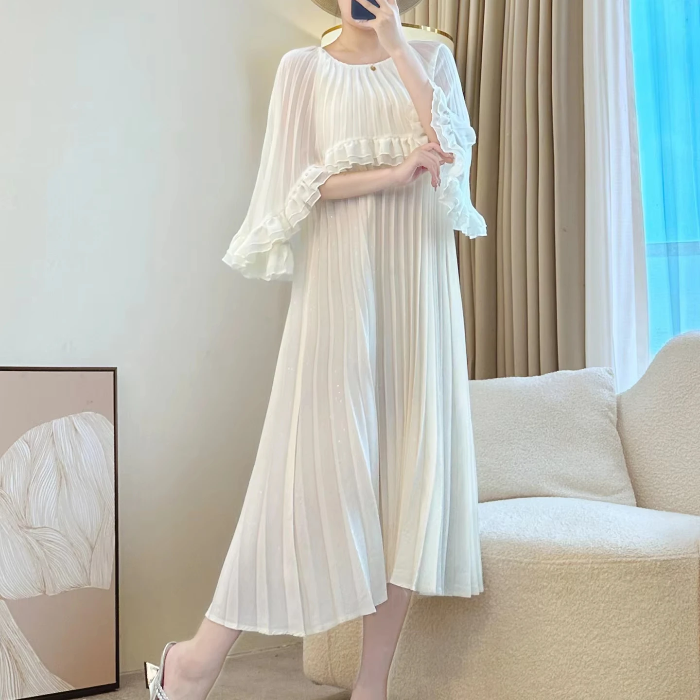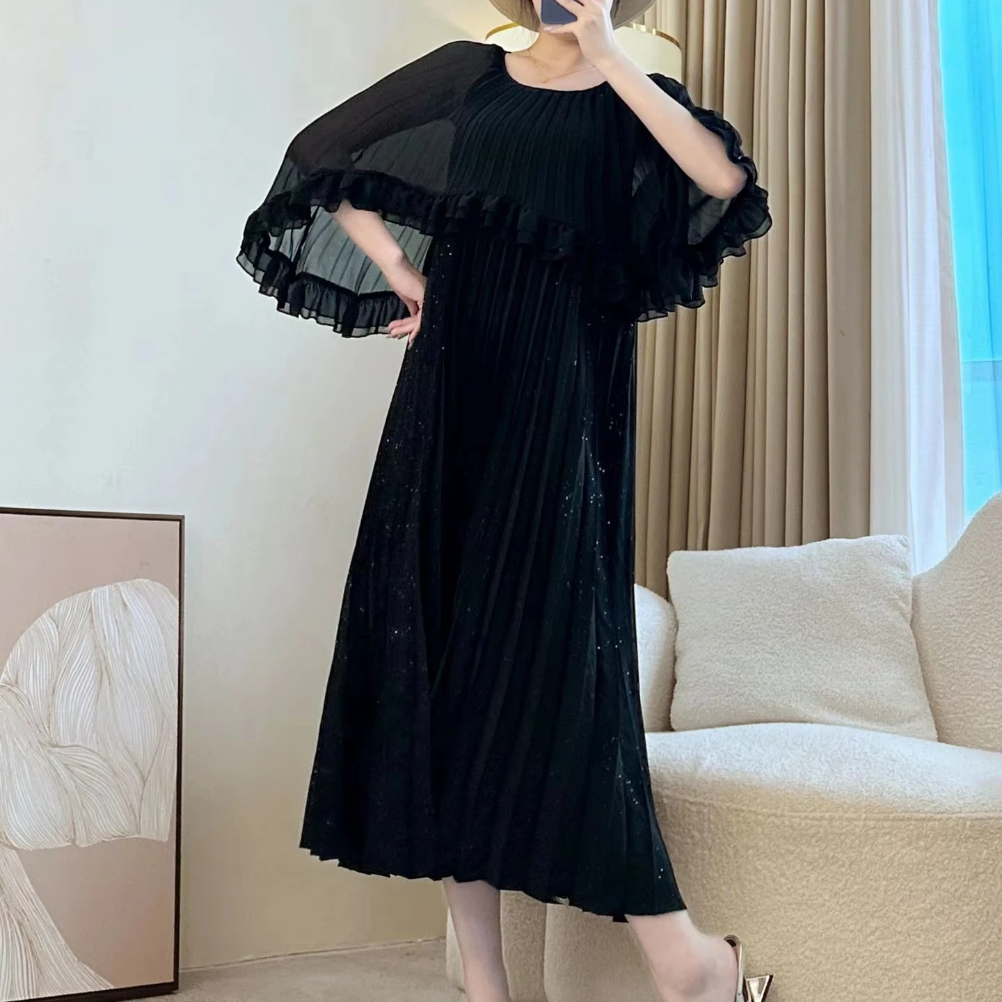 Miyake Pleated Dress Elegant Ruffle Cape Sleeve A-Line Women's Dress Soft & Flowy Design Party & Evening Dress