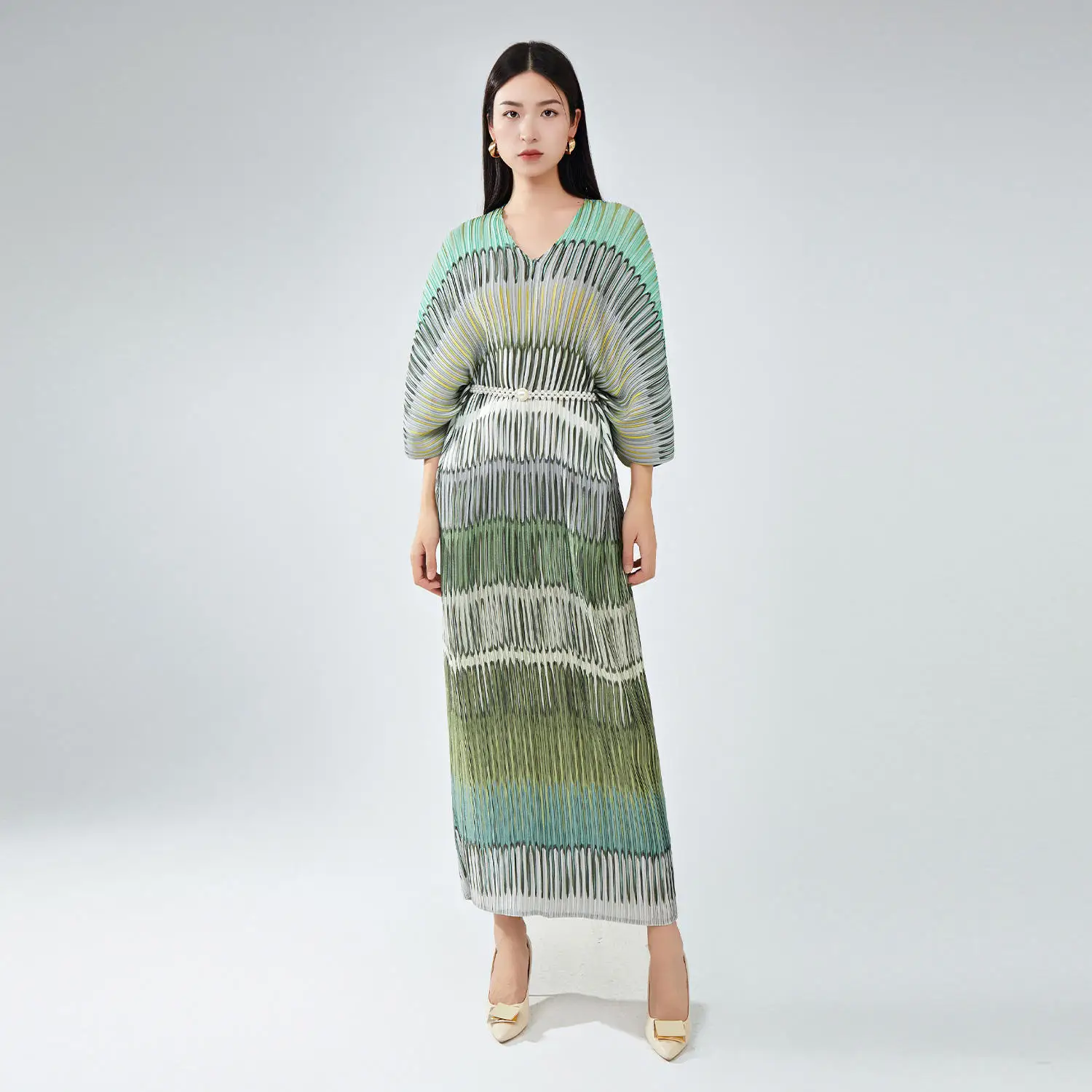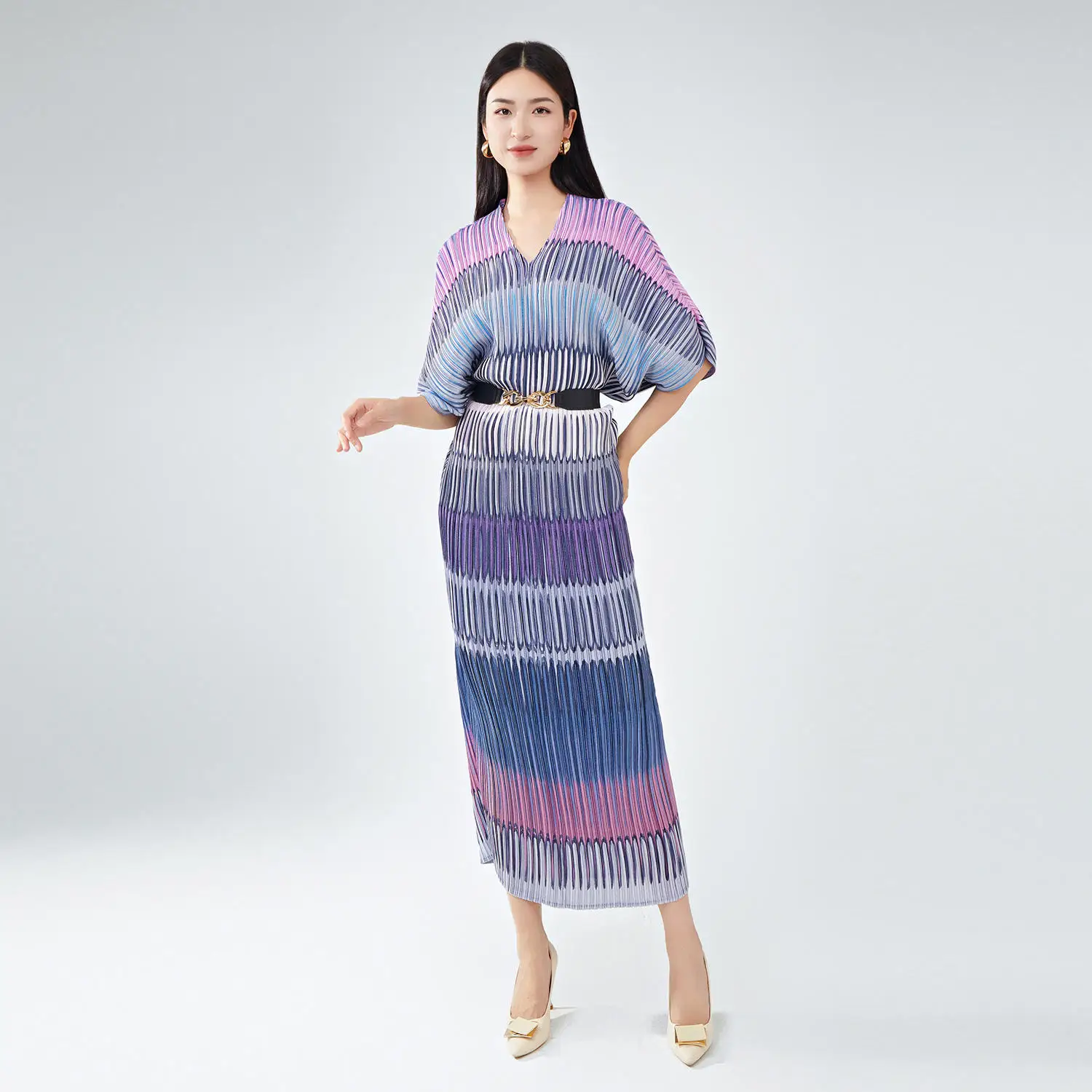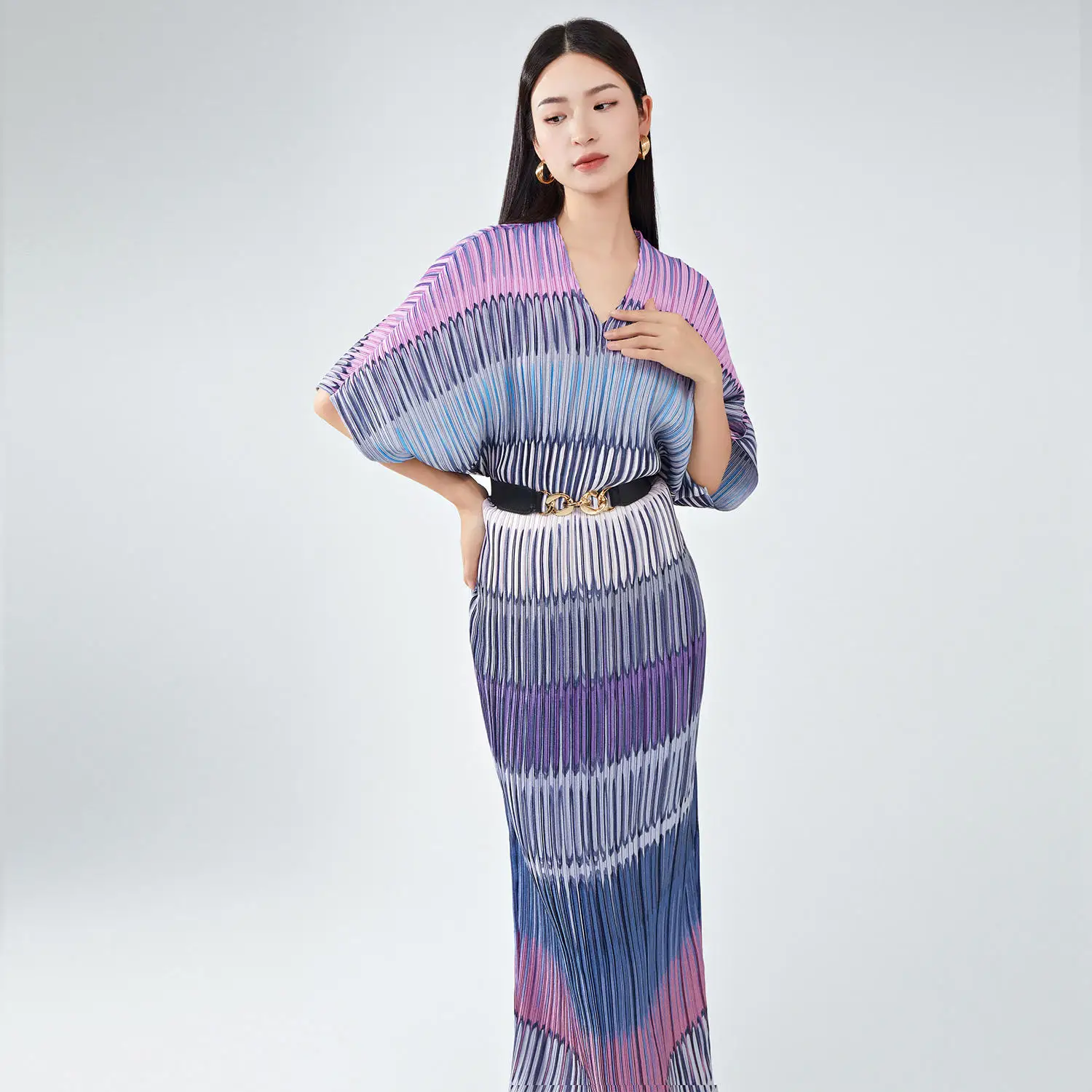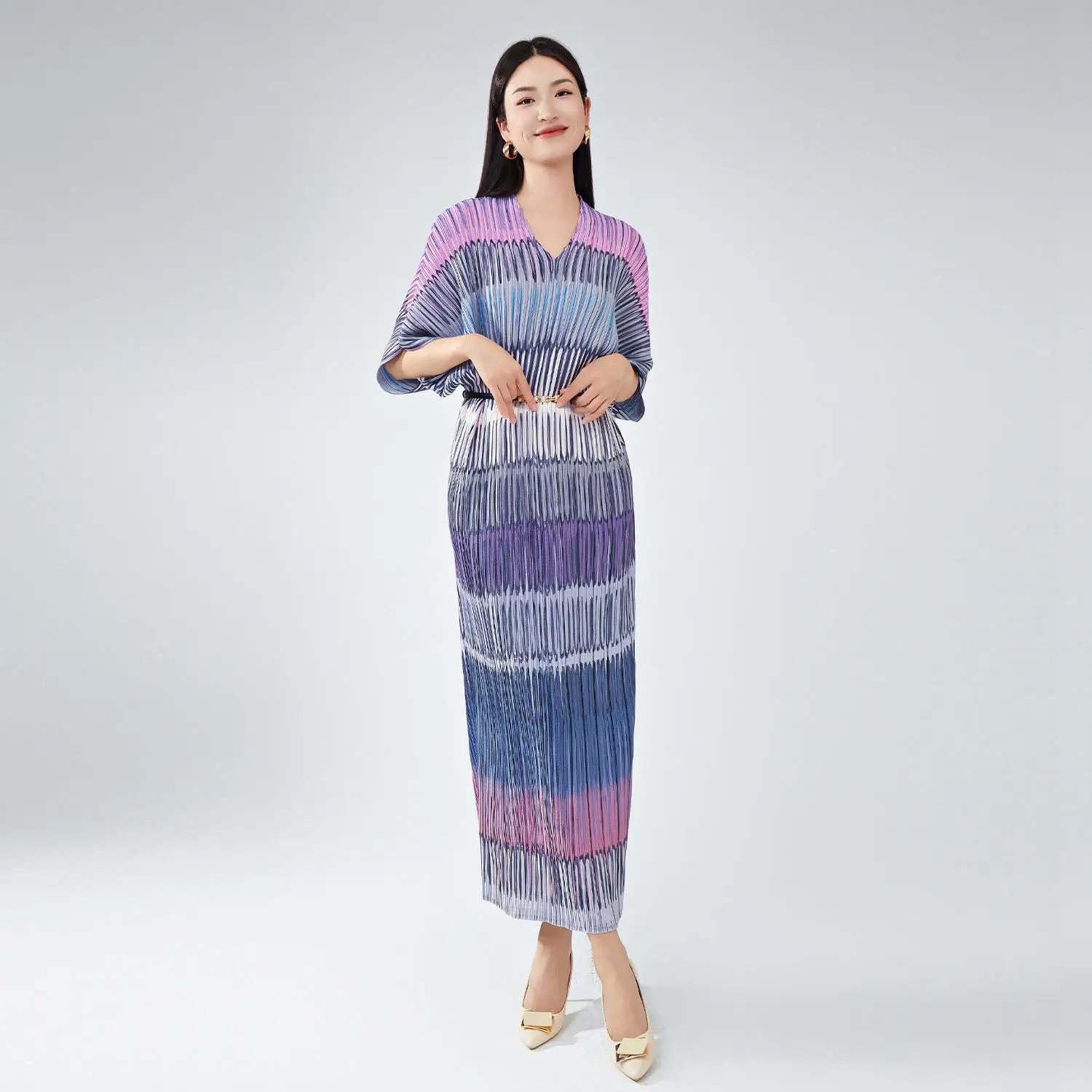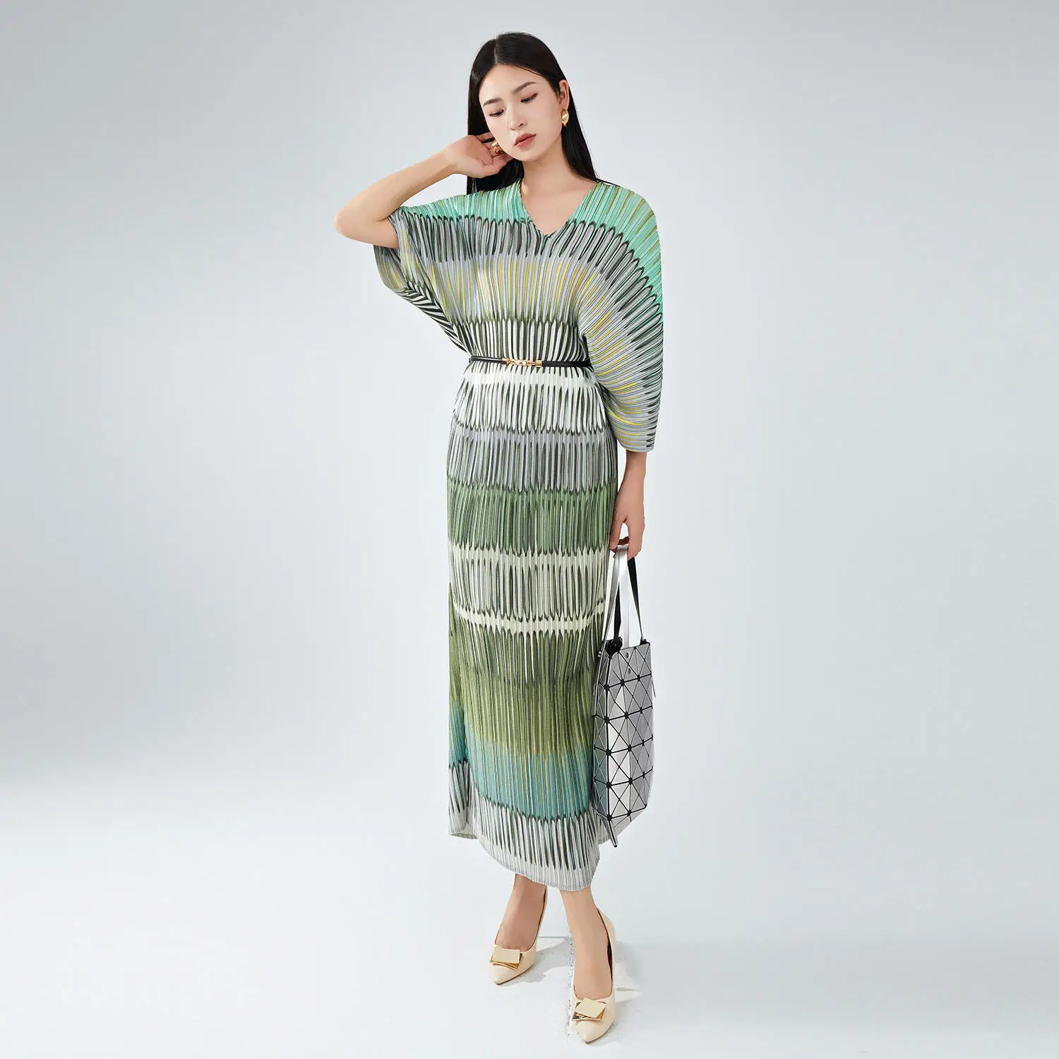 Women's High Quality New Polyester Dress V-Neck Striped Bat Sleeves European and American Styles Loose Miyake Pleated Dress