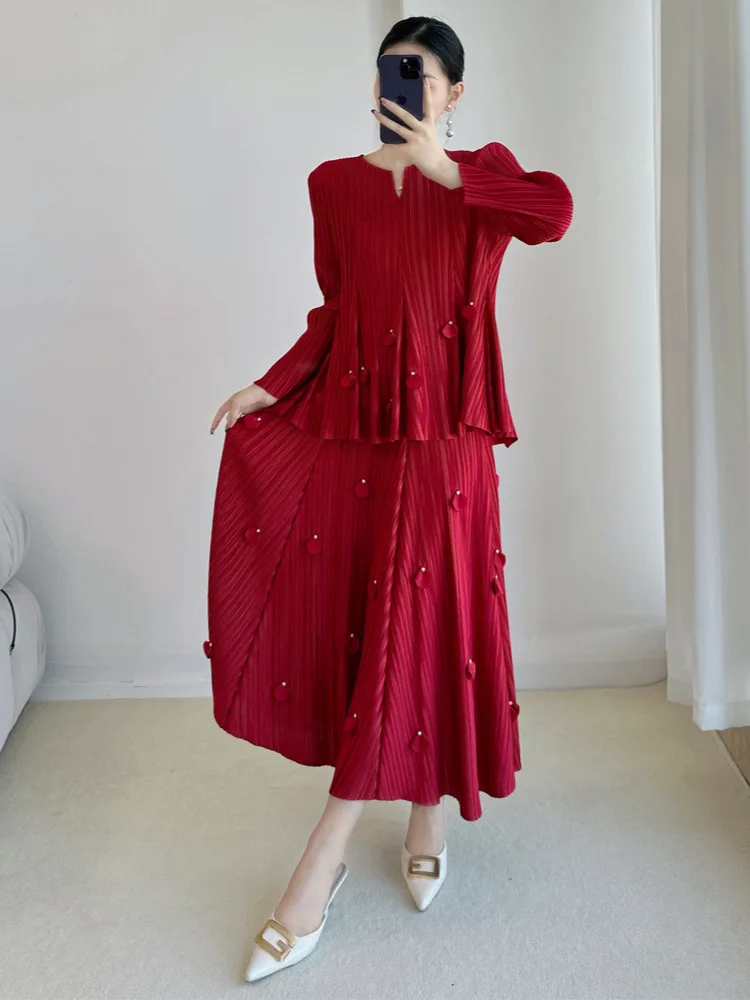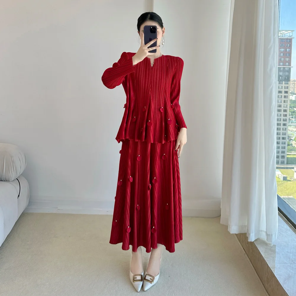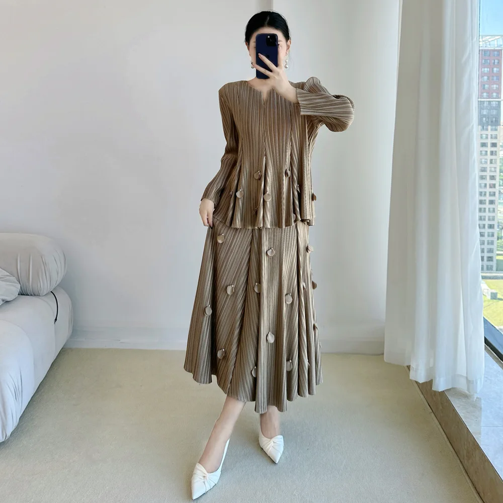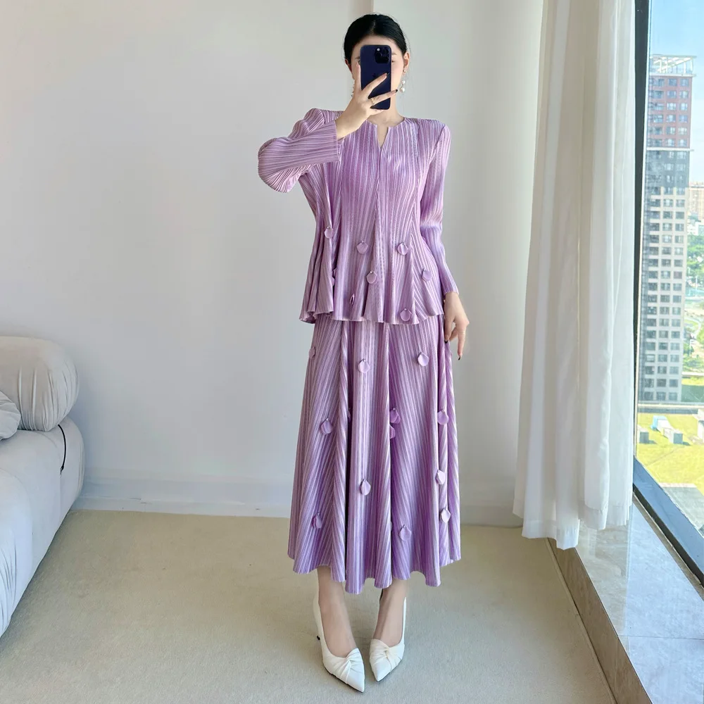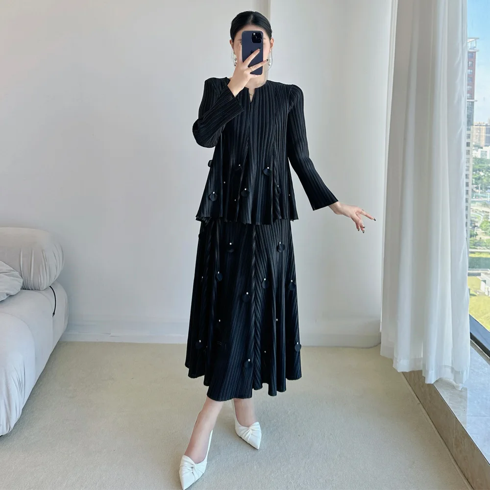 2025 Autumn Collection Miyake Premium Women's Fashion Suit Large Sizes V-Collar Pleated Solid Color Dress