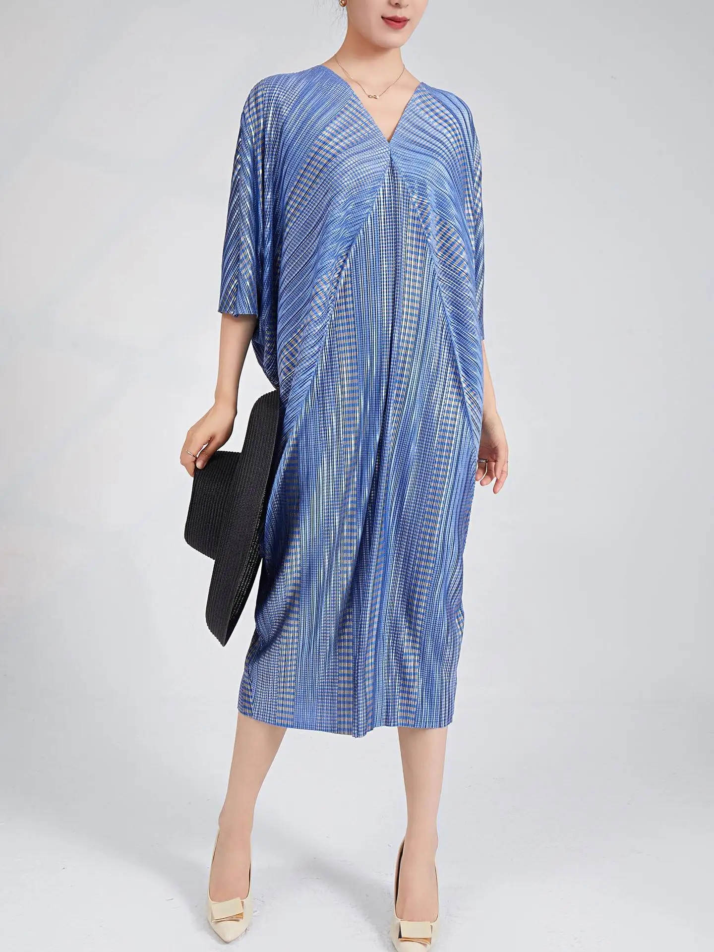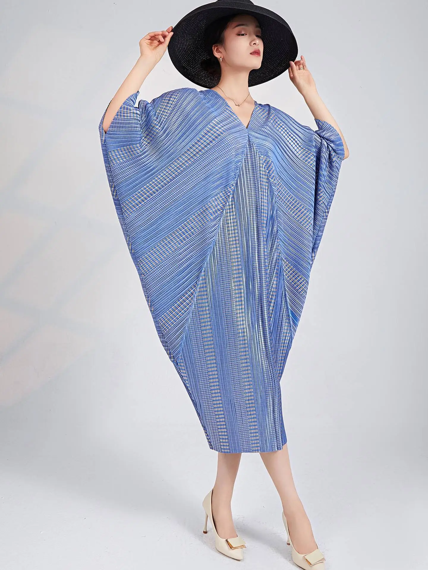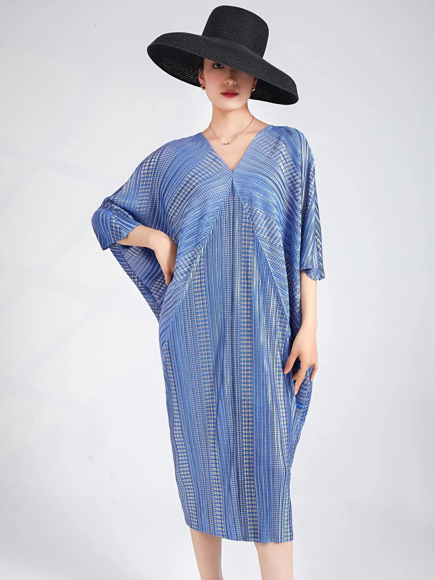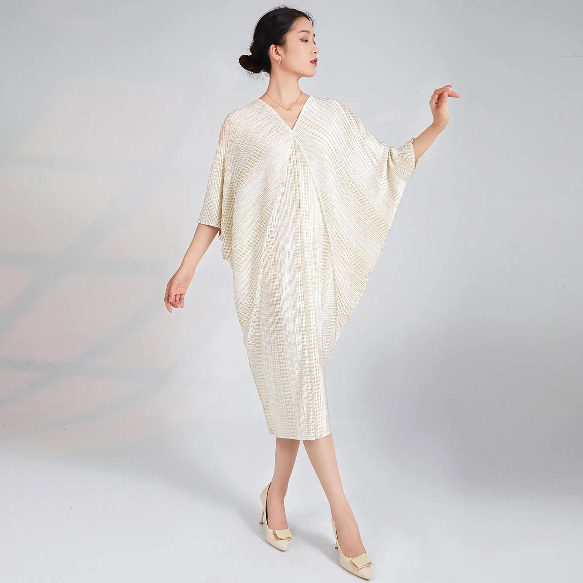 Miyake Pleated Design Fashion V-Neck Bat Sleeve European and American Elegant Plus Size Casual Woman's Dress