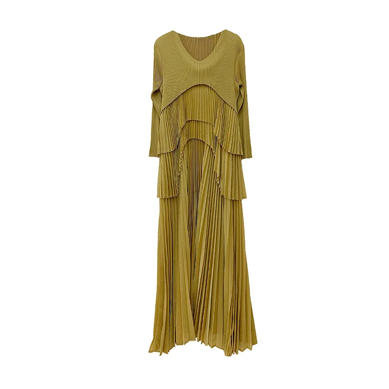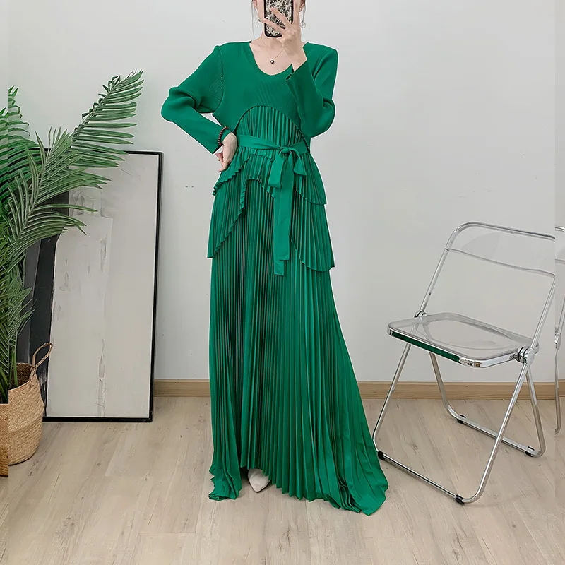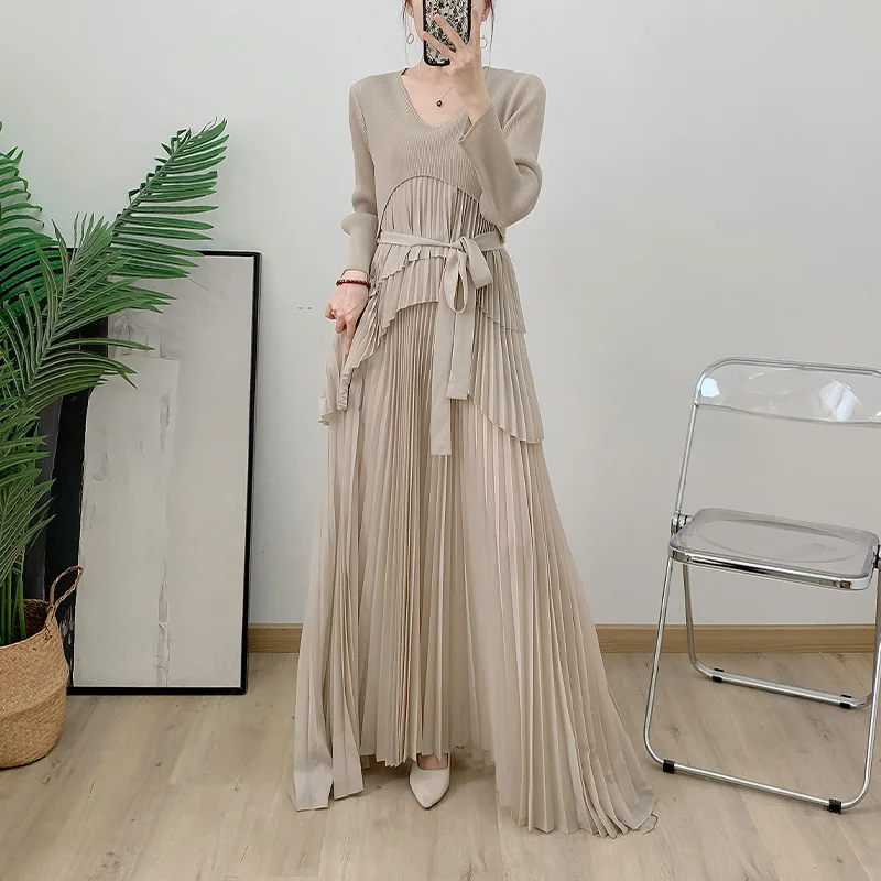 Factory Wholesale Pleated Solid Color Dress for Ladies Long Sleeve Sun Pleated Dress Dubai Lace-up Plus Size Women