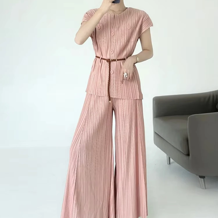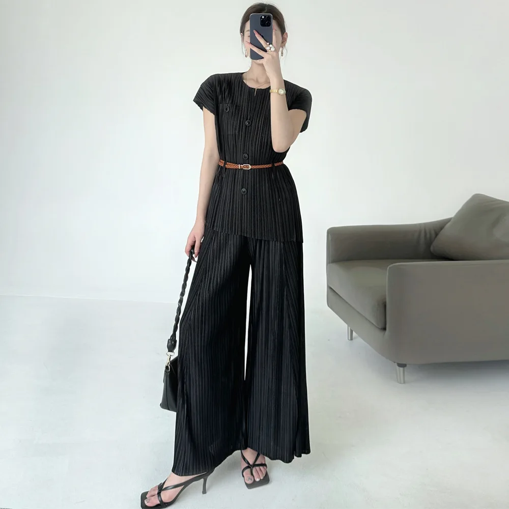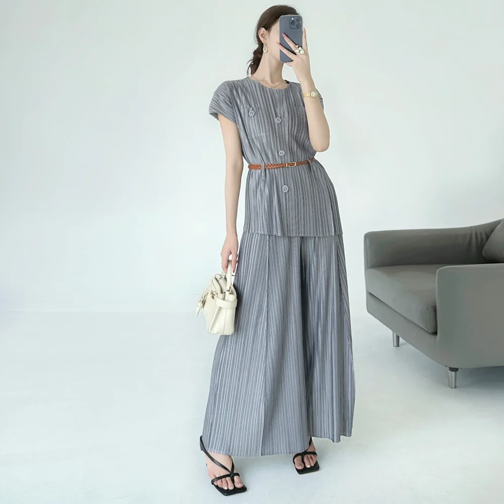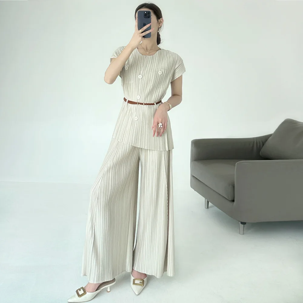 2025 Summer Collection Miyaake Pleats Women's Two-Piece Set in High-Grade Polyester Solid Color Loose Casual Style