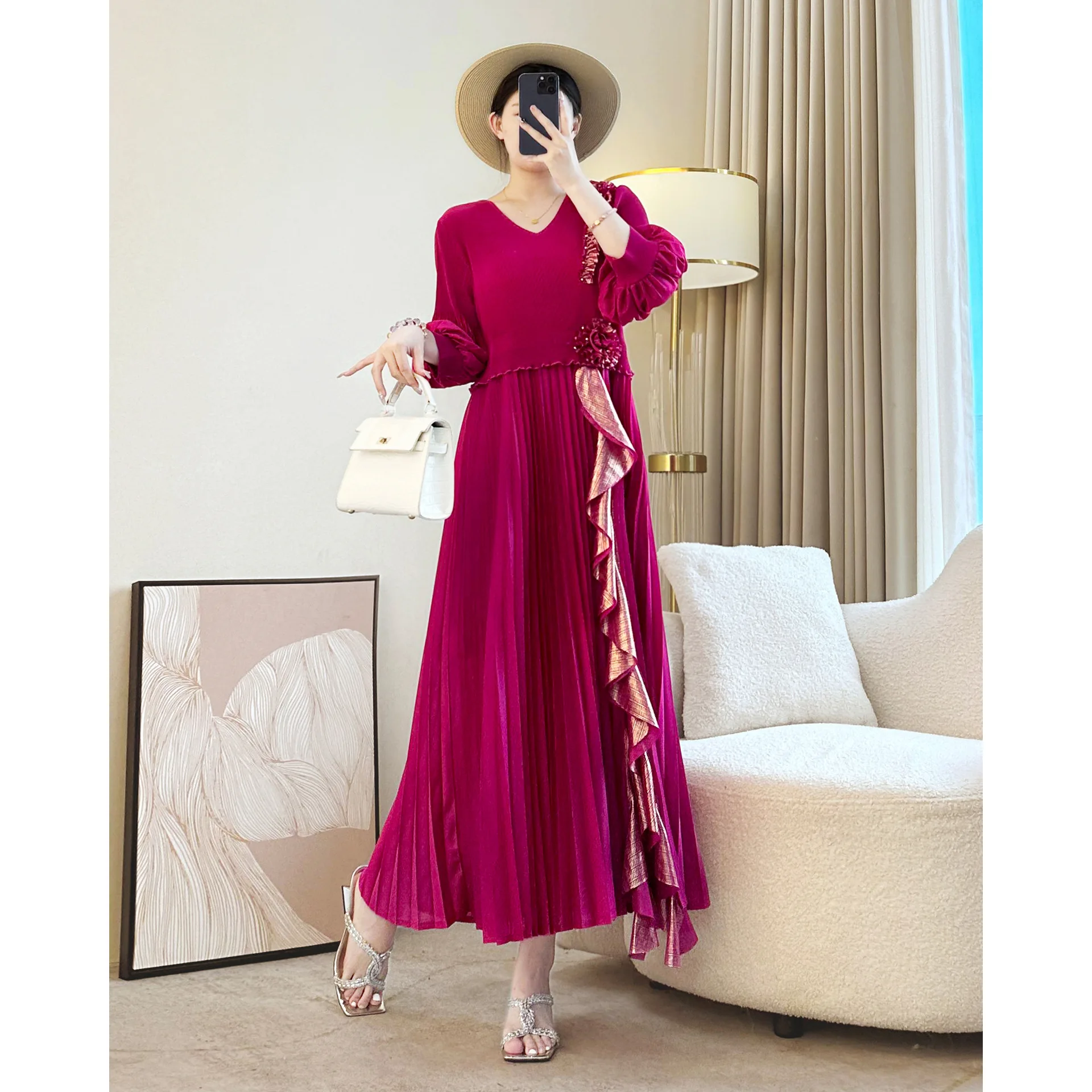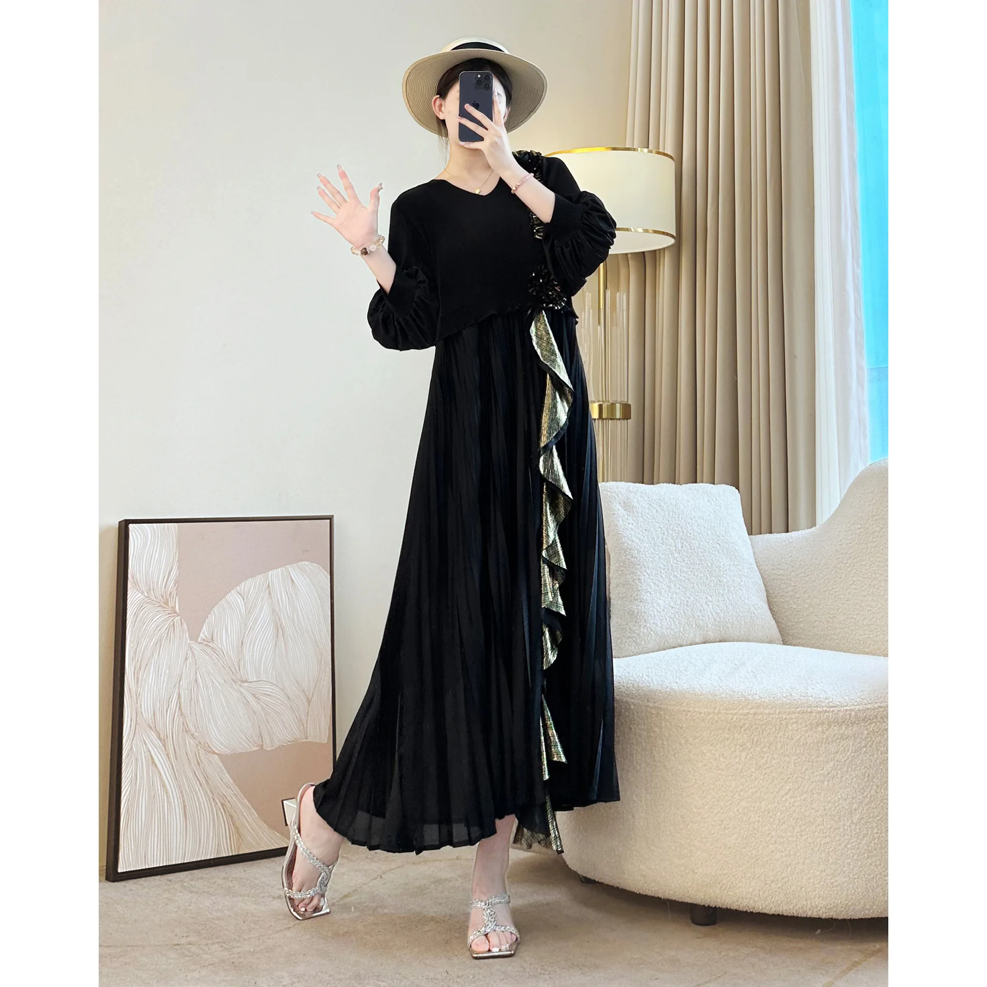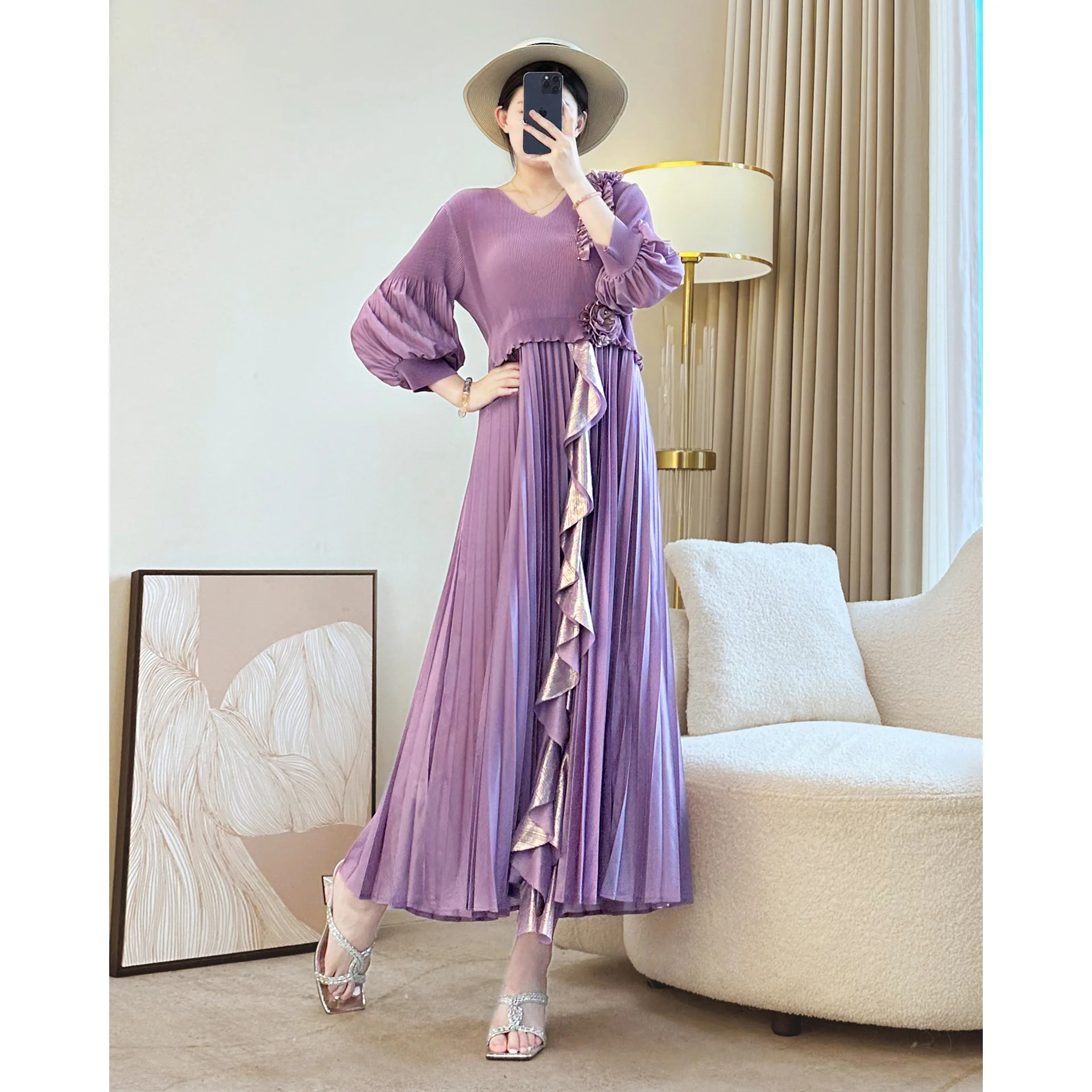 Miyake Elegant Fashion Evening Dress with Pleated V-Neck Lantern Sleeve Long Skirt Side Flounces Casual Dresses