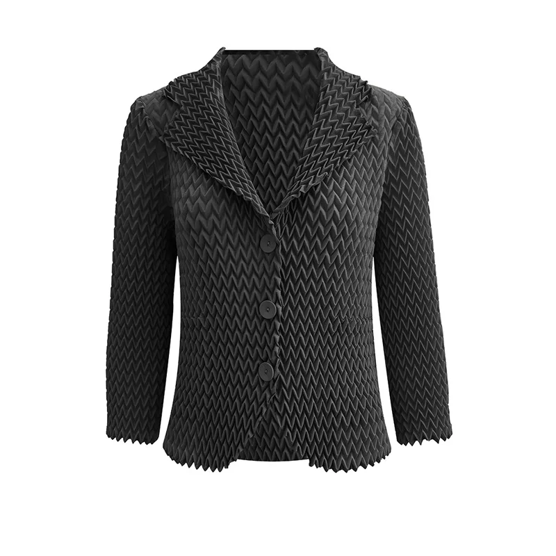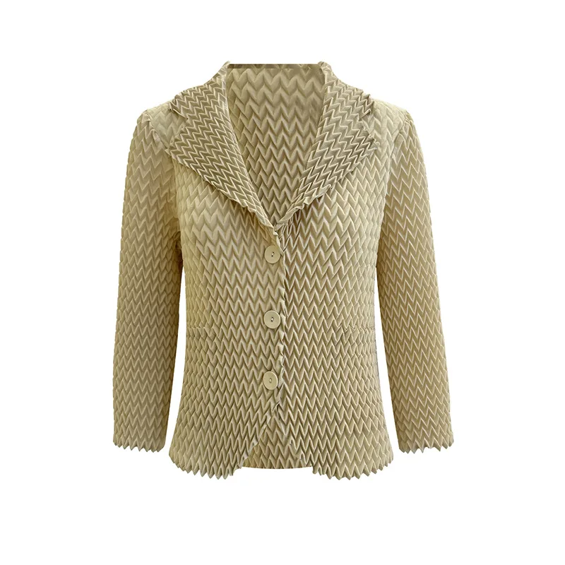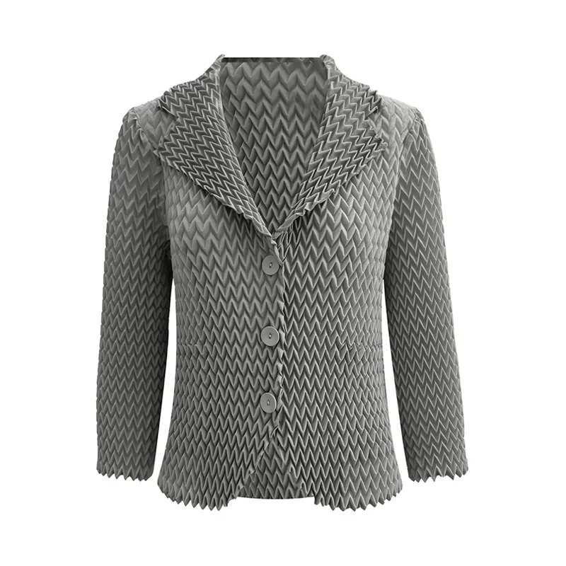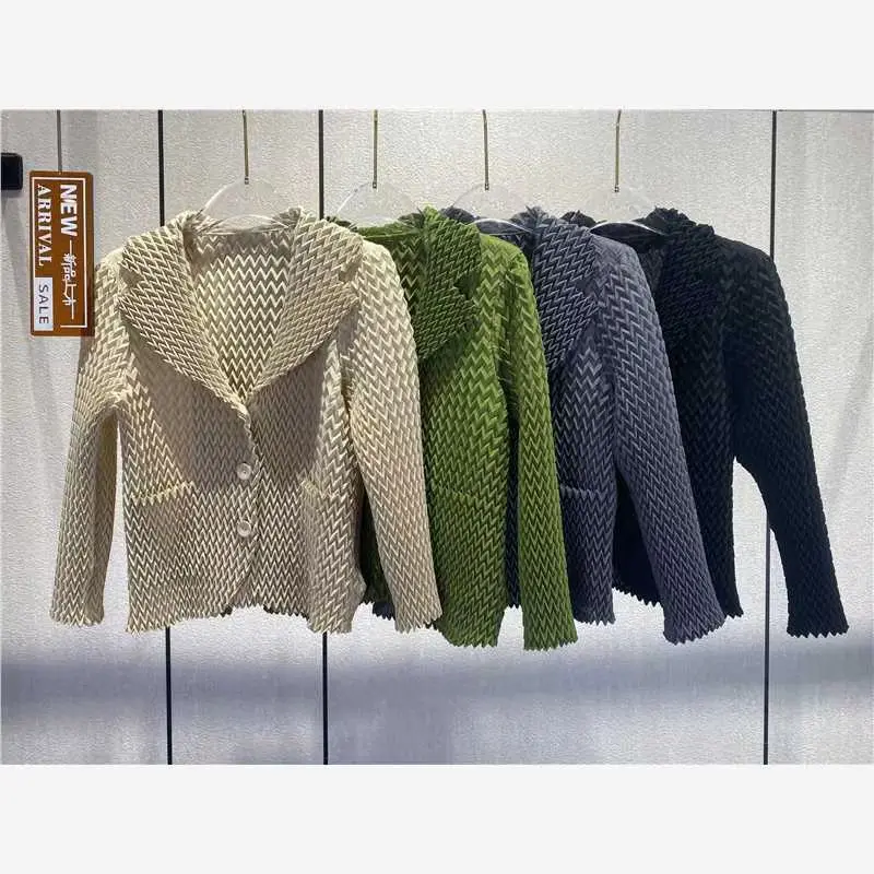 Miyake Pleated Autumn Coat Chic Women Design with Elegant 3D Pleats Blazer Collar and Casual Cardigan Jacket Style