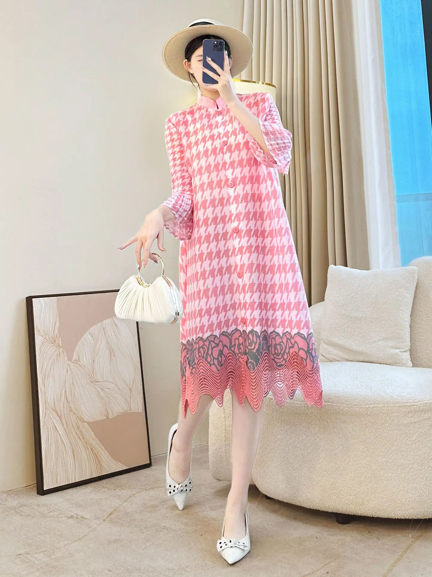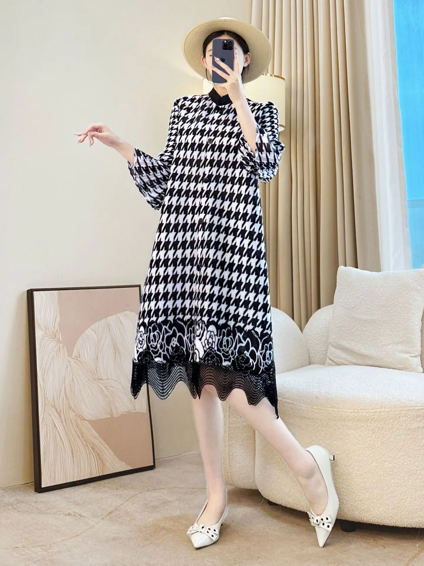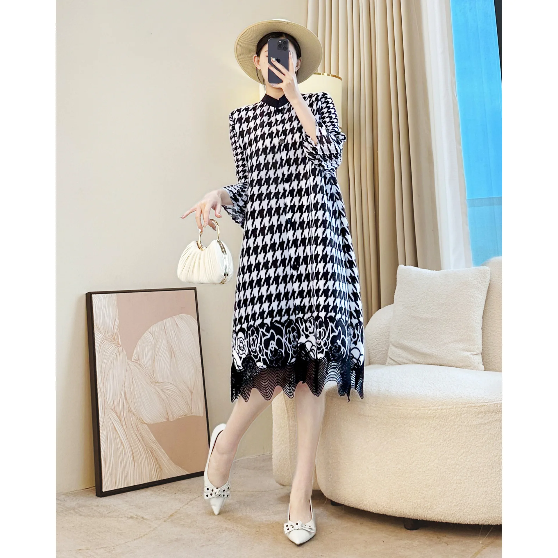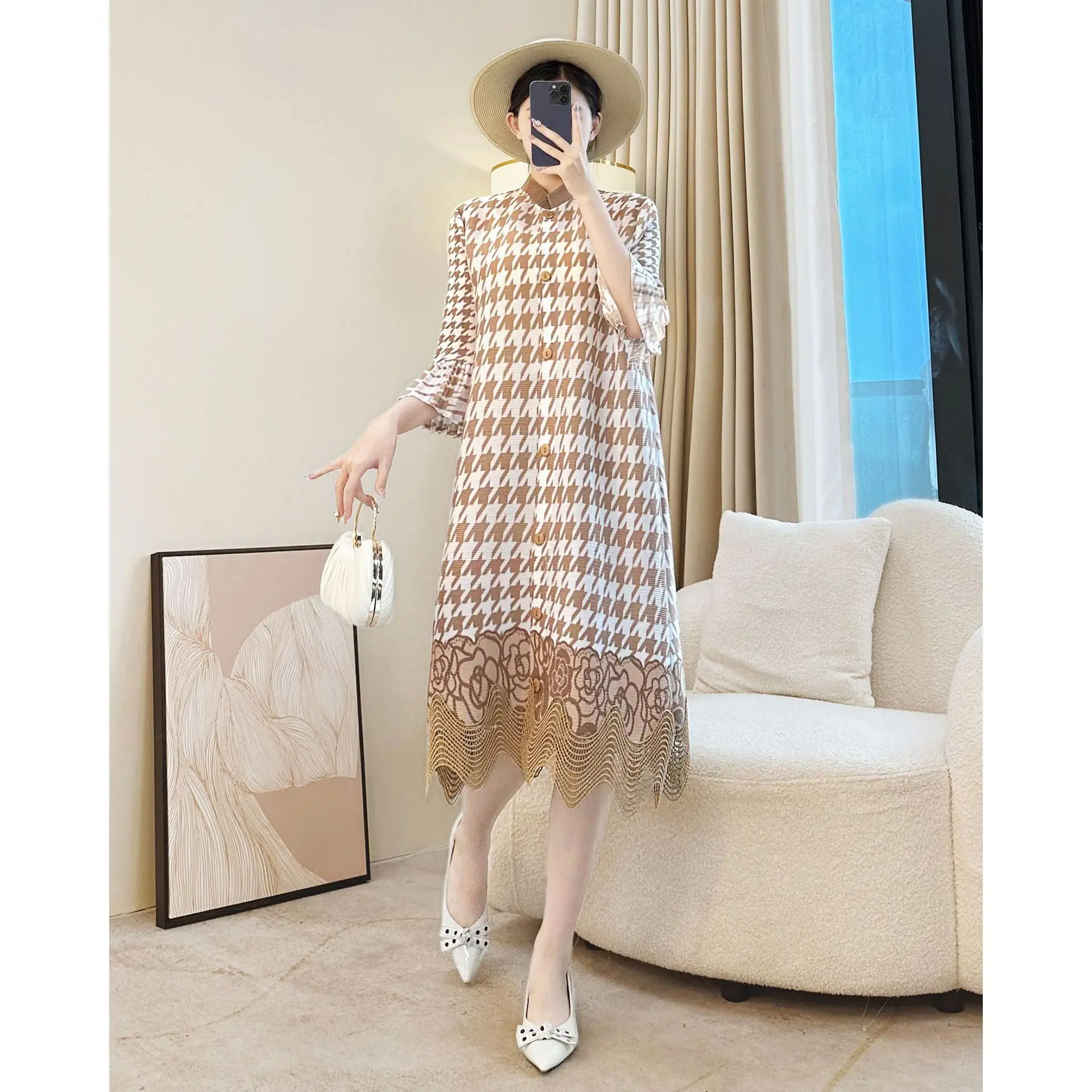 Miyake Pleated Autumn Elegant Loose Plus Size Mid-length Printed Casual Women's Dress
