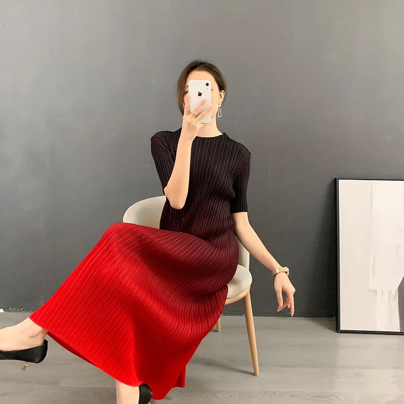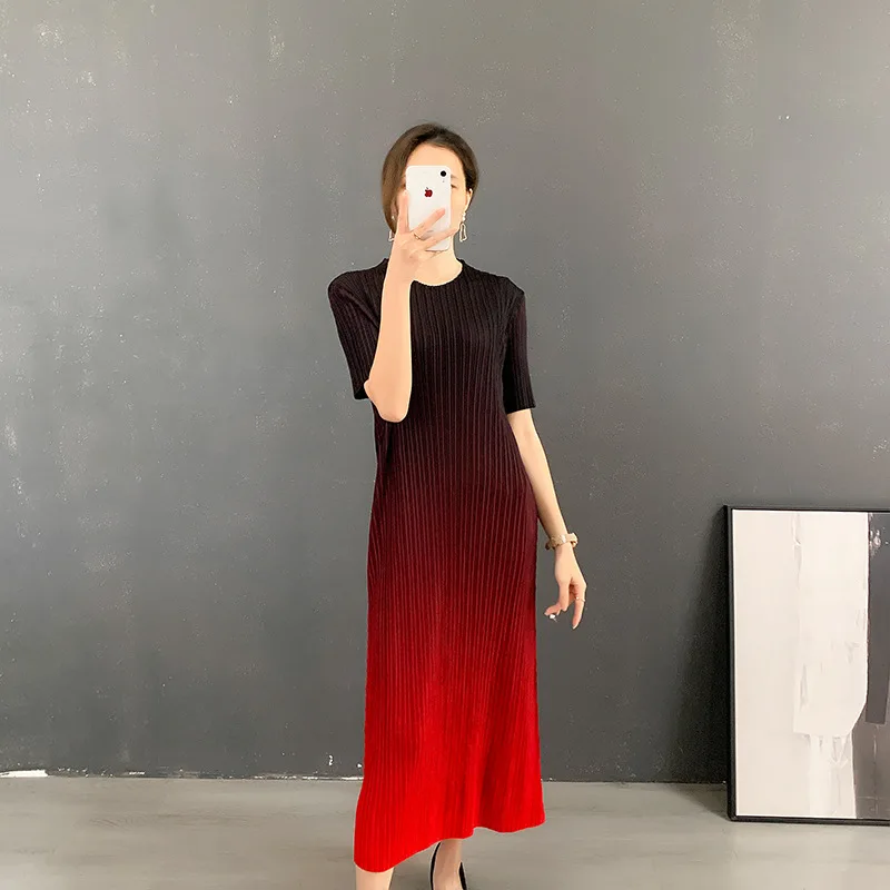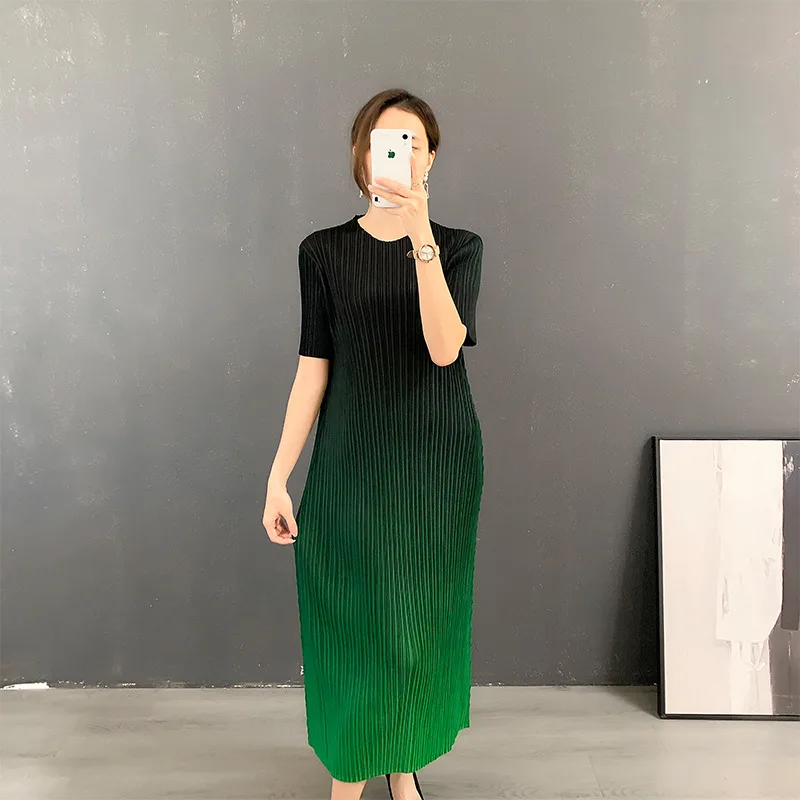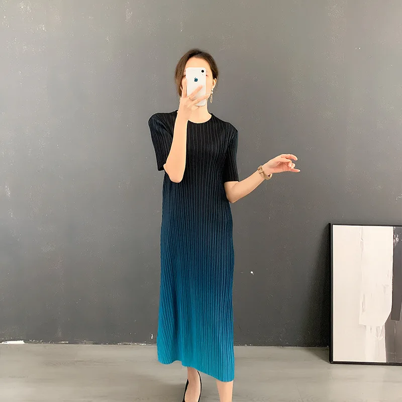 Miyake 2025 Summer New Ladies Dress Round Neck Gradient Pleated Skirt for Women Casual Plus Size Dress