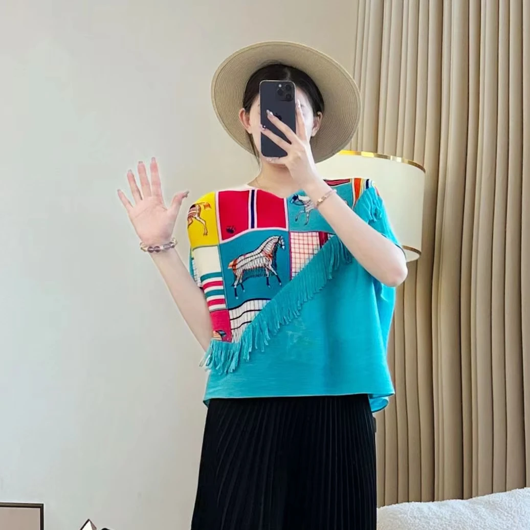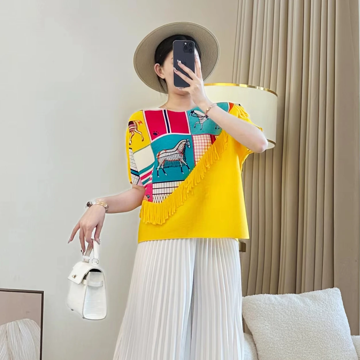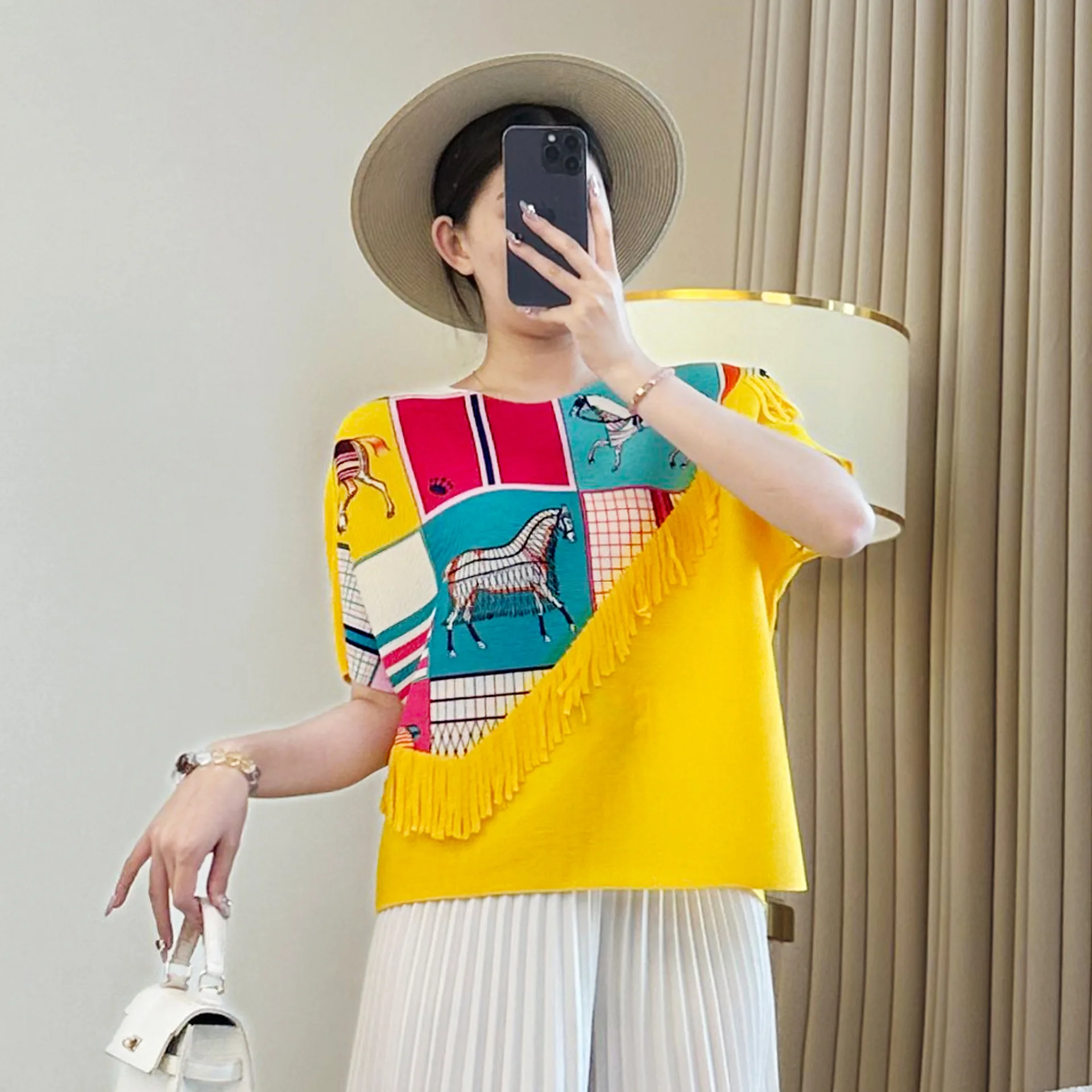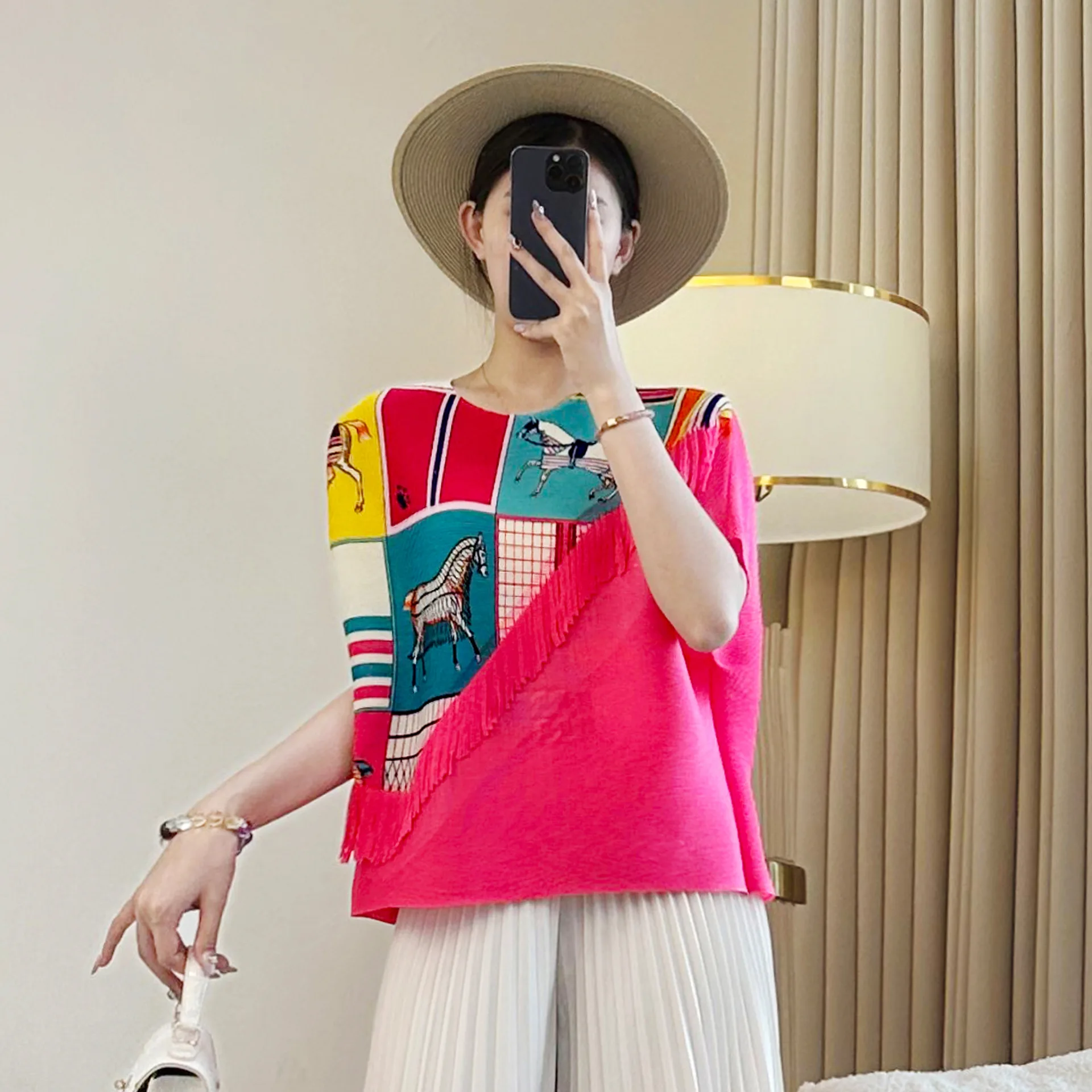 Miyake Women's Short Sleeve Top Spring Summer New Neck Loose Slim Printing Tassel Design Pleated T-Shirt Factory Wholesale