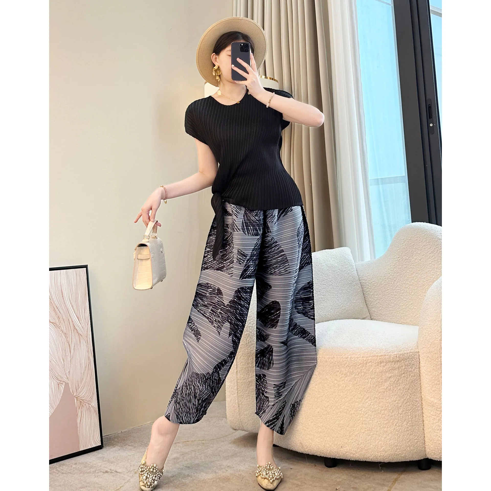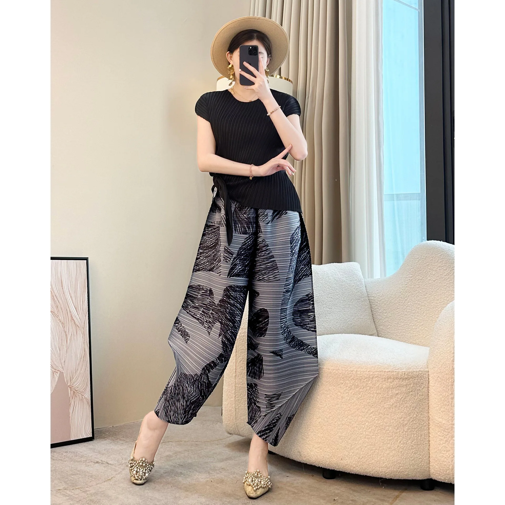 Miyake Pleated 2025 New Summer Ninth Pants Loose Plus Size Harem Pants for Women