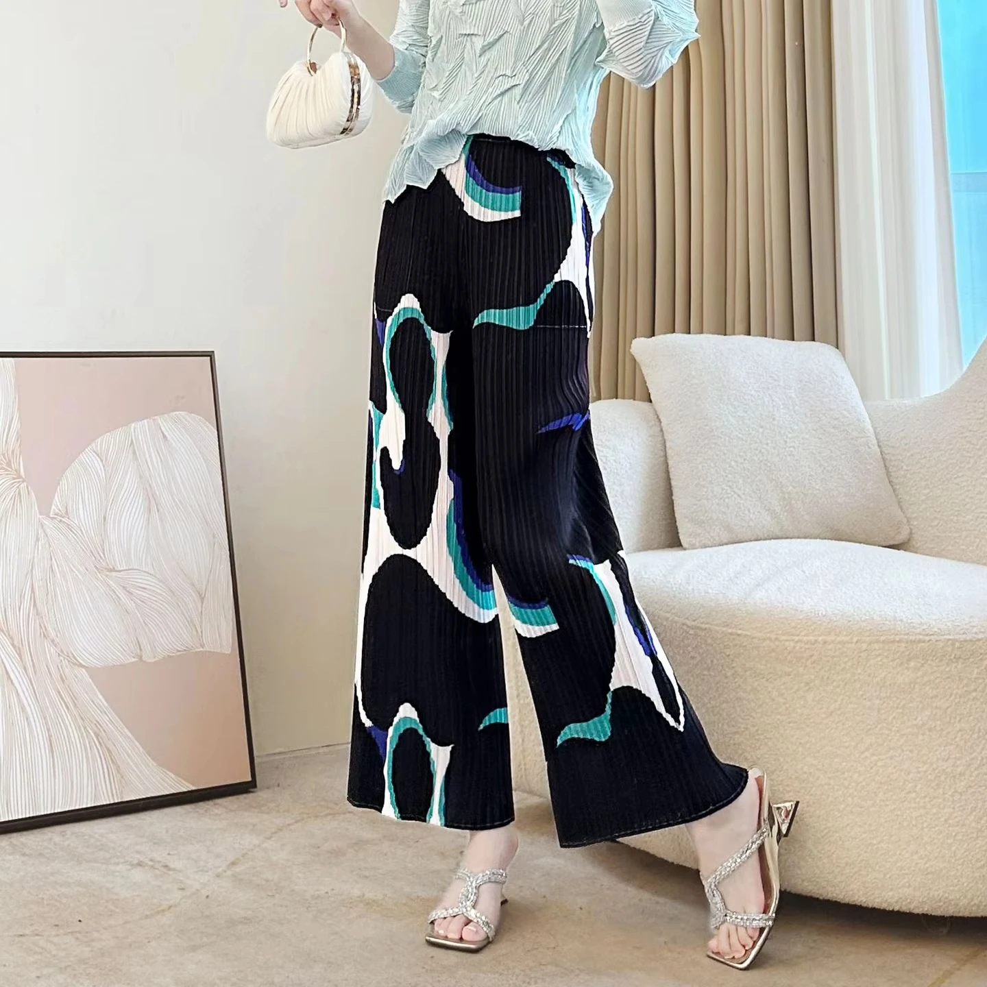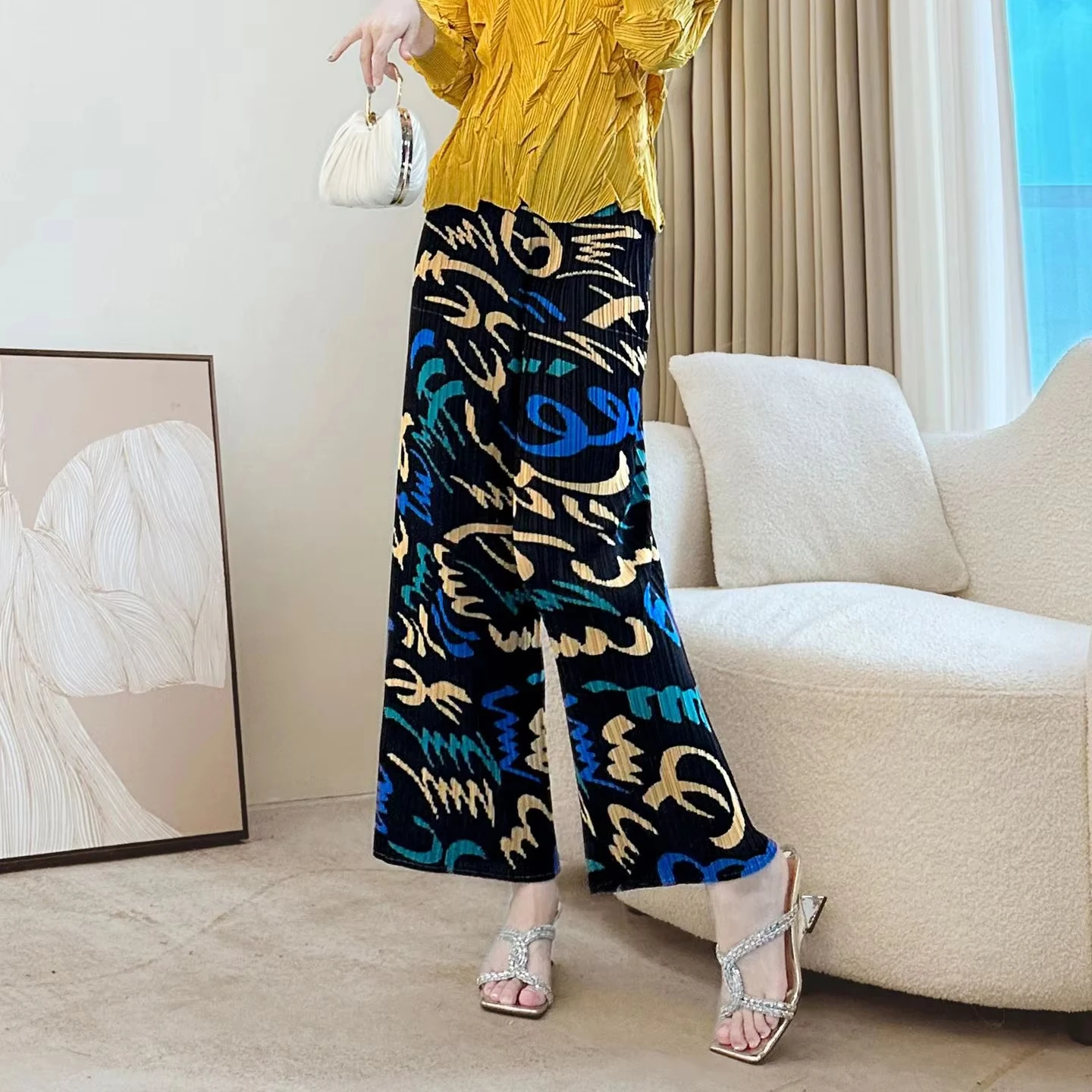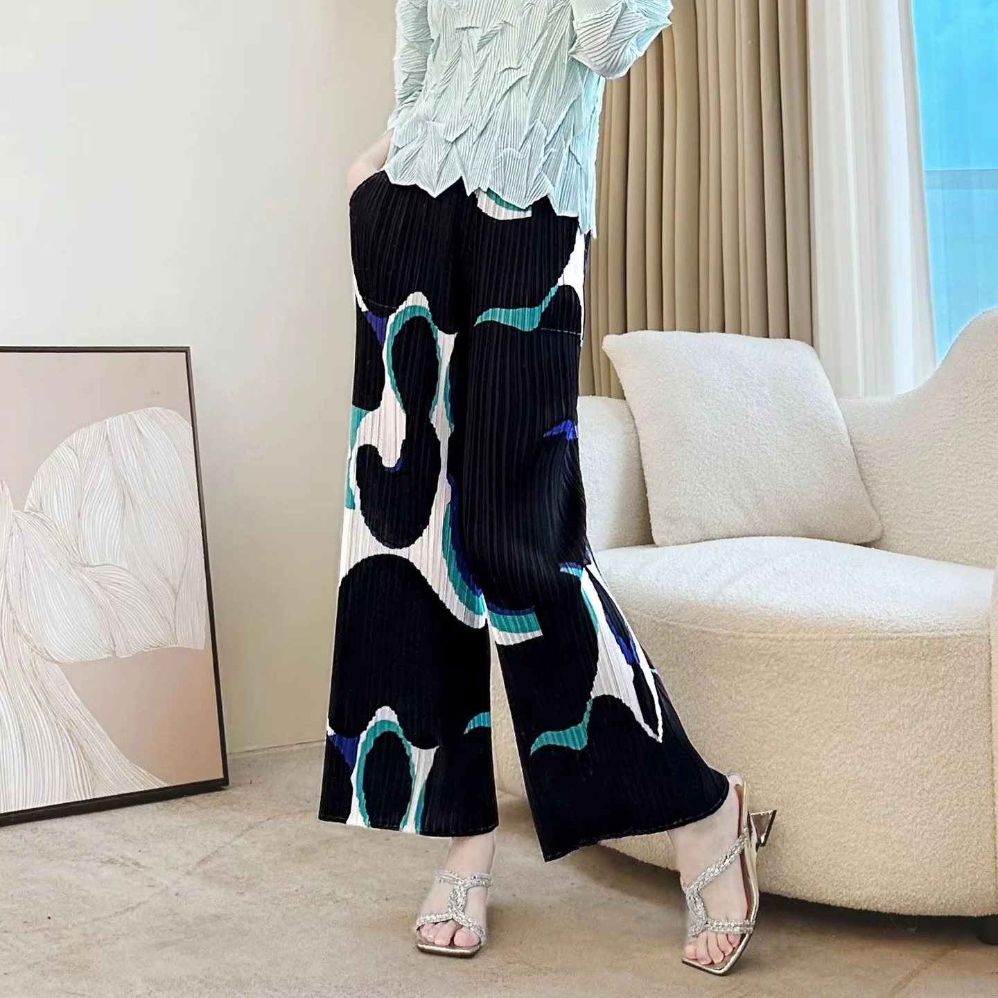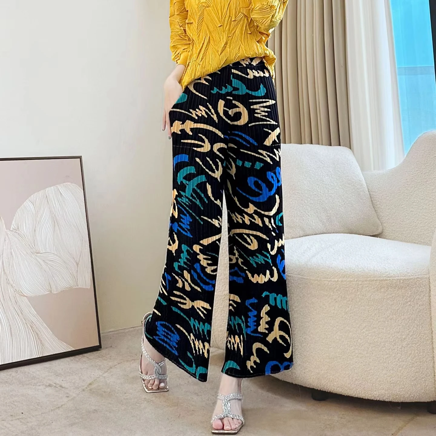 Women's Artistic Print Pleated Wide-Leg Pants - Loose Casual Trousers with Stylish Pattern