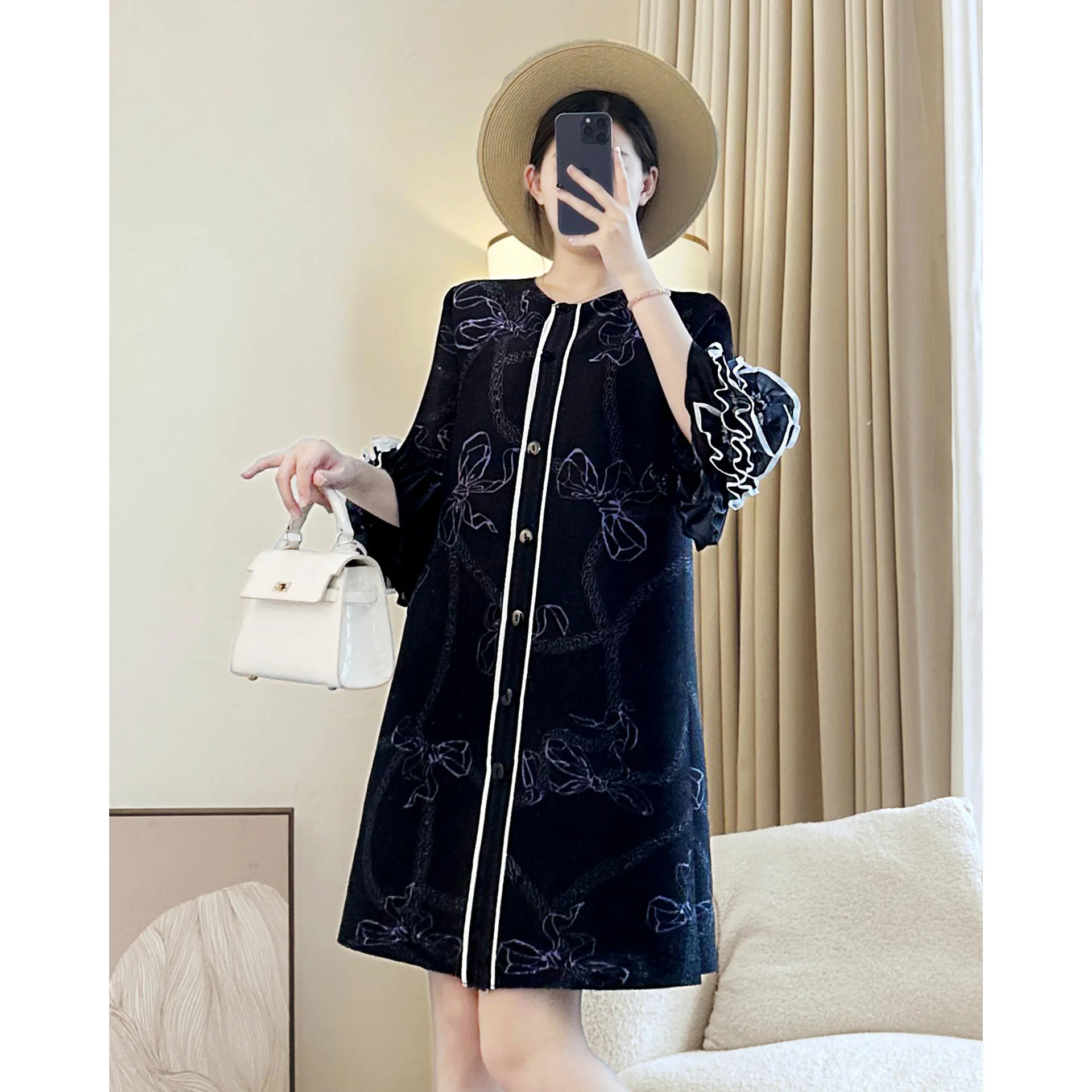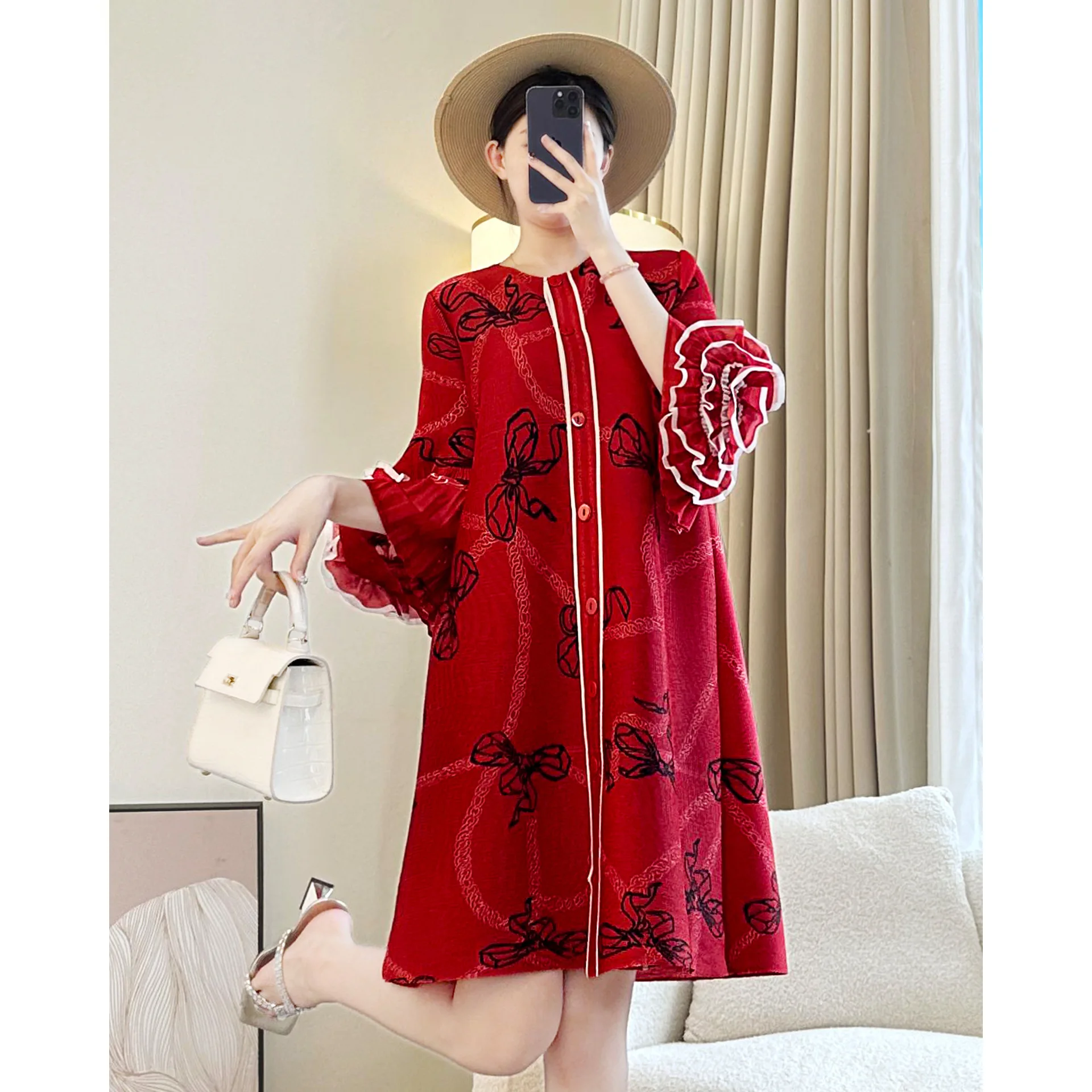 Factory Wholesale High-End Elegant Printed Flared Sleeve Design Loose Large-Sized Pleated Dress for Women