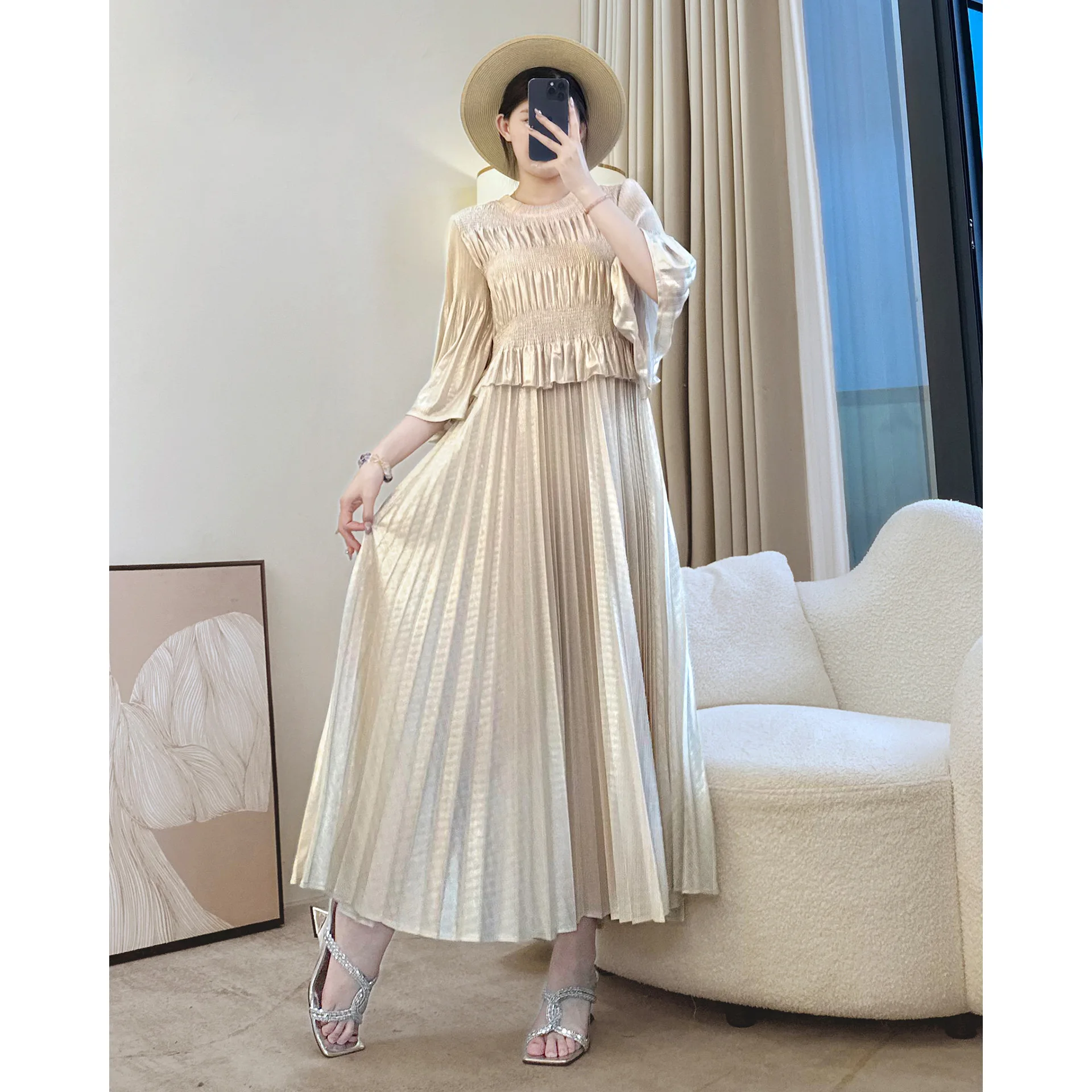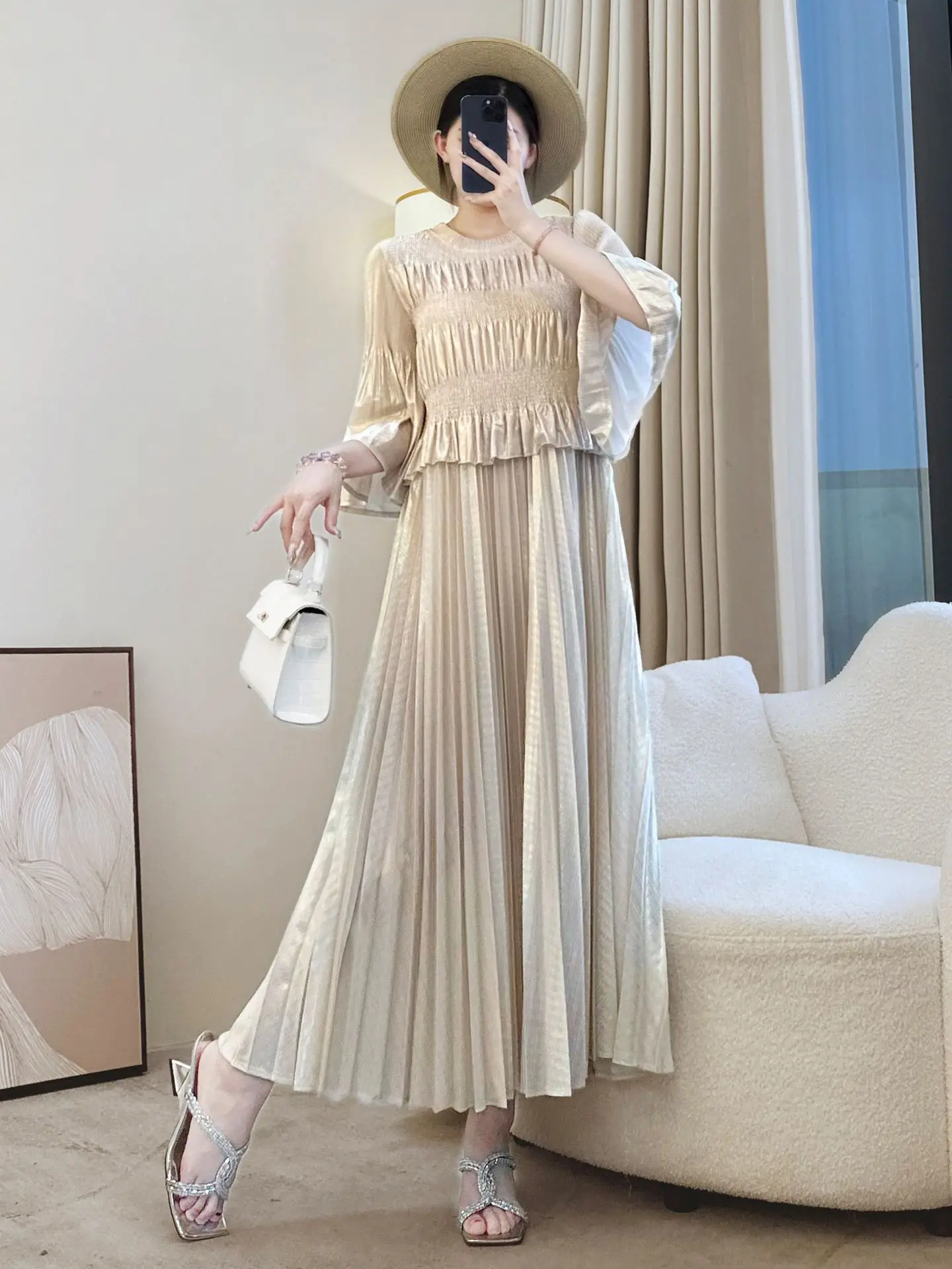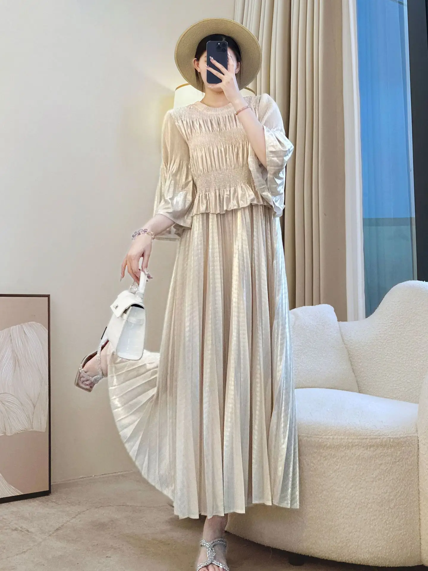 2025 Summer New Pleated Casual Dress Plus Size Loose Style Solid Pattern Women's Dress