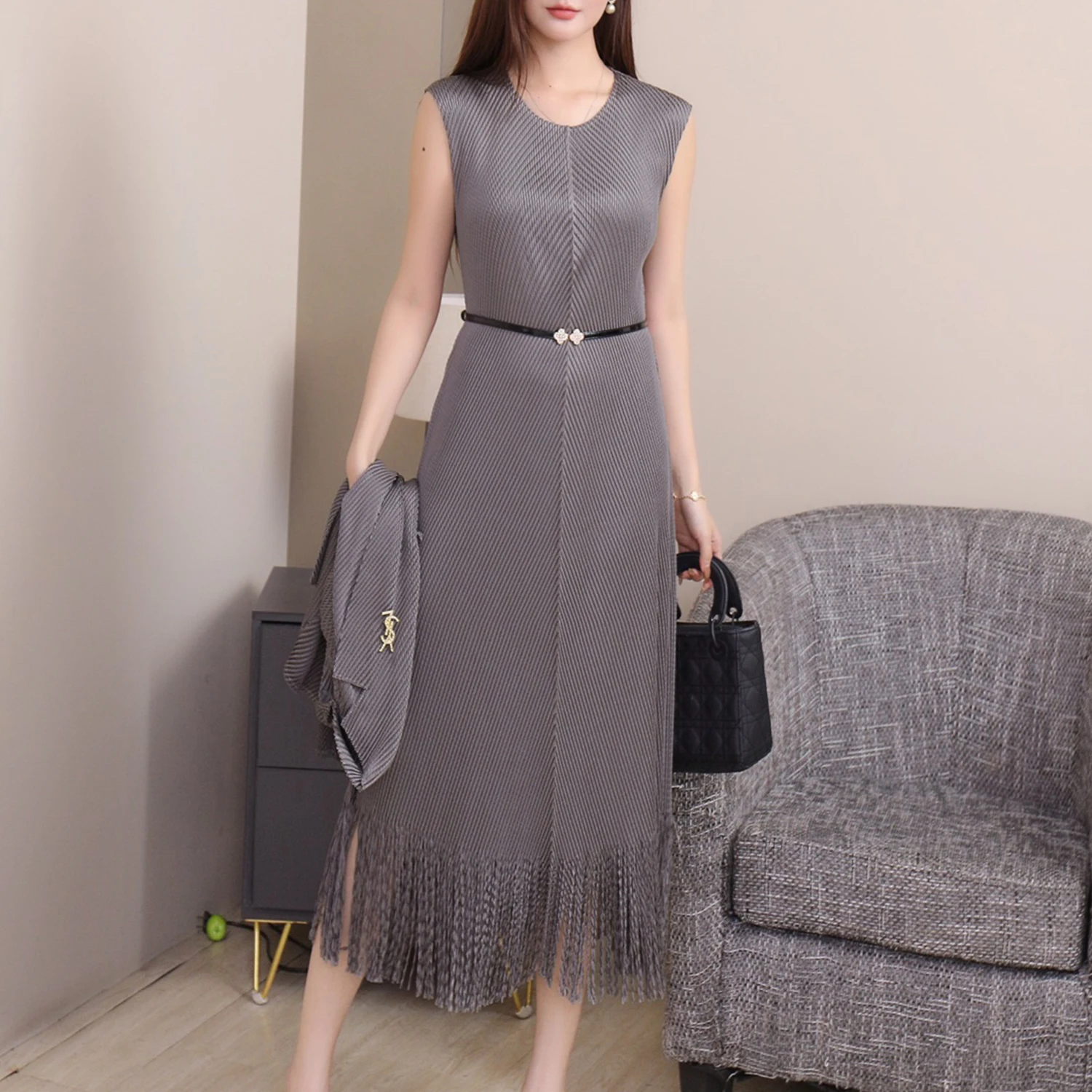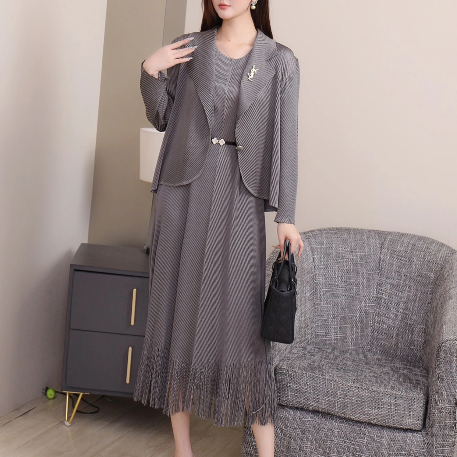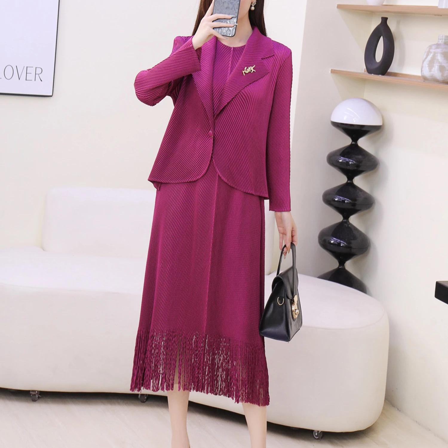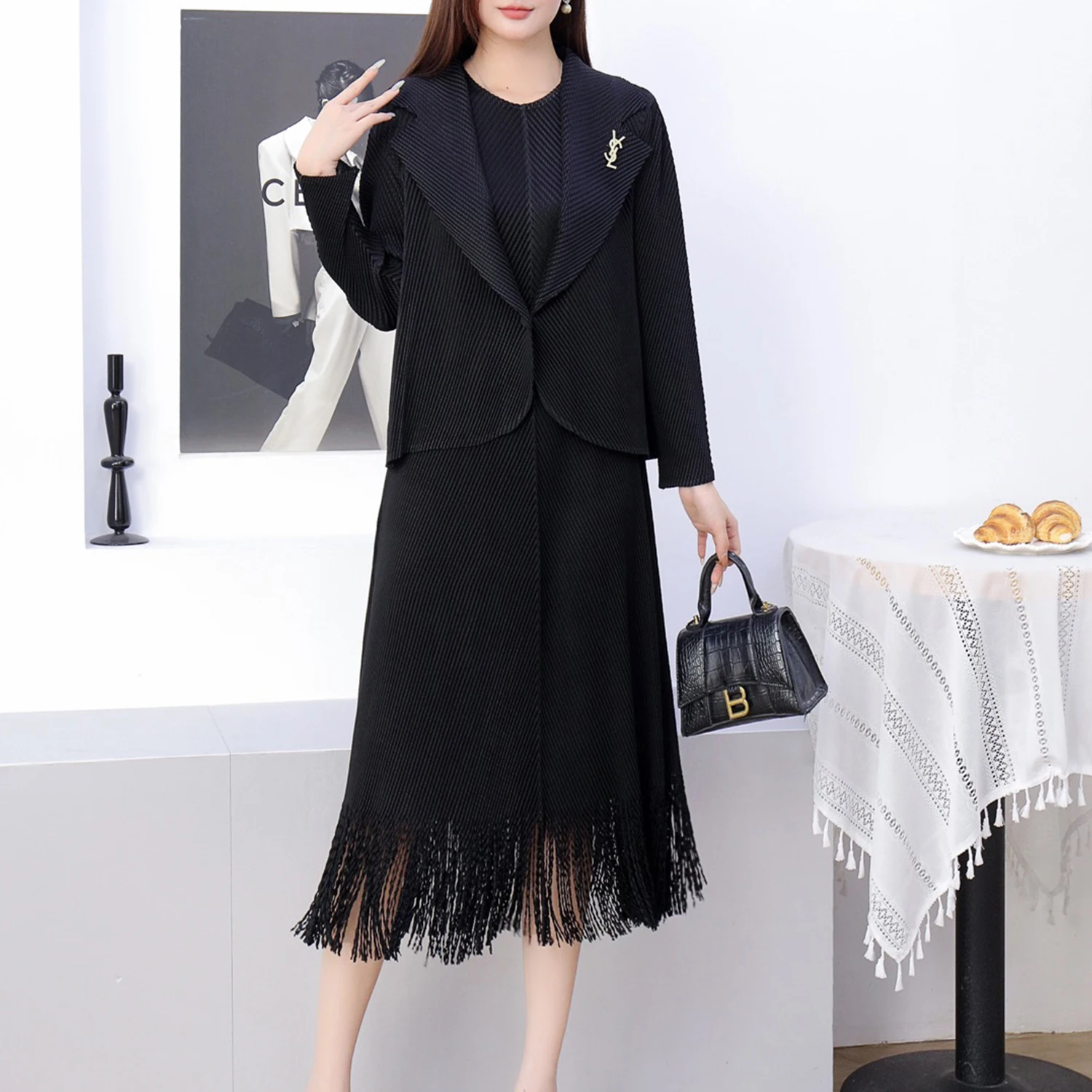 Women's Pleated Two - Piece Set: Lapel Jacket + Tassel Hem Midi Skirt Elegant & Stylish for Office & Casual