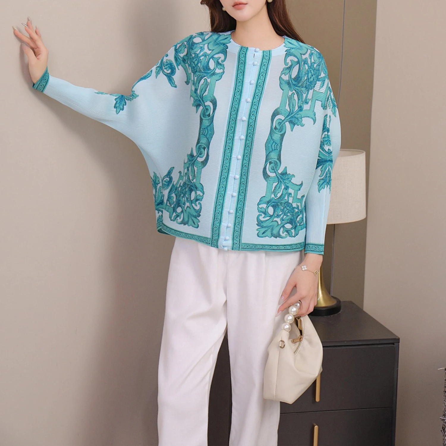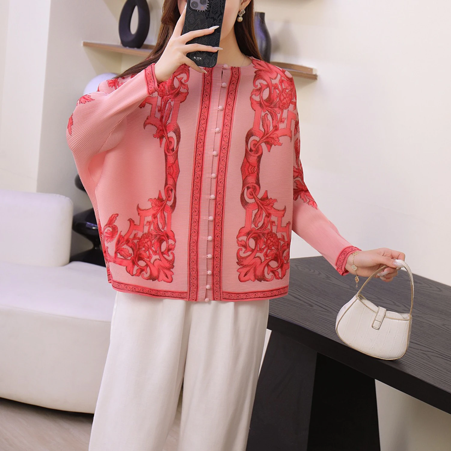 Autumn New Miyake Female Retro Pattern Printed Cardigan Single-Breasted Bat Sleeve Loose Slim Pleated Top Women's Blouses Shirts