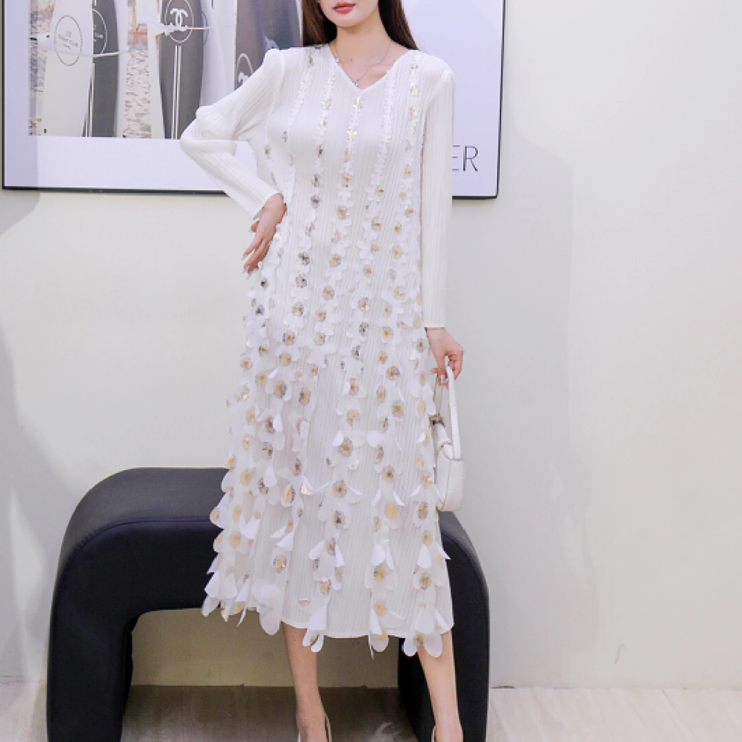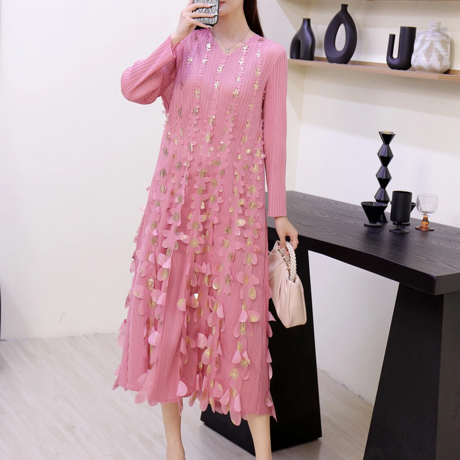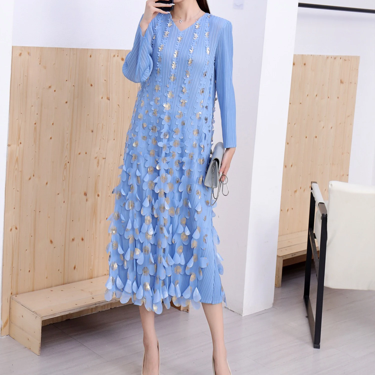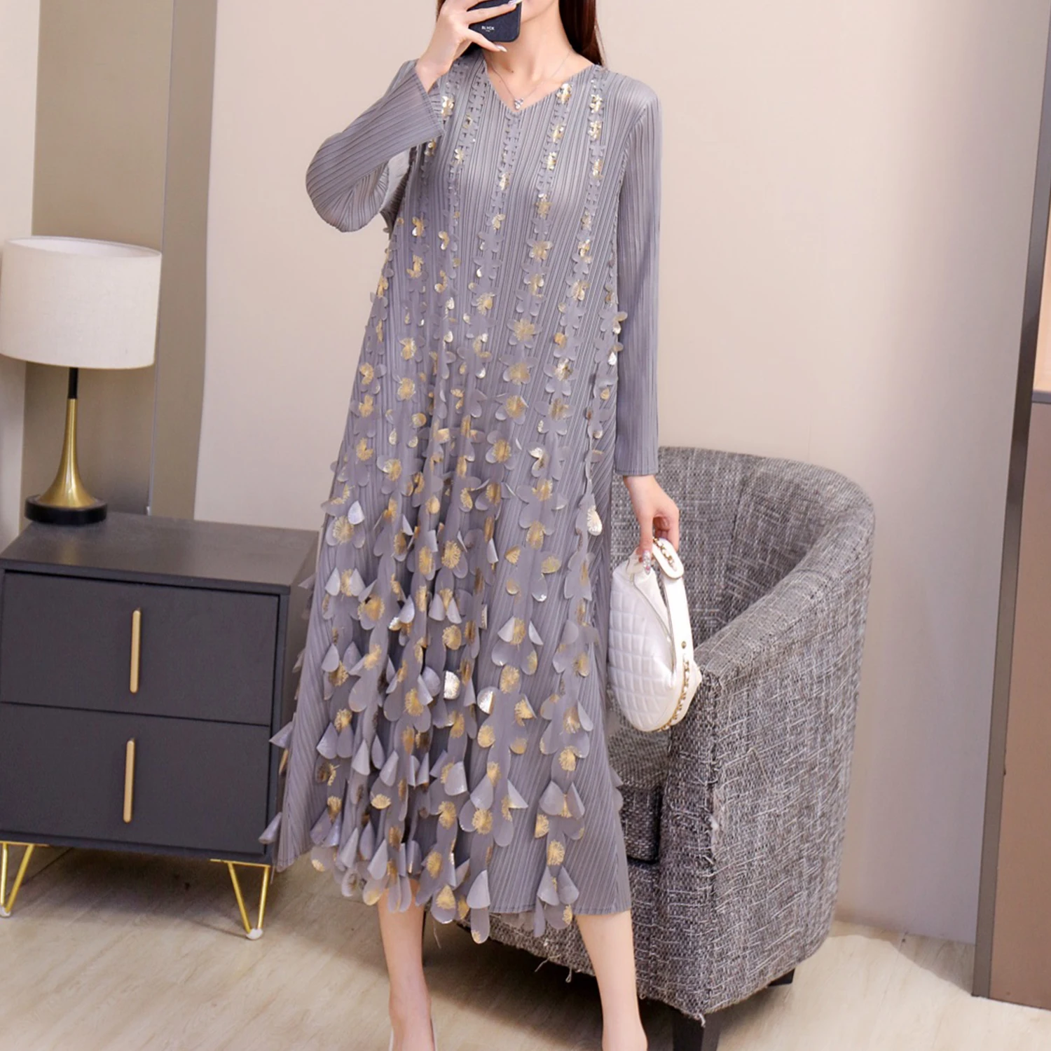 2025 Autumn New V-neck Lady DressThree-Dimensional Gilded Flower Decoration Casual Miyake Pleated Dress