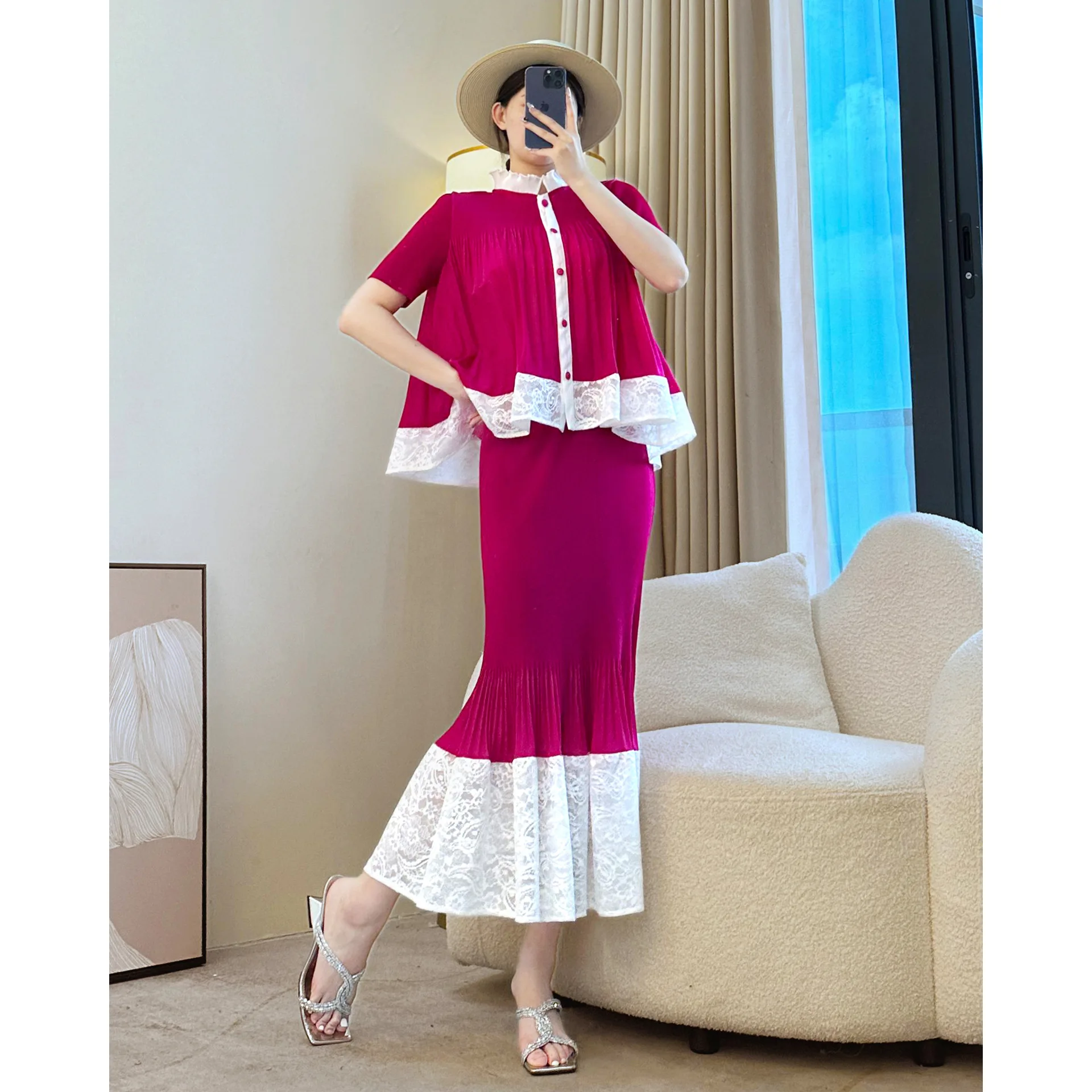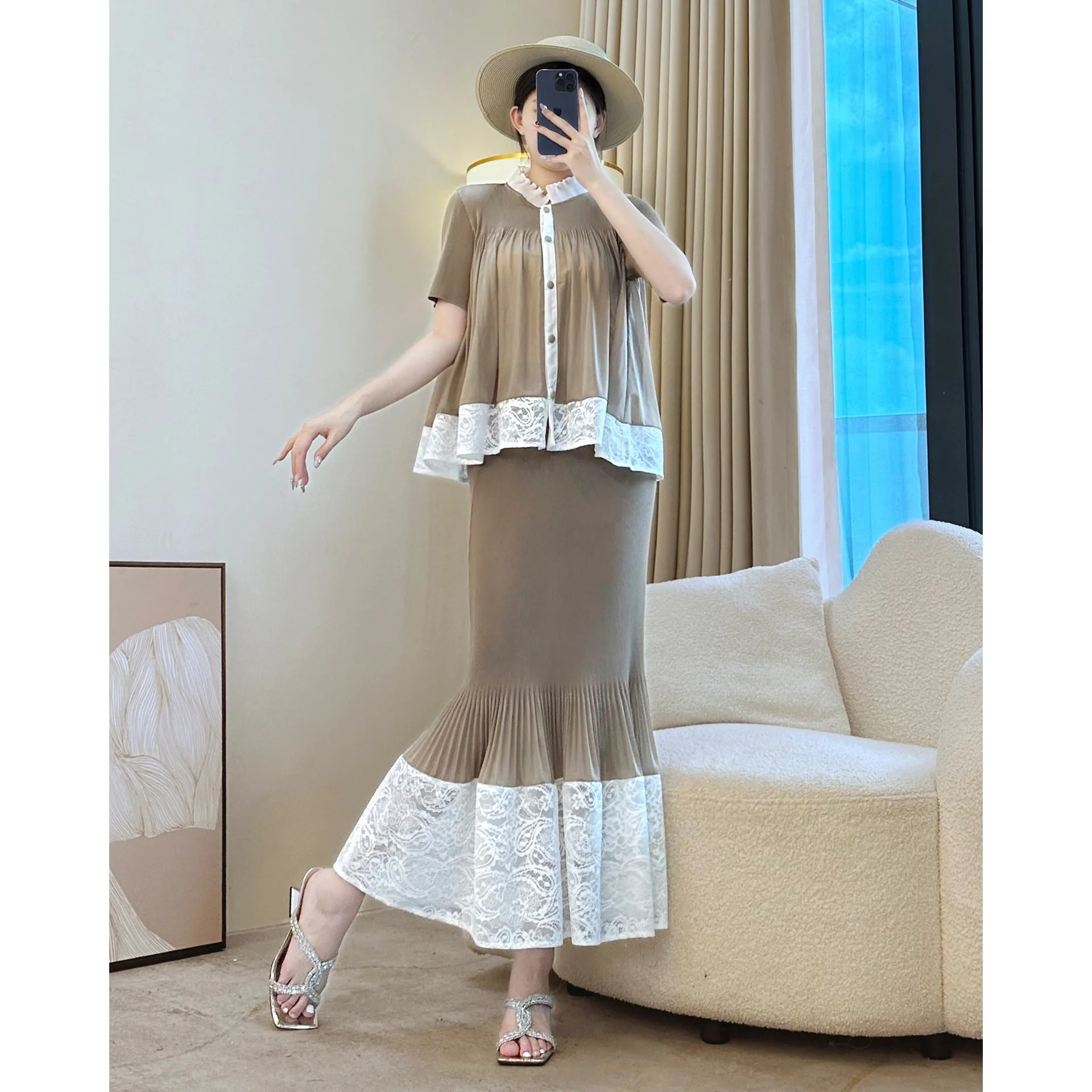 Miyake High-End Women's Casual Set Pleated Top & Large Skirt with Lace Stitching Elegant Women's Set