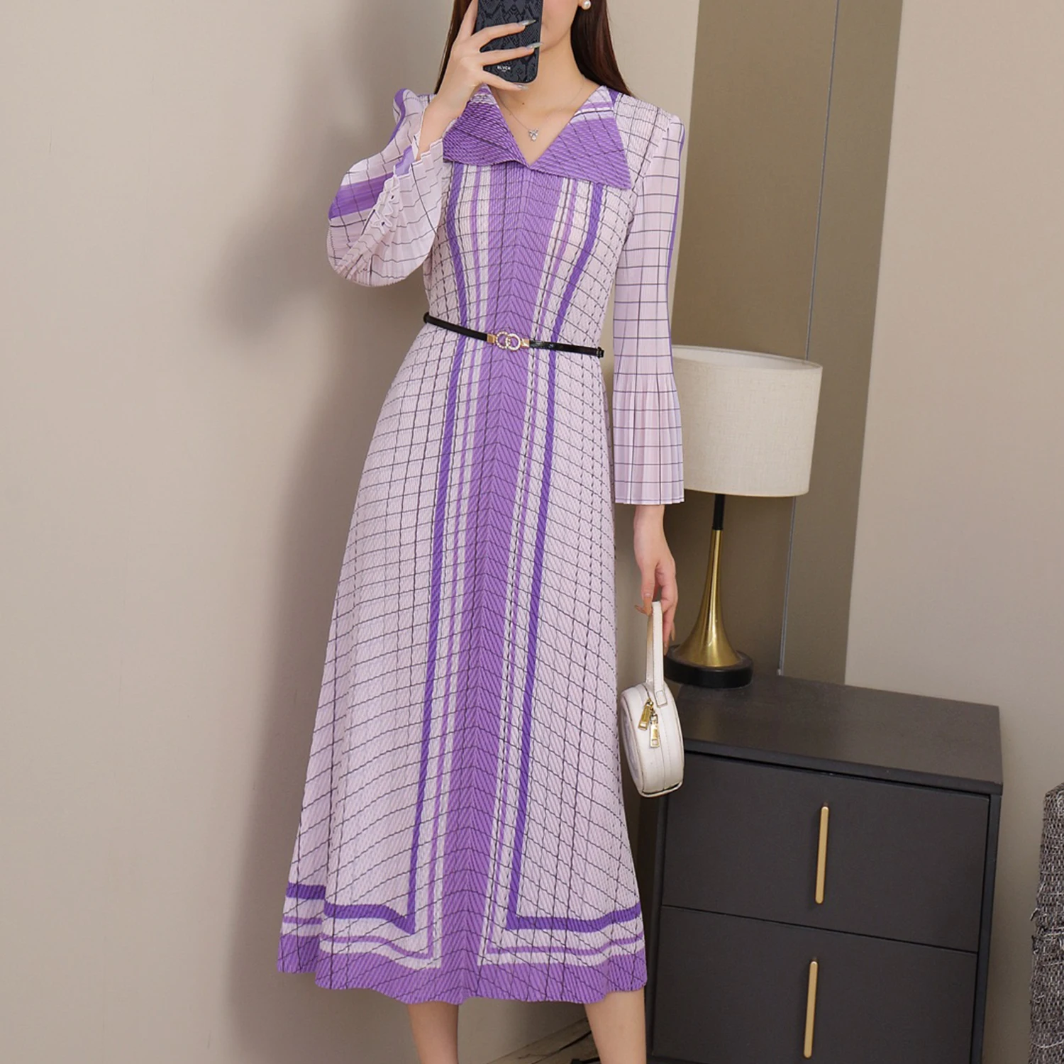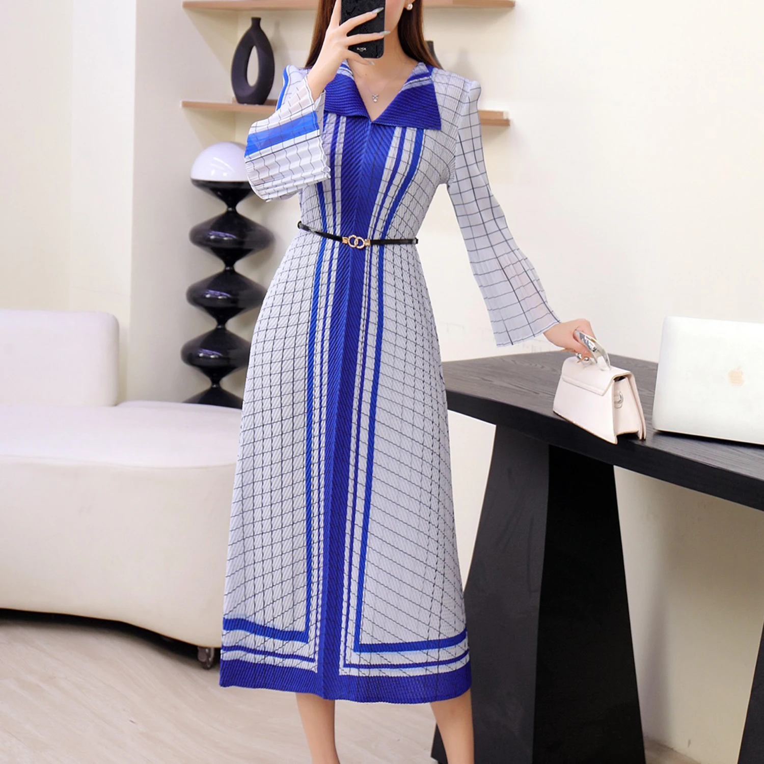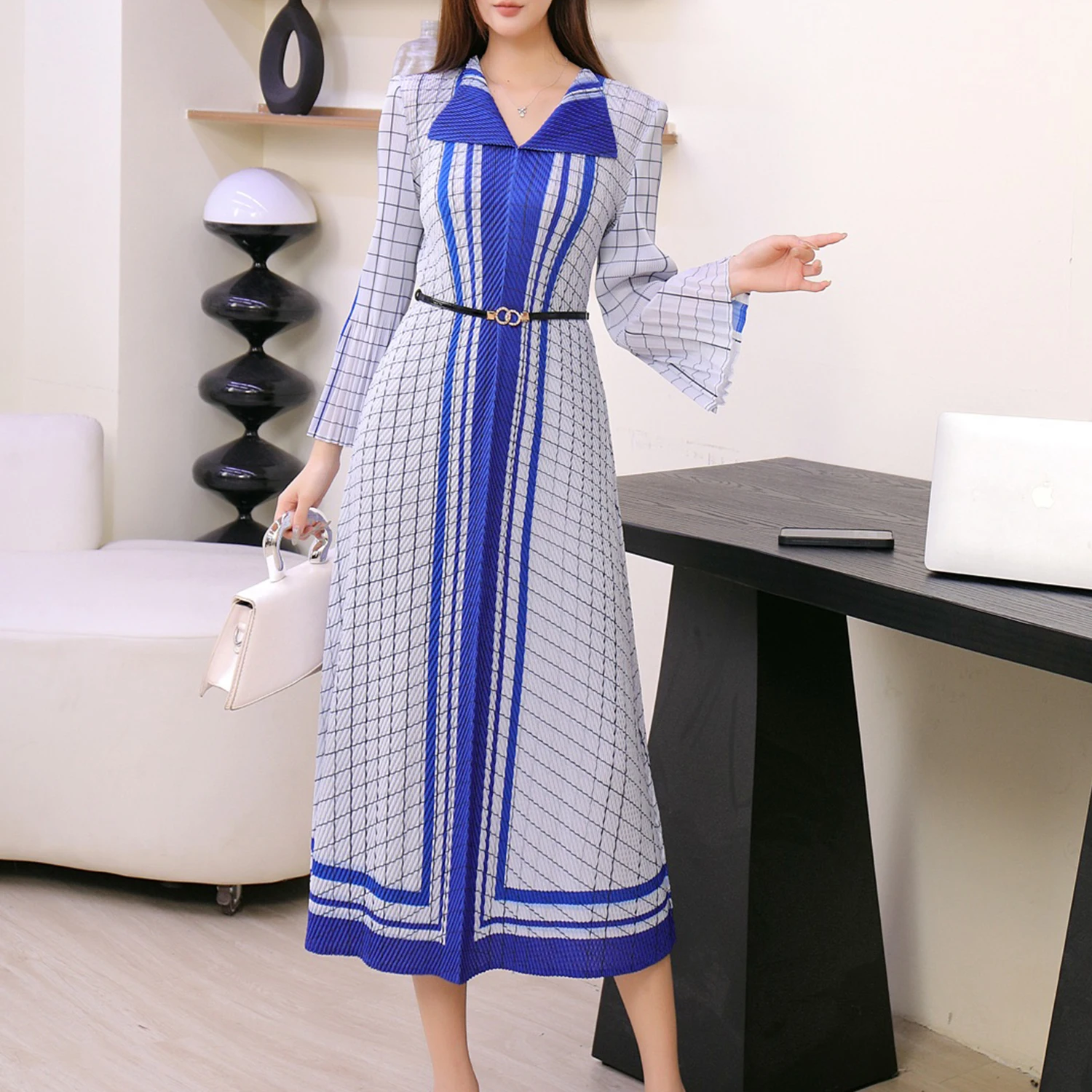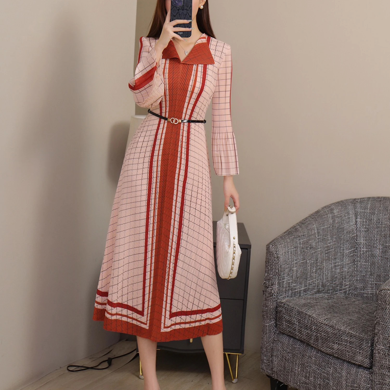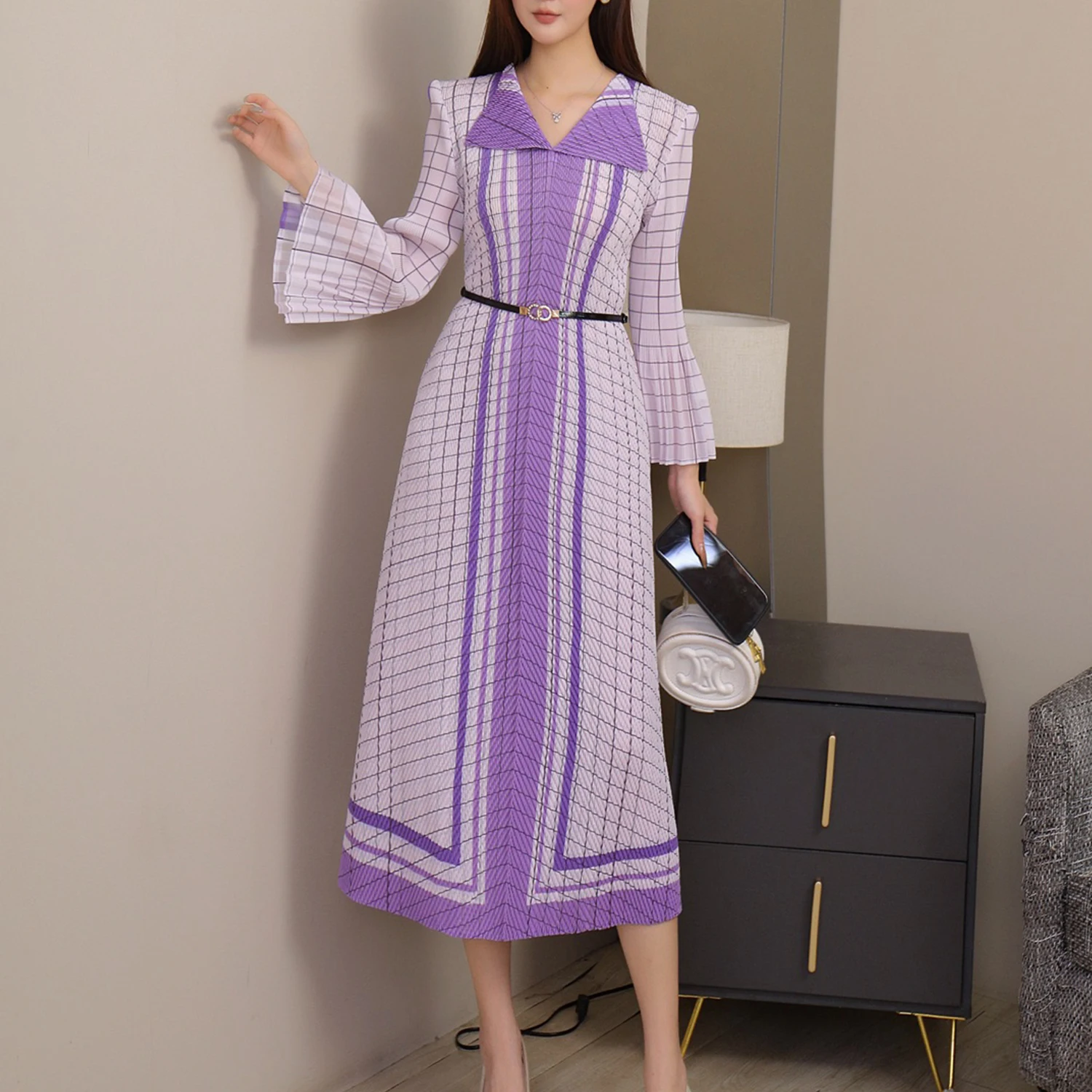 Miyake Plaid Pleated Midi Dress - Lapel Bell Sleeve Belted for Elegant Style Women's Casual Dress