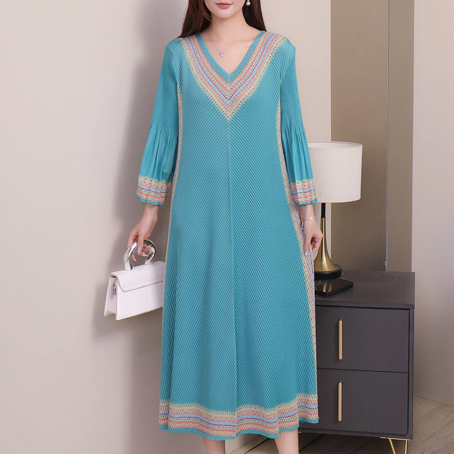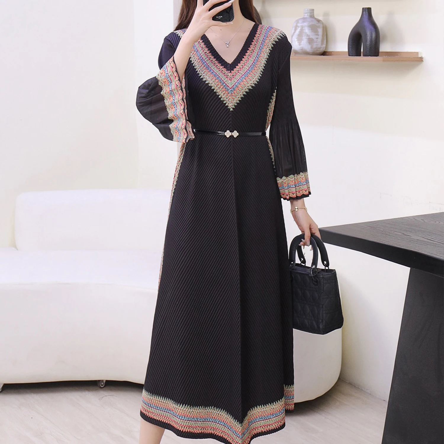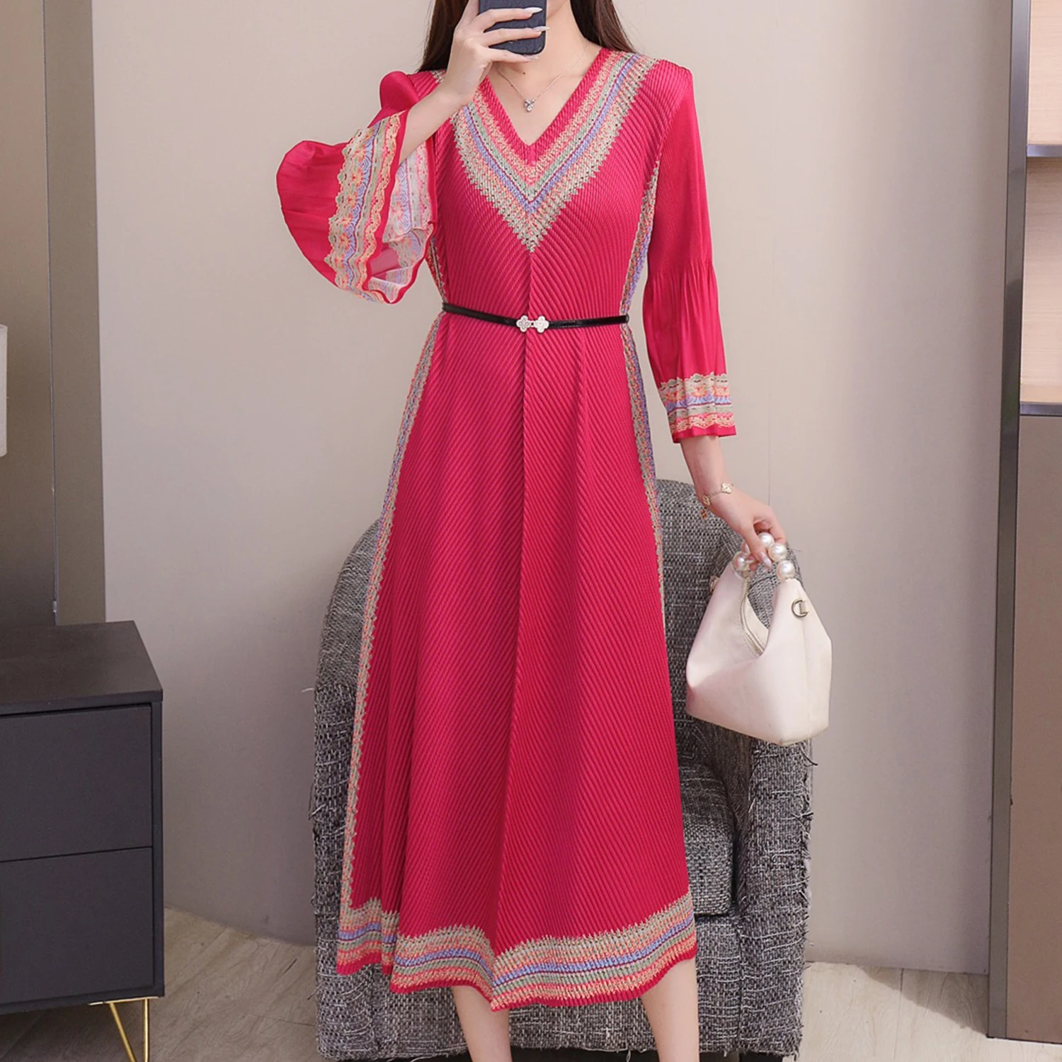 Miyake Women's Pleated Dress with Ethnic Print - V - Neck Bell Sleeve Belted Midi Dress for Elegant