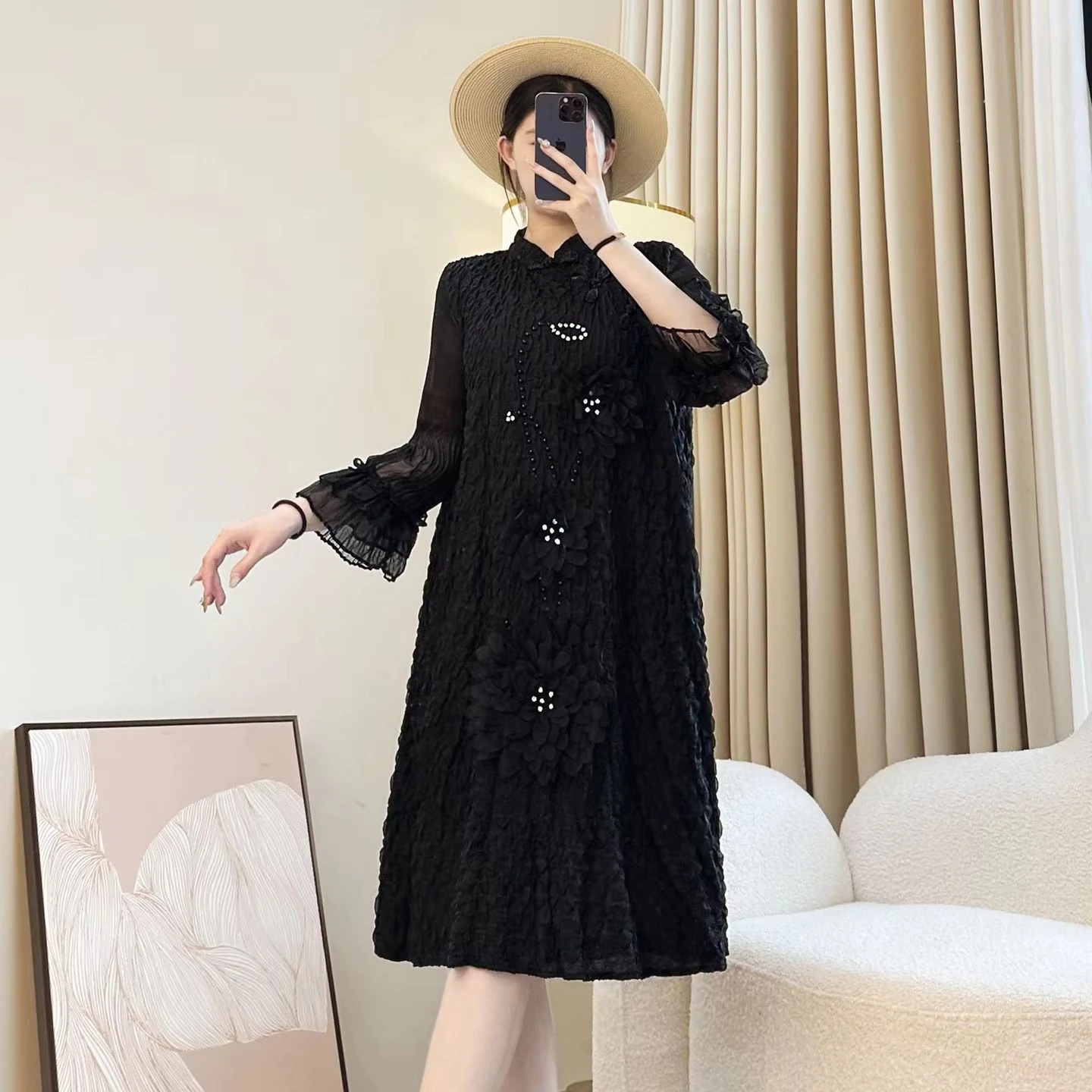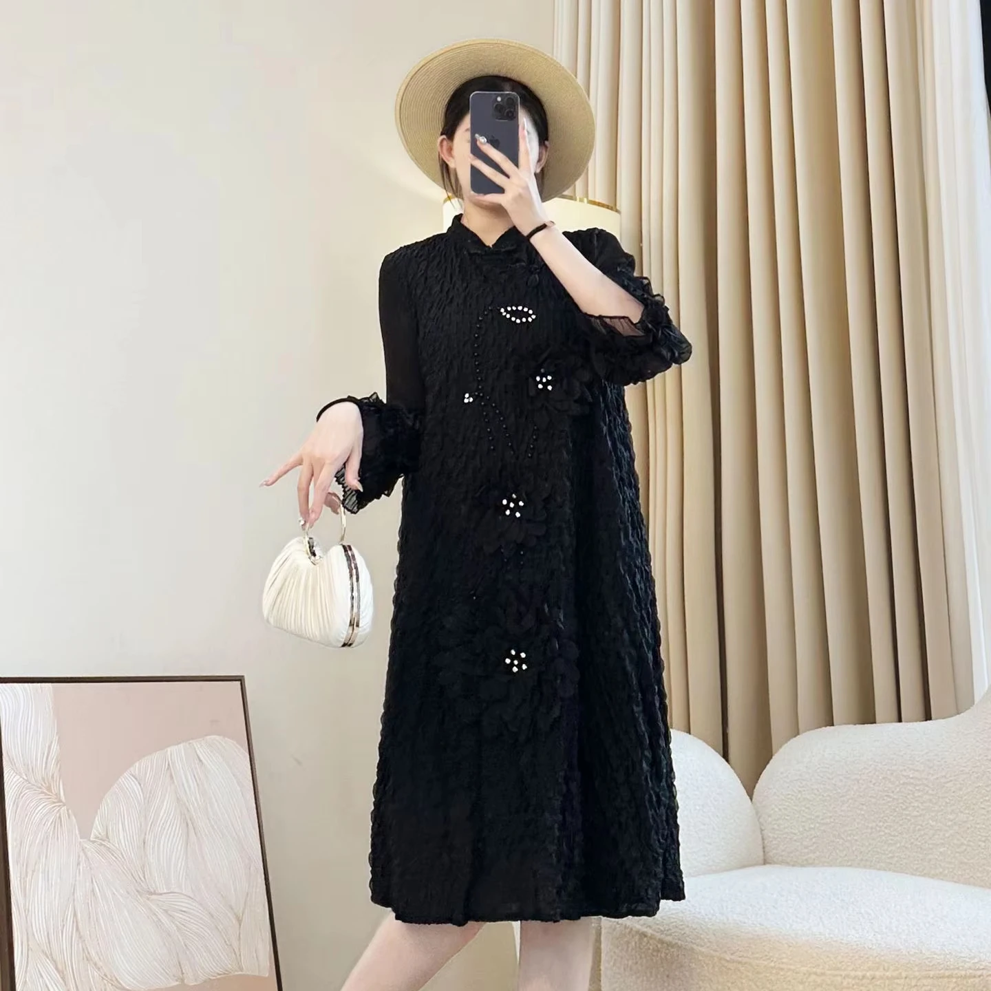 Miyake Chinese Style Retro Casual Red Dress with Beaded & Rhinestone Embellished Ruffled Hem Design Pleated Women's Midi Dress