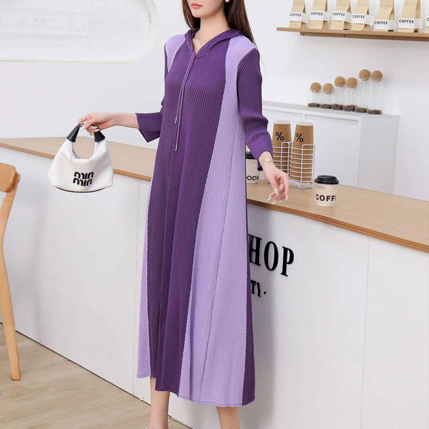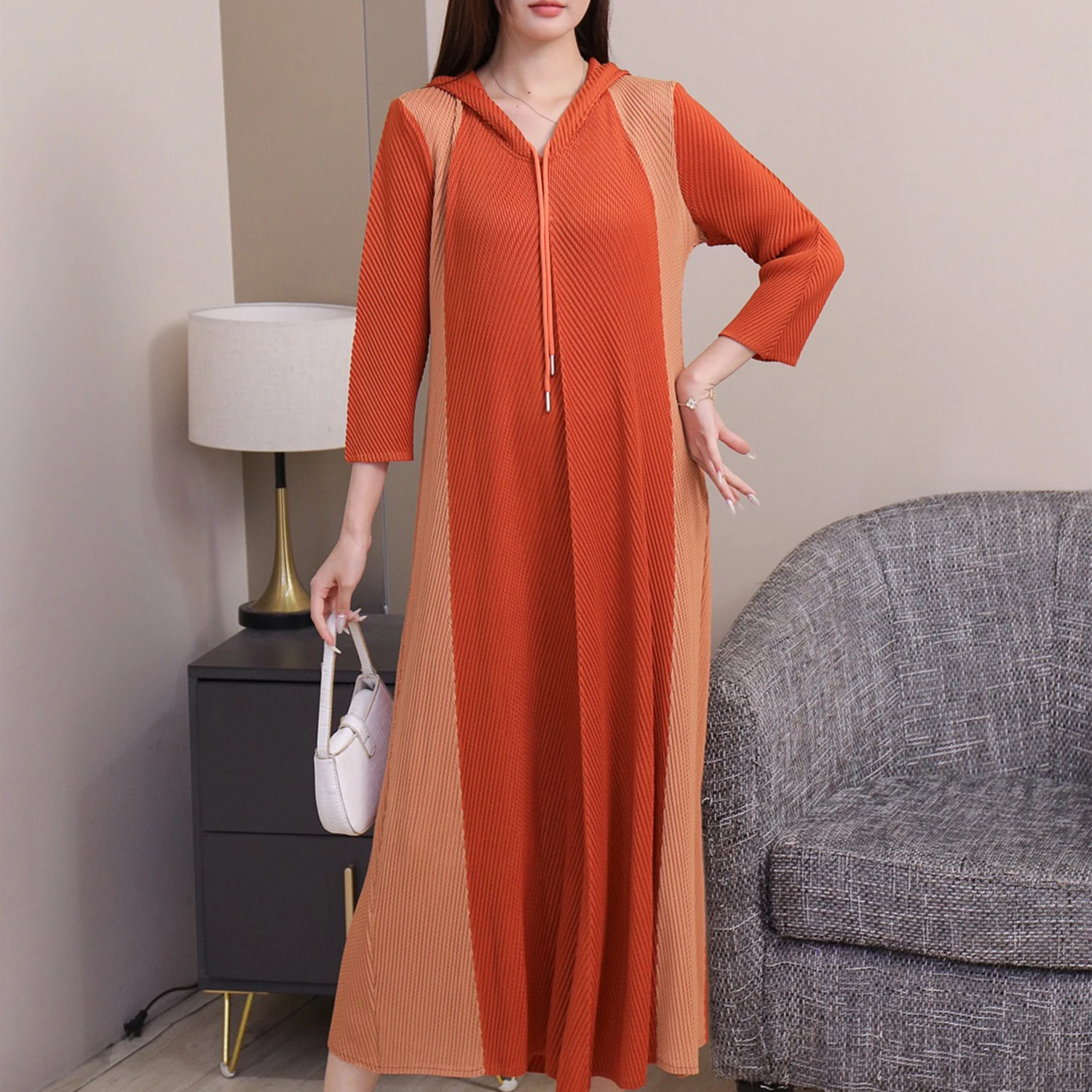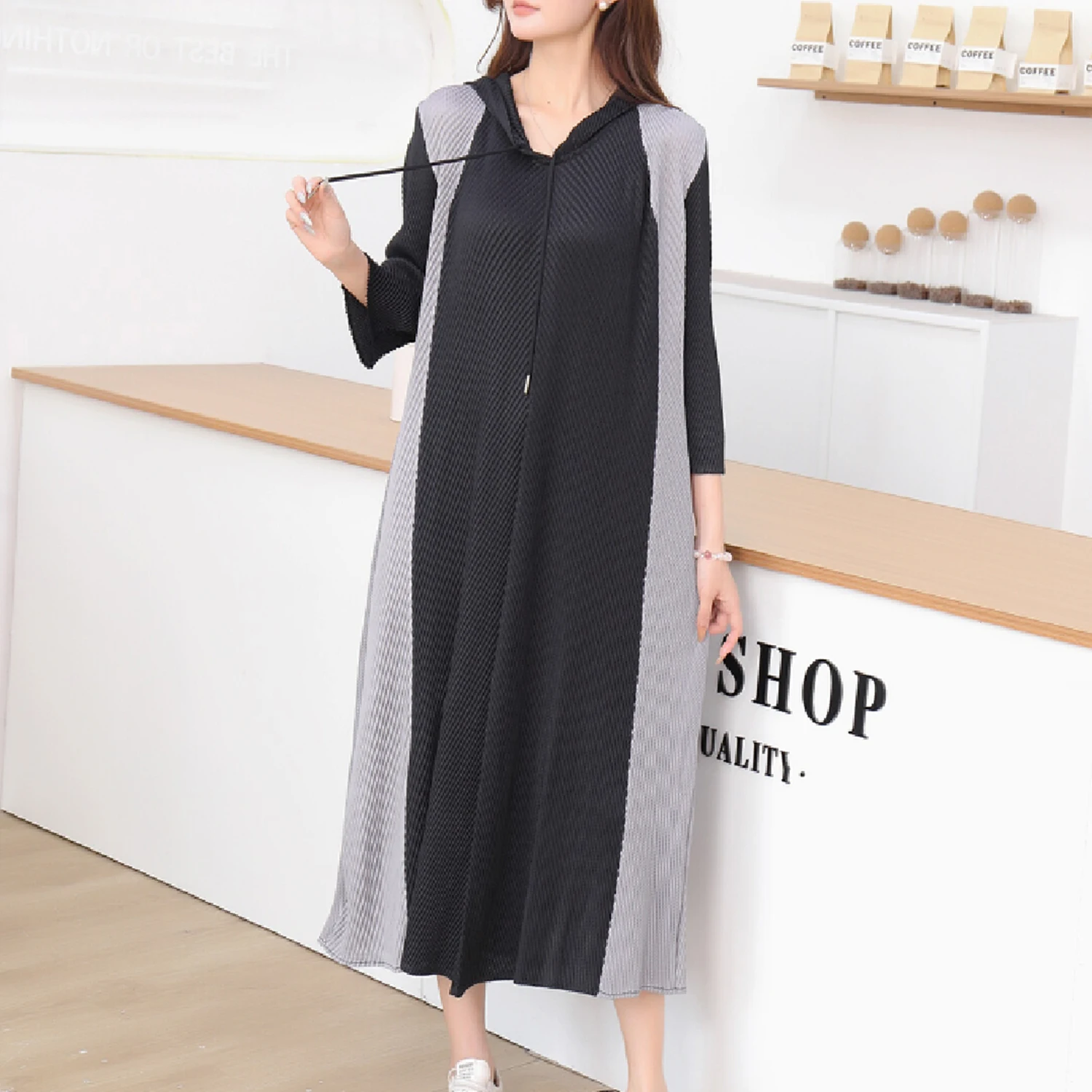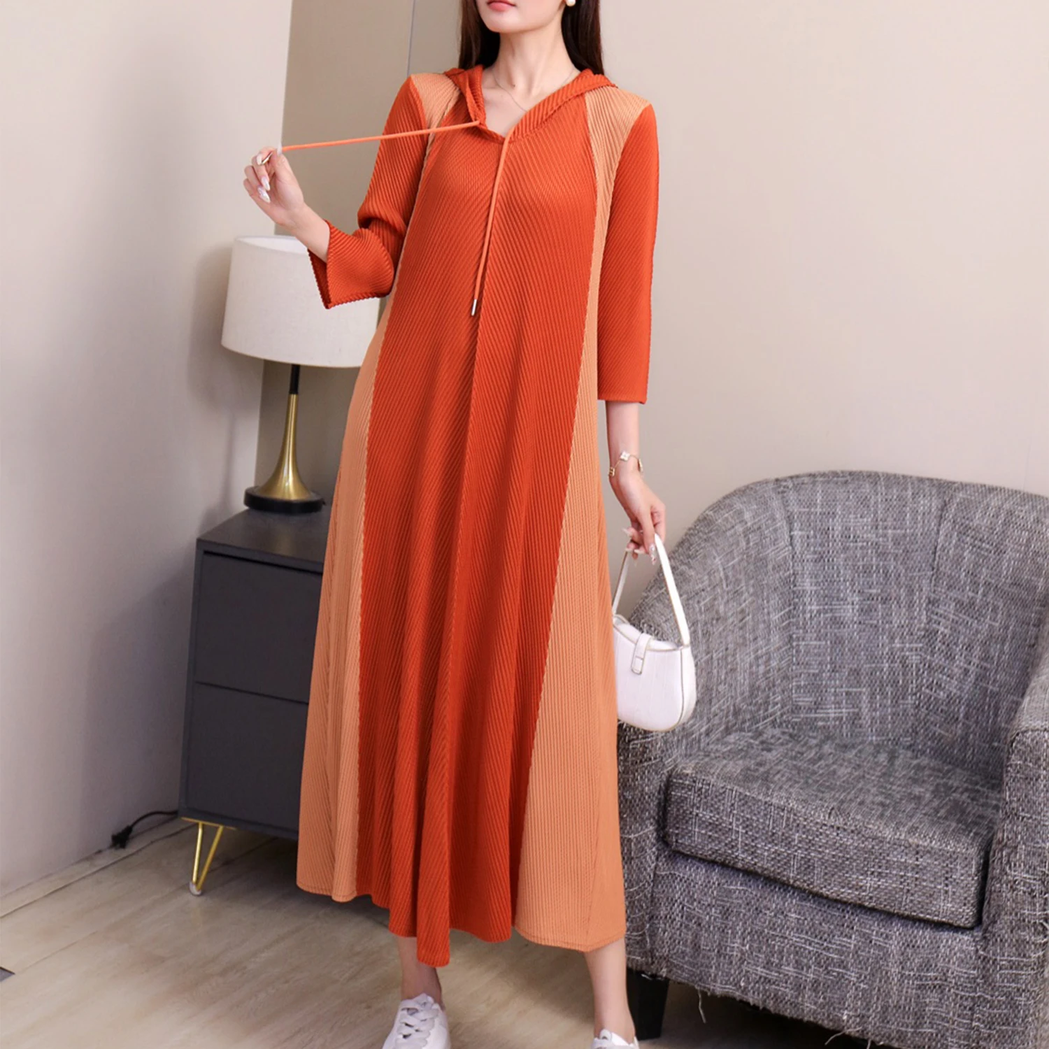 Miyake Women's Casual Dress with Pleated Seven-Point Sleeves Elegant Slim Design for Spring and Autumn Loose Fit