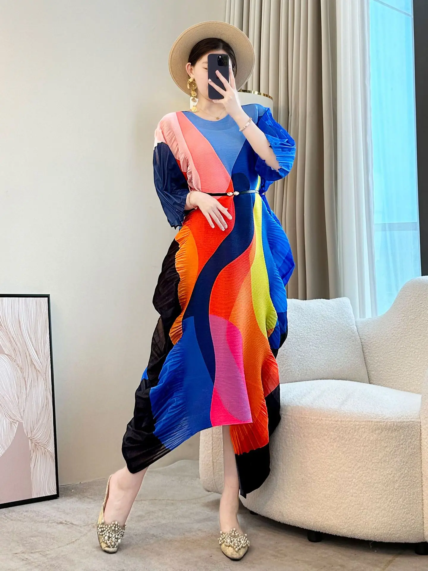 2025 New Artistic Contrast Pleated Maxi Dress Irregular Design Elegant Casual Vintage Ladies Dress