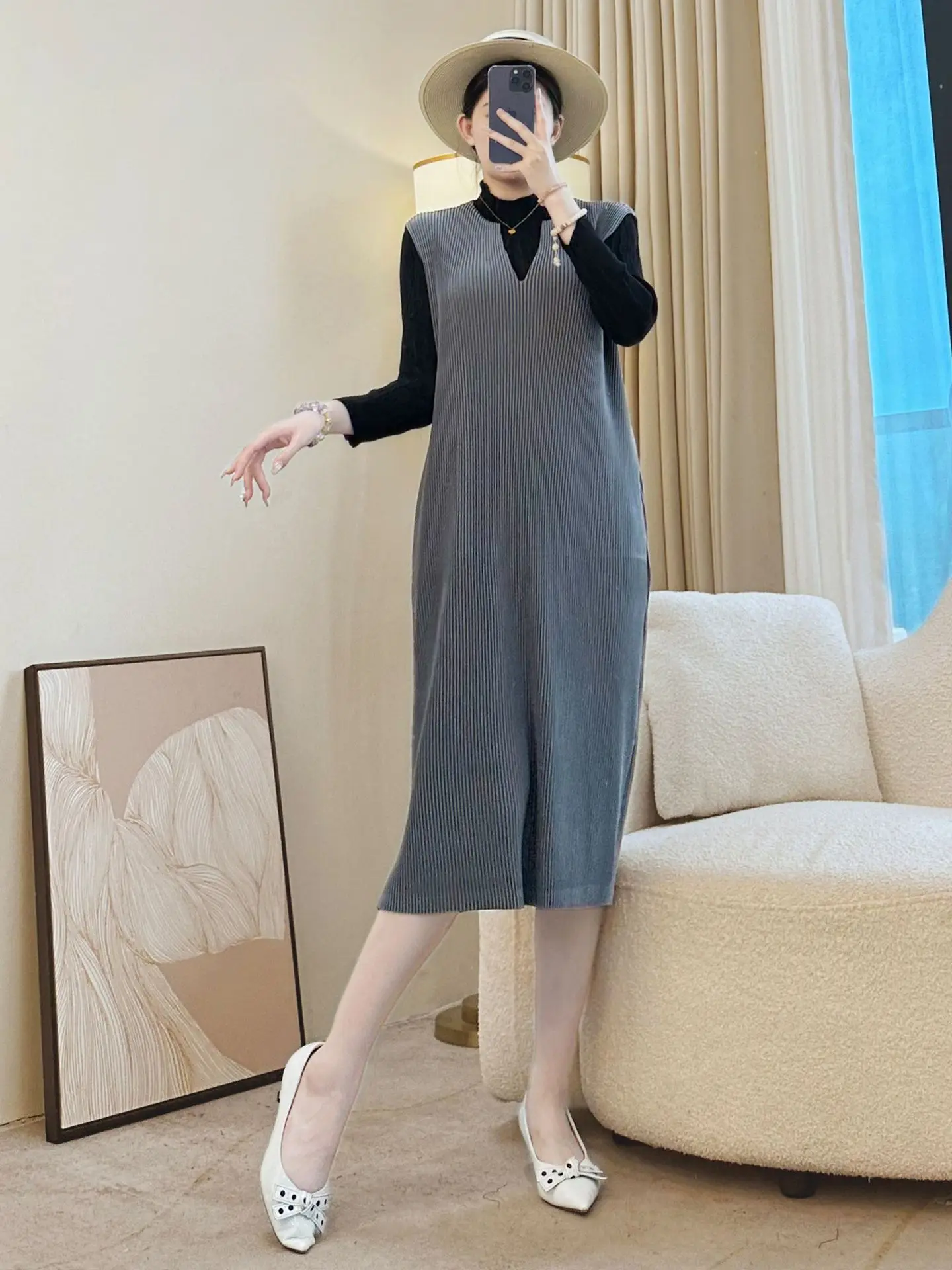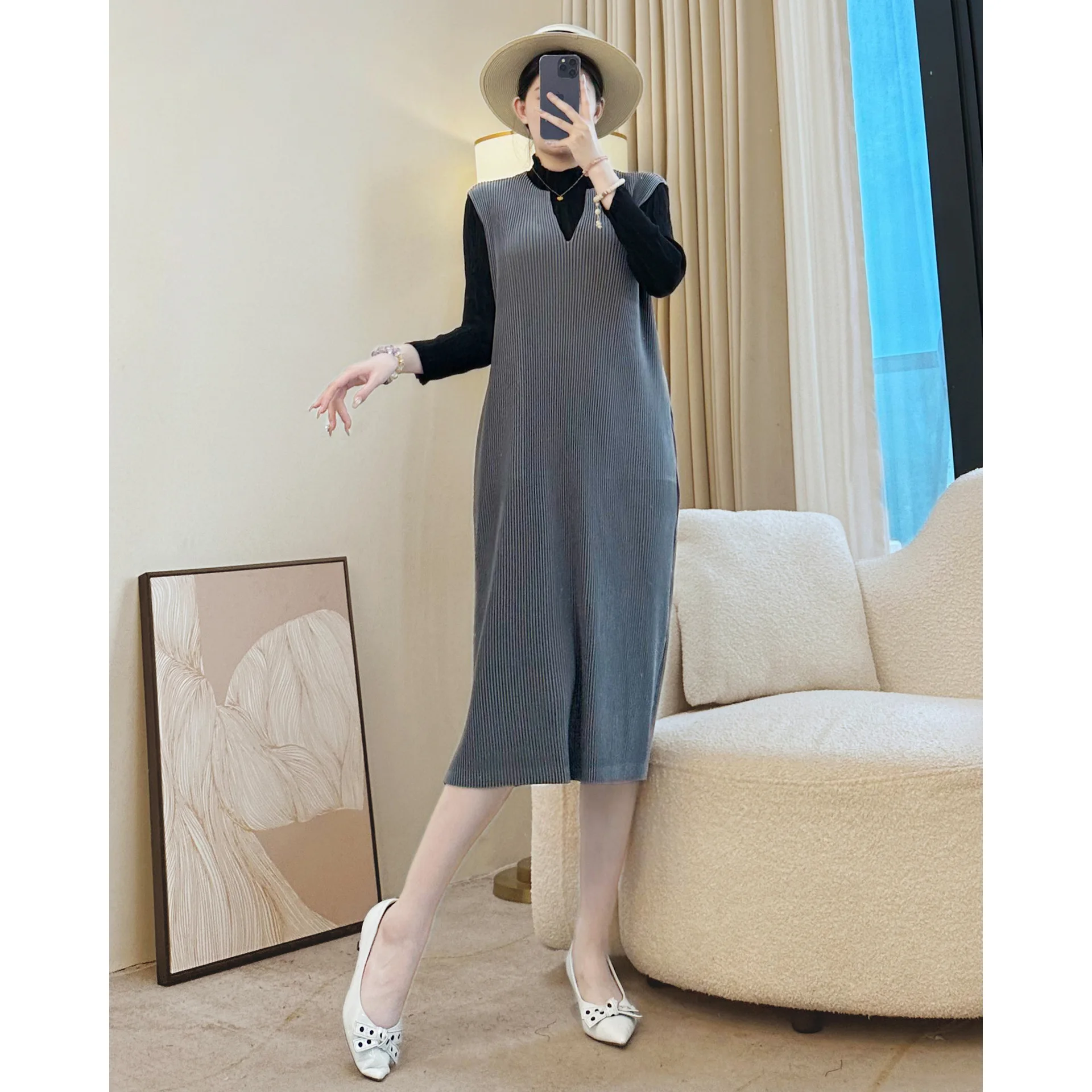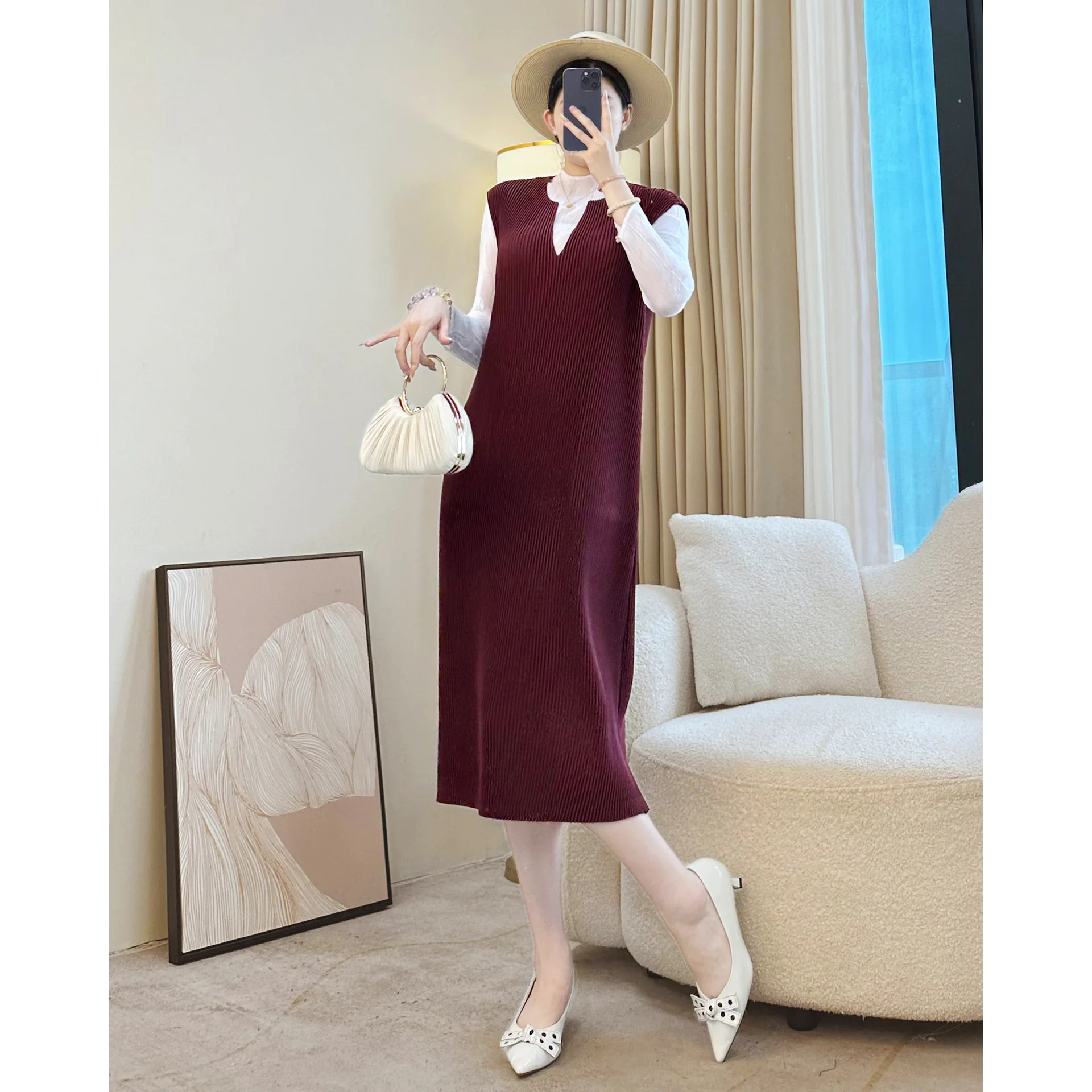 Miyake Factory Wholesale Casual Women's Dress Pleated Solid Color V-Neck Vest Skirt