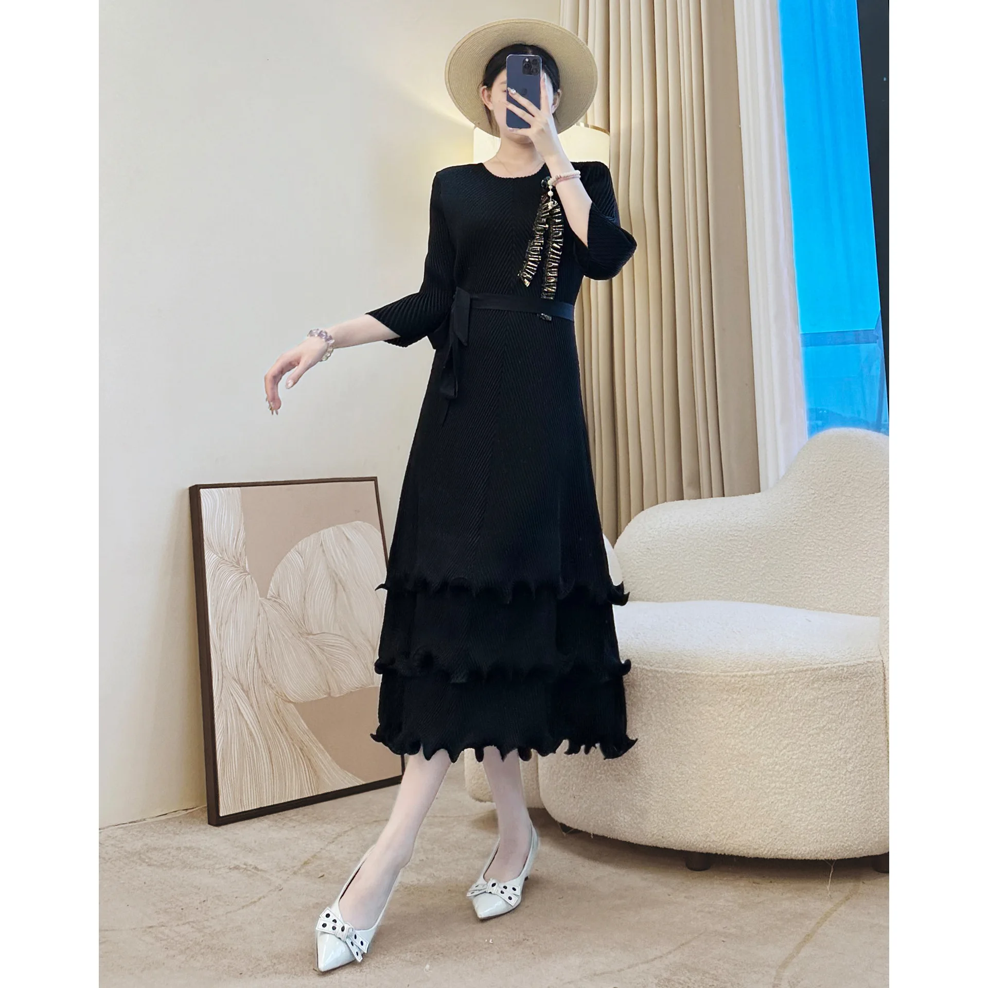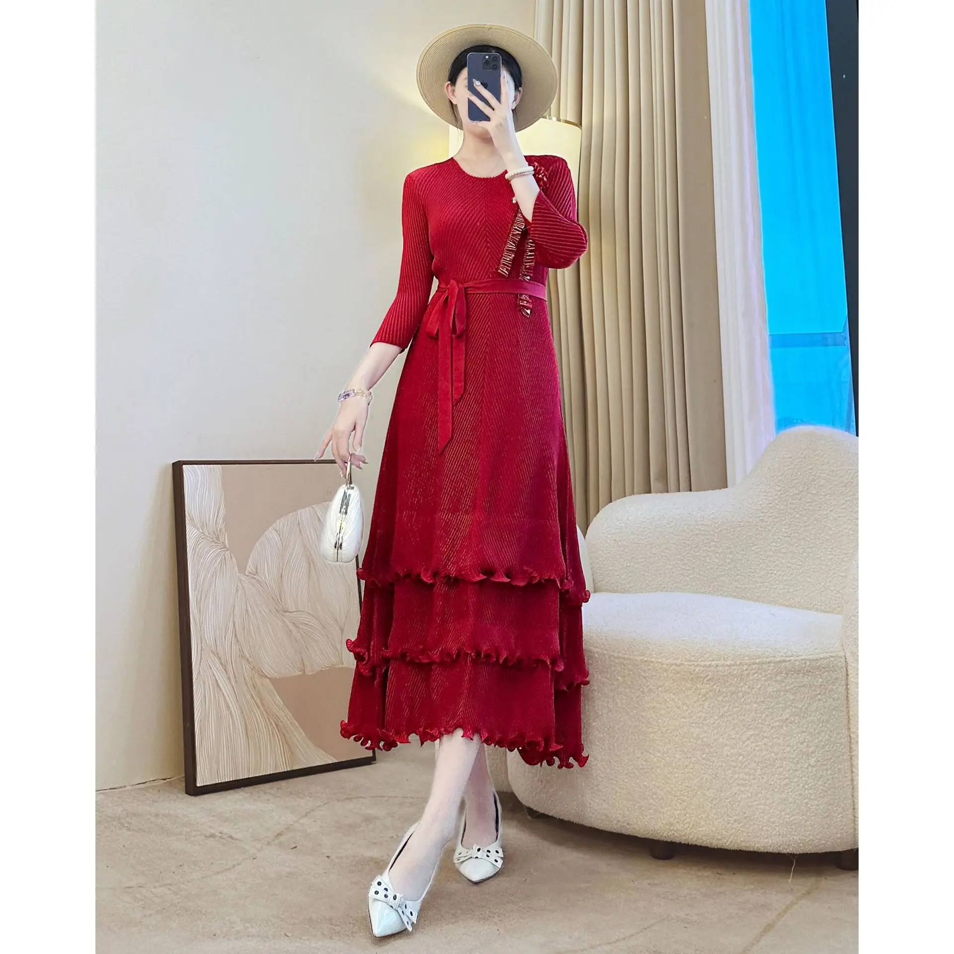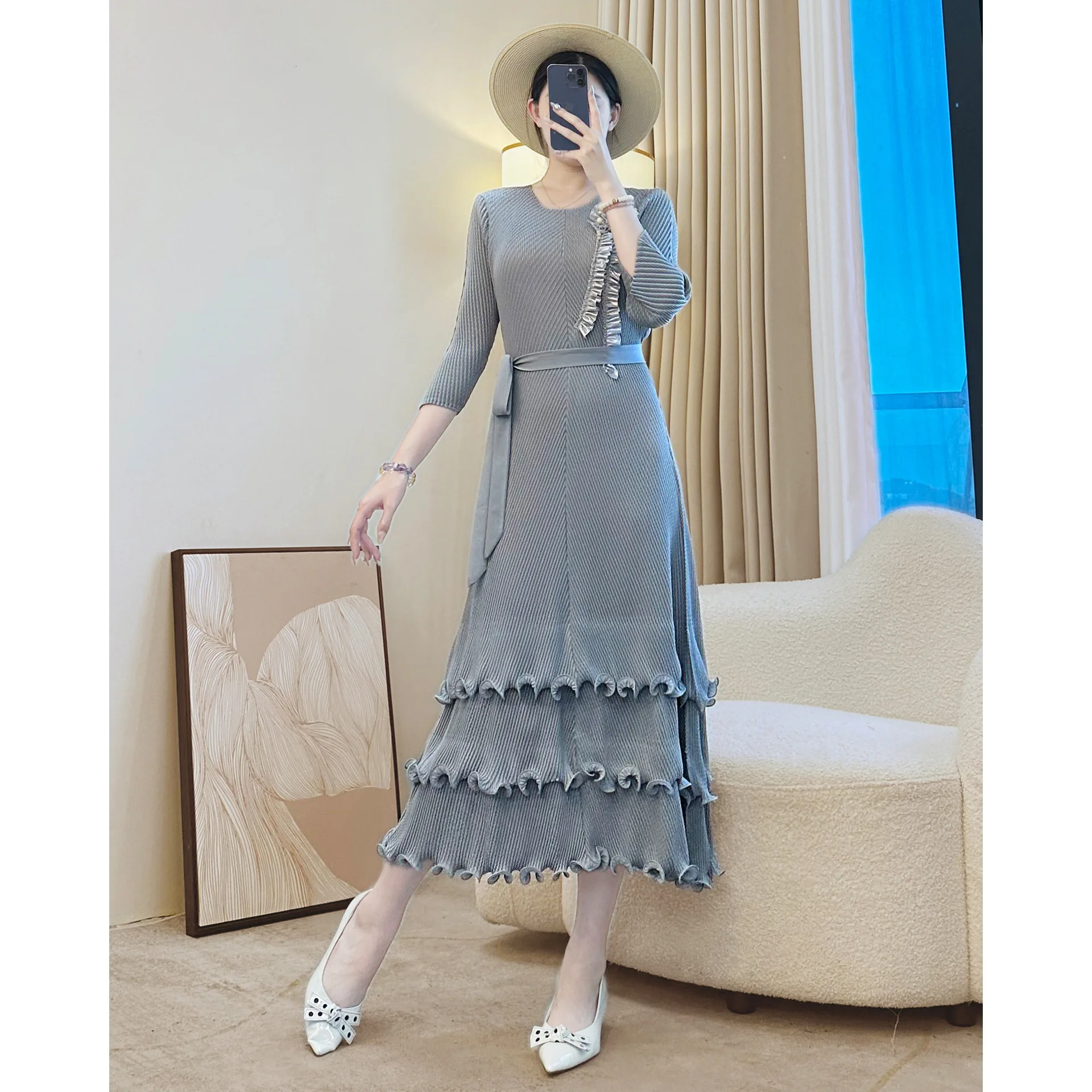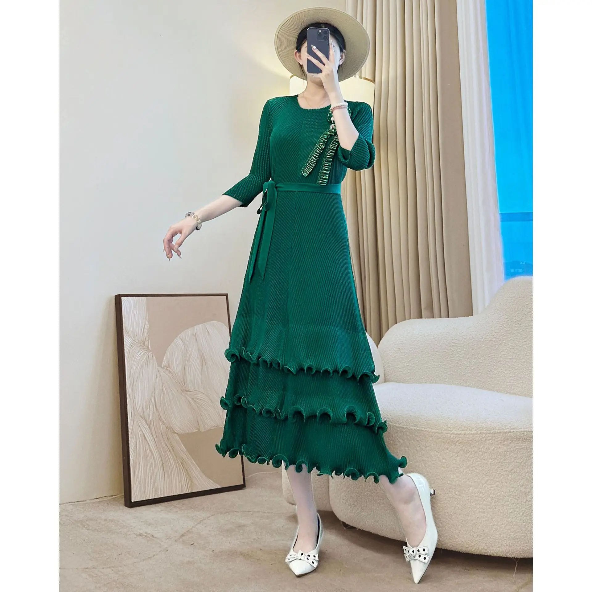 Women's Elegant Pleated Dress with Half - Sleeves Belted Waist and Tiered Ruffled Hem for Formal & Casual Occasions