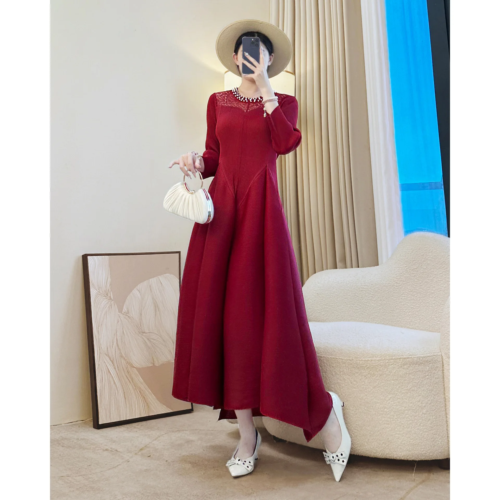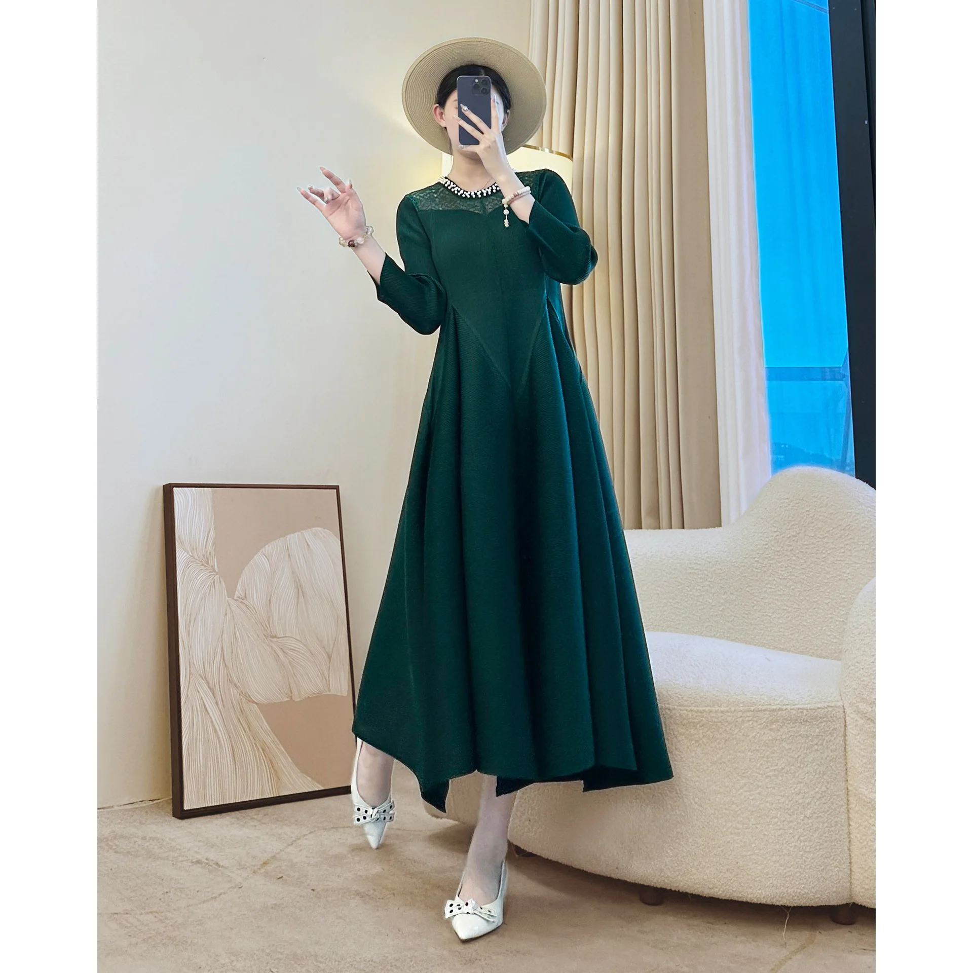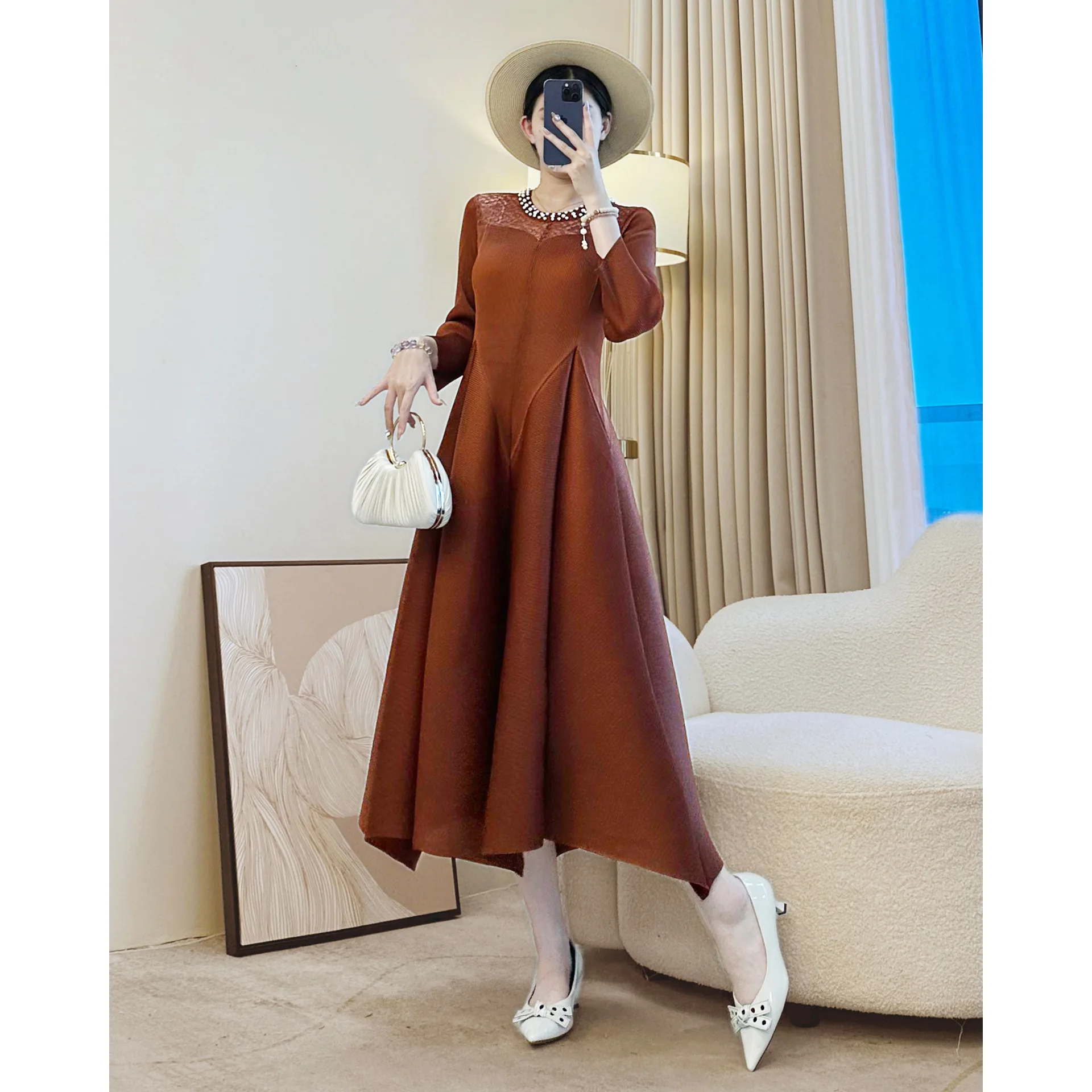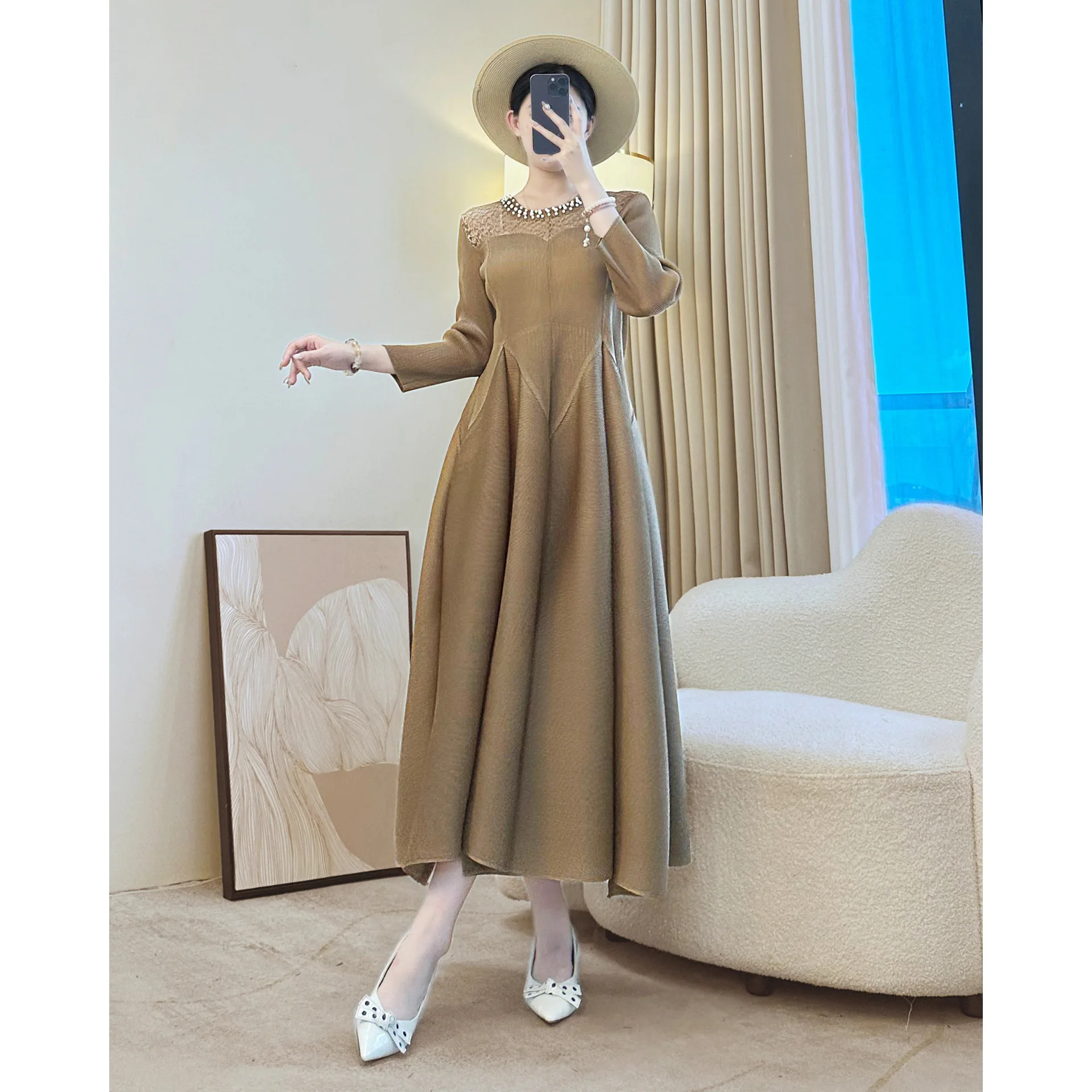Autumn New Retro Elegant Diamond-Encrusted Casual Dress for Ladies Factory Wholesale Pleated Dress