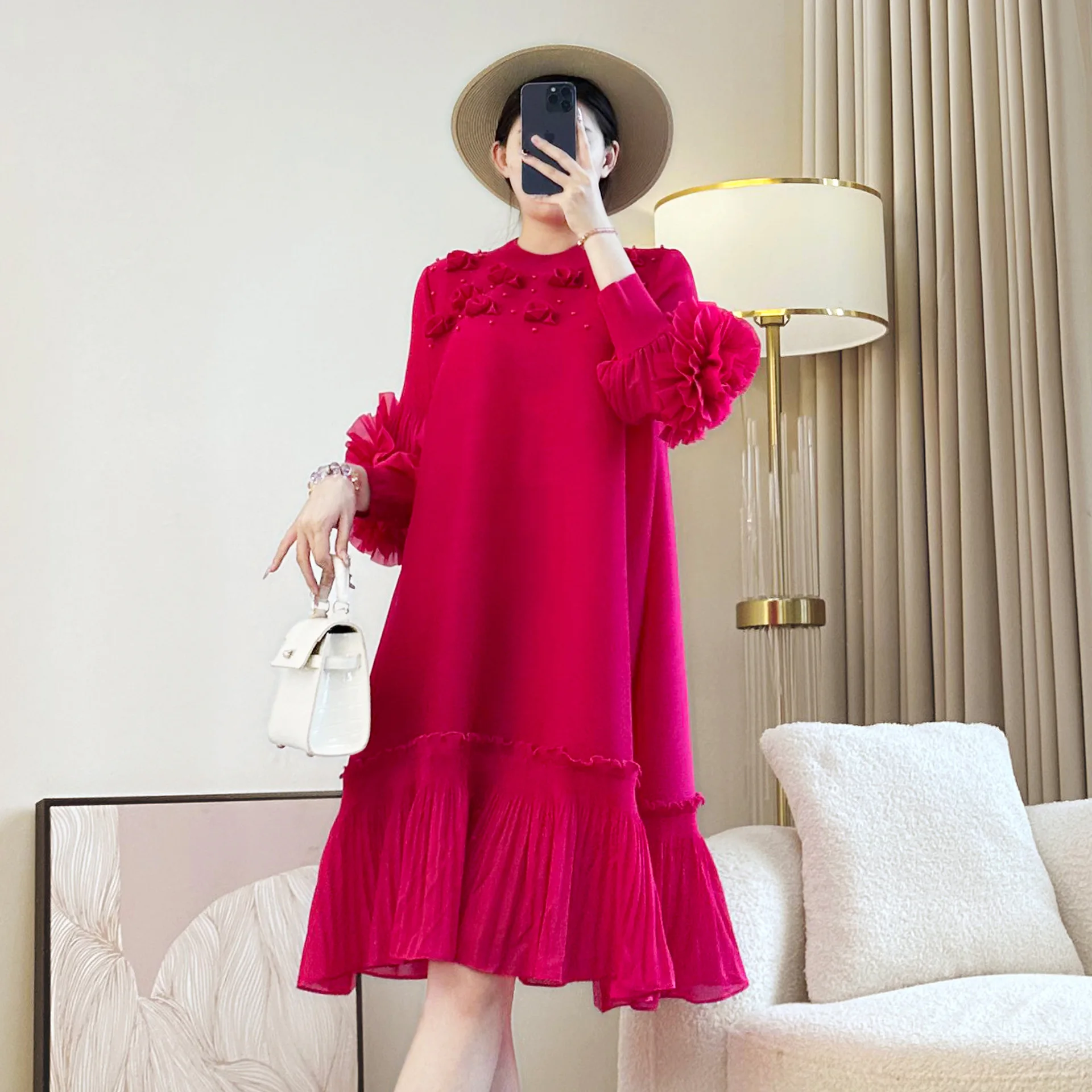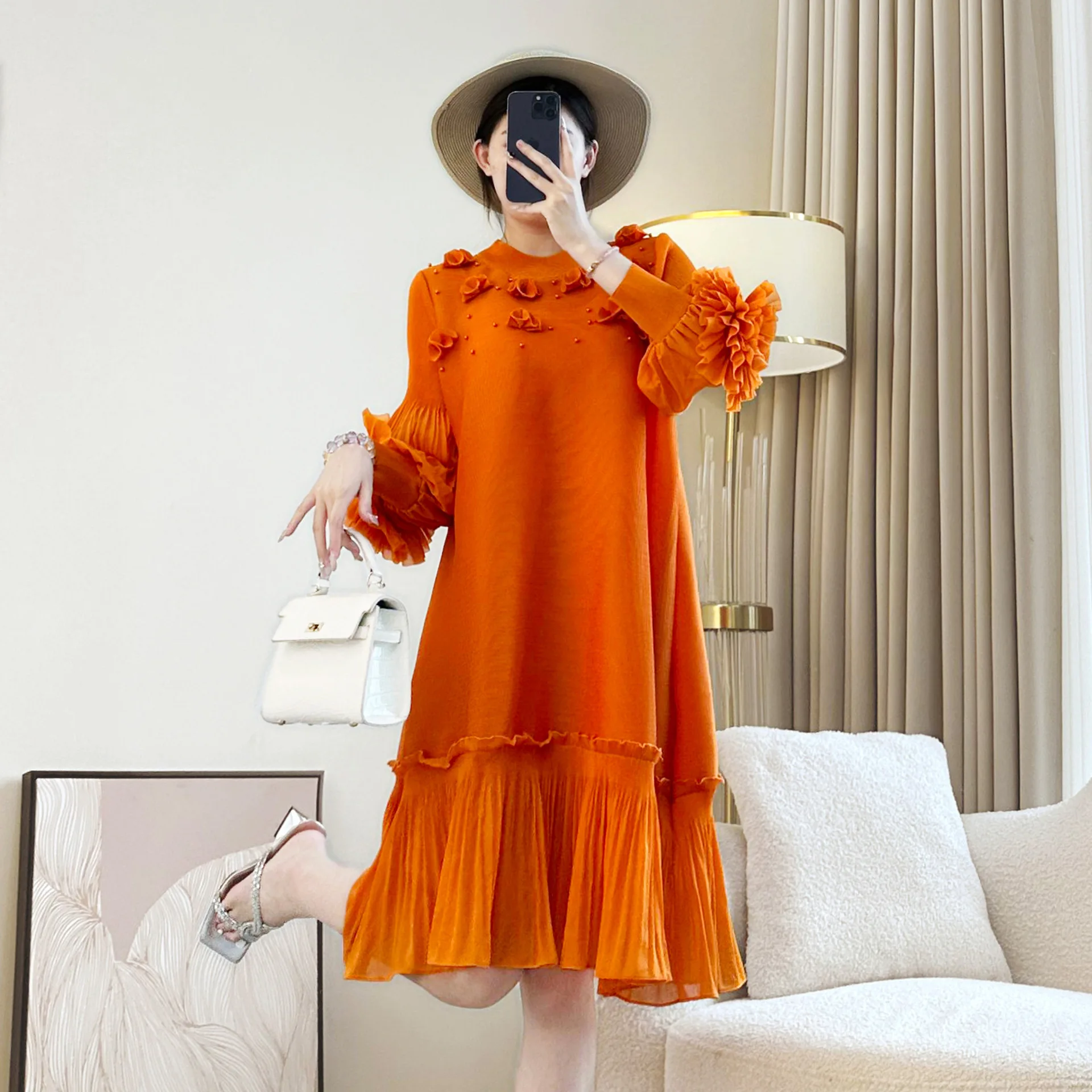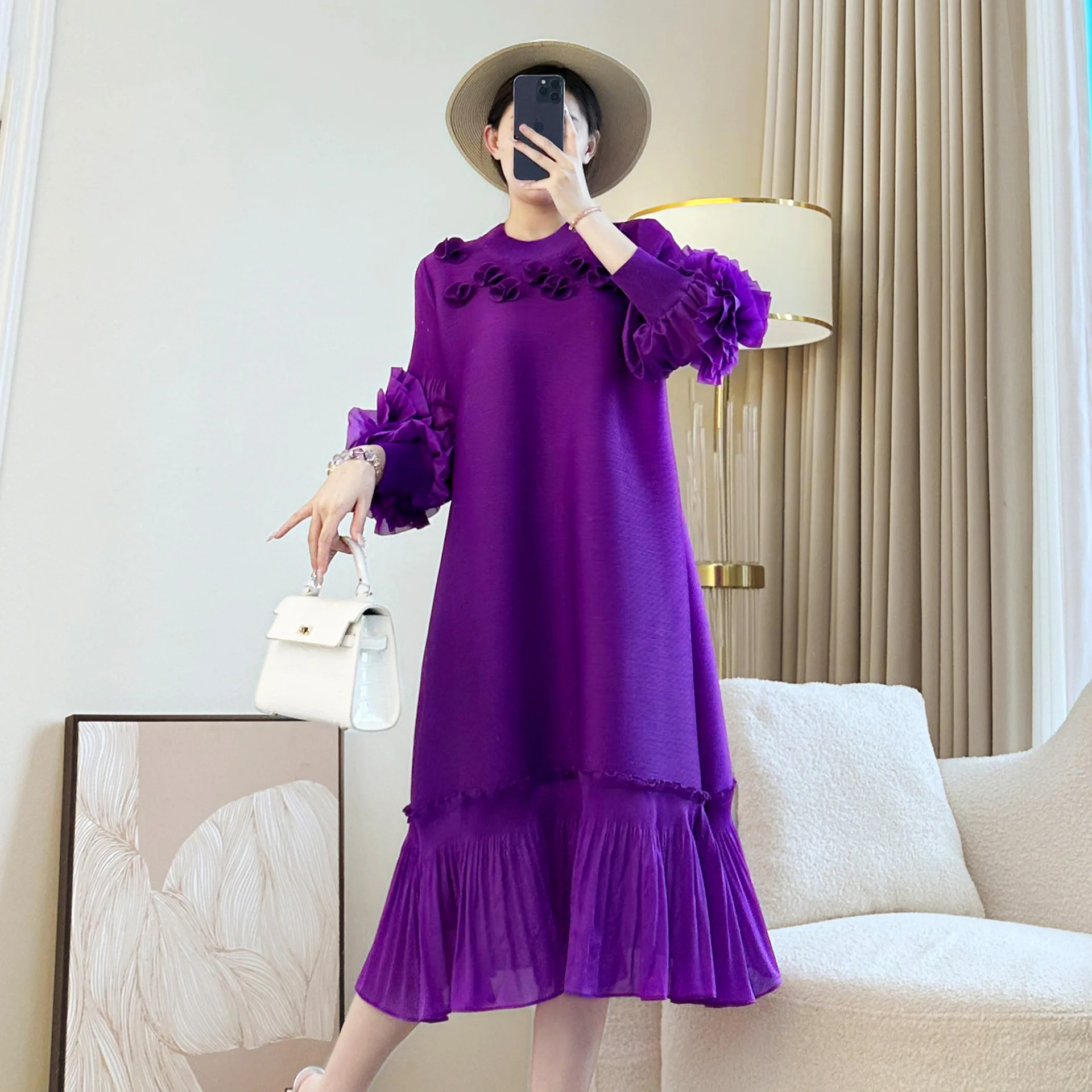 Miyake Women's Pleated Dress with Embroidered Design Elegant Casual Style Long Sleeve and European American Fashion Plus Size