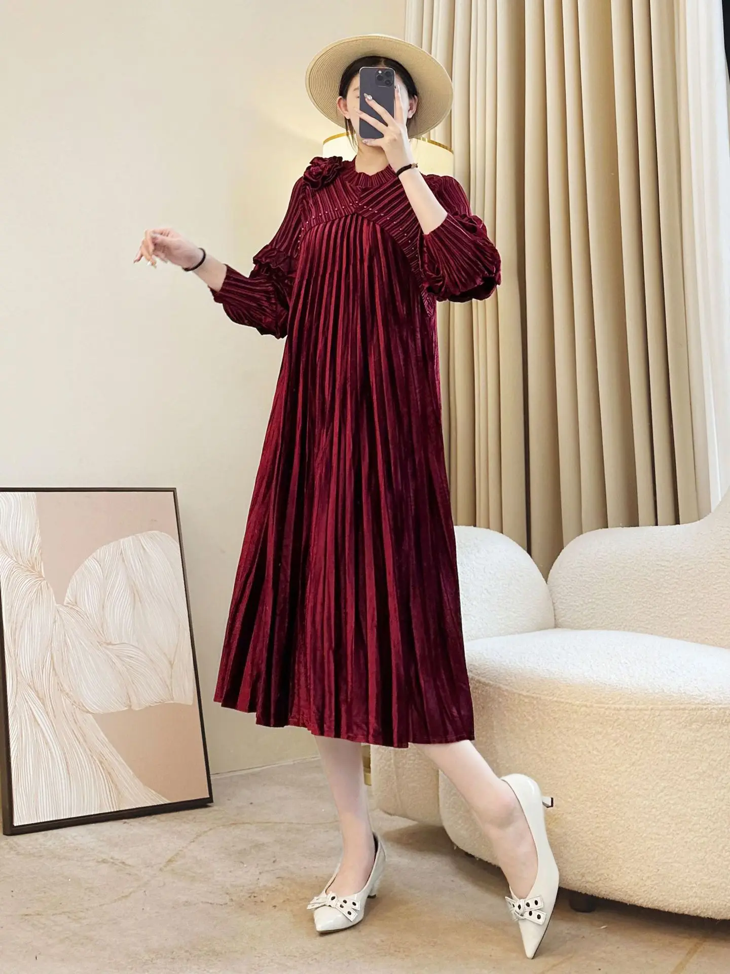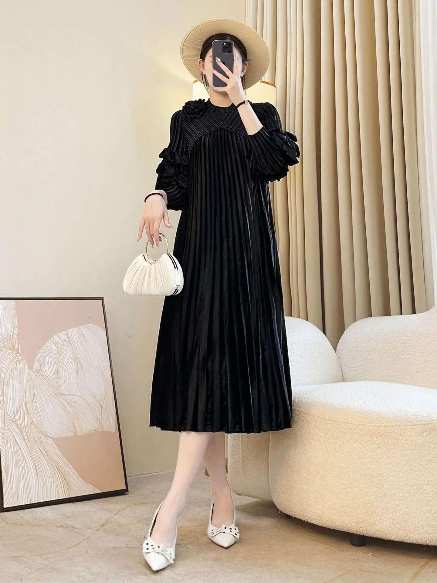 High-End Gold Velvet Miyake Pleated Dress with Embroidered Design Factory Wholesale Casual Ladies Dress