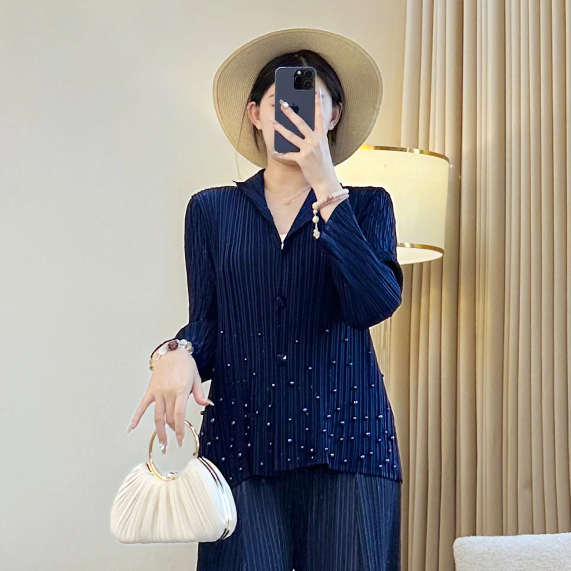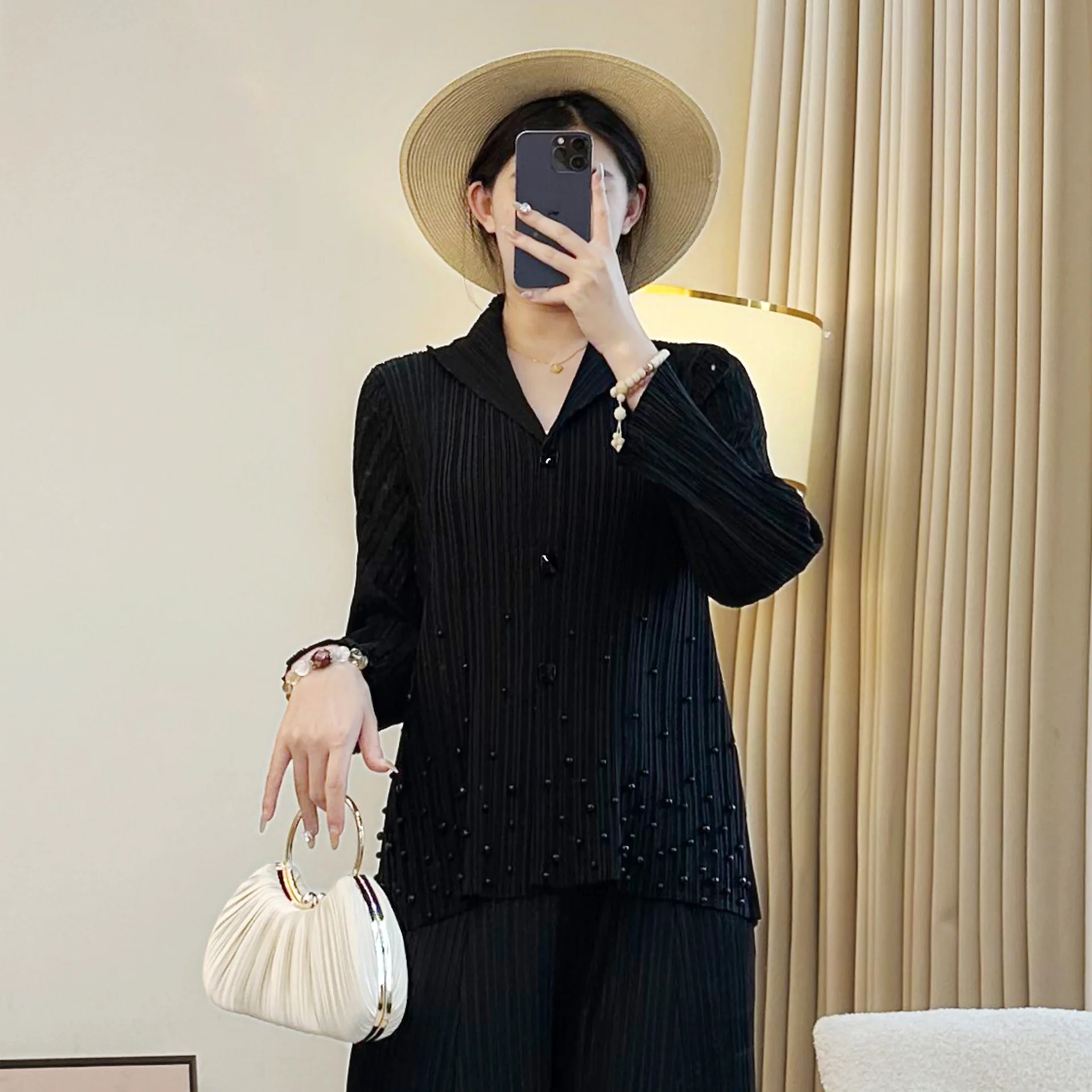 2025 New Pleated Beaded Lapel Jacket for Women Temperament Single-Breasted Cardigan Fashionable Commuting Women's Clothing