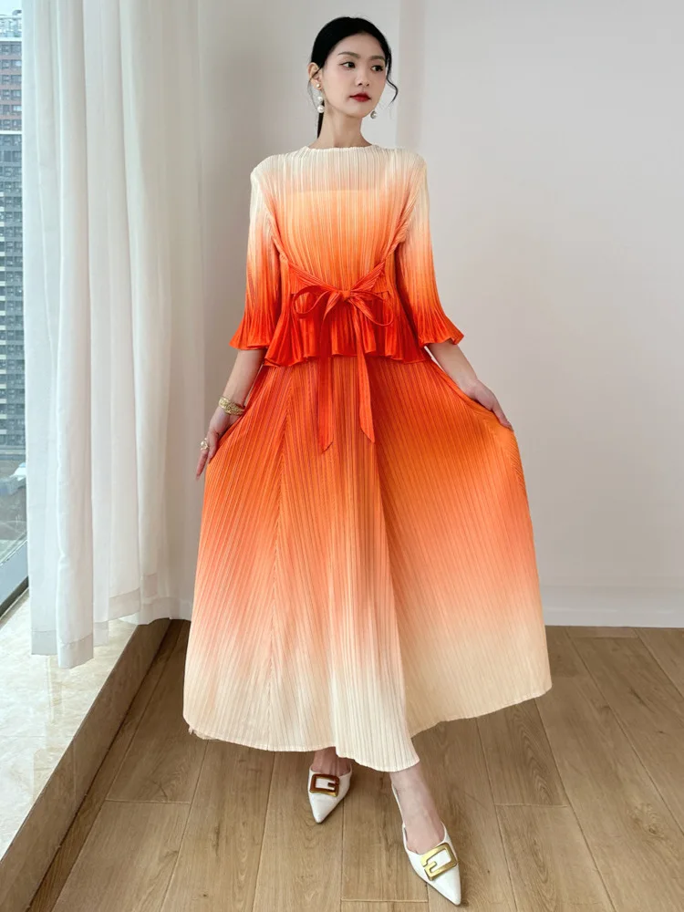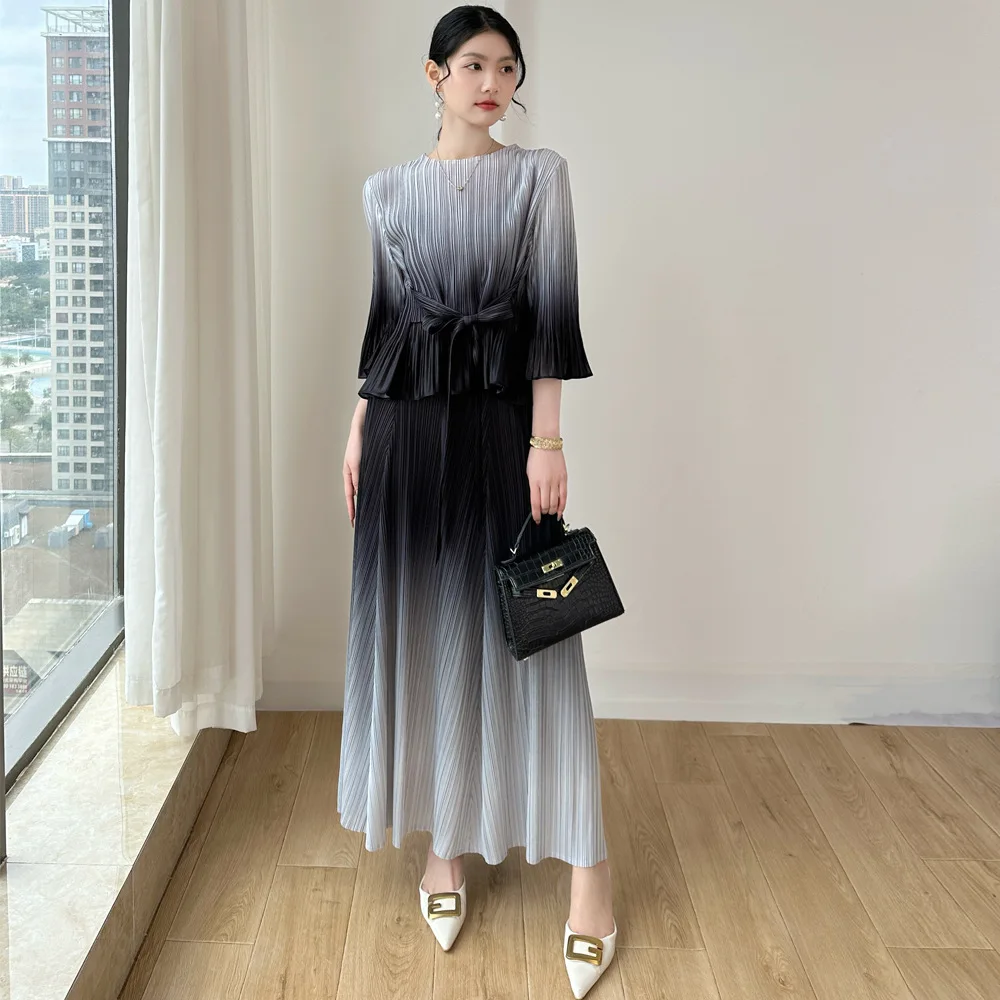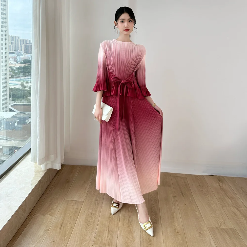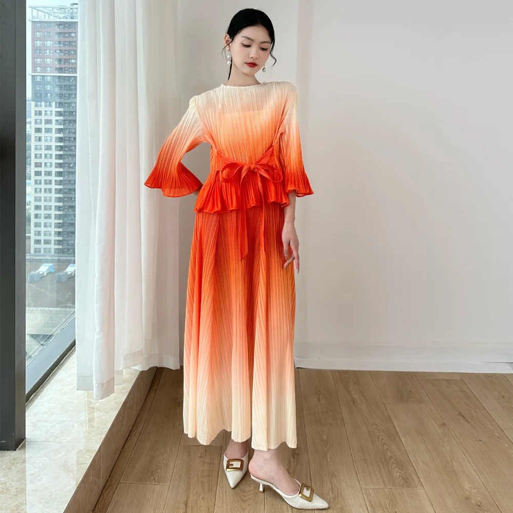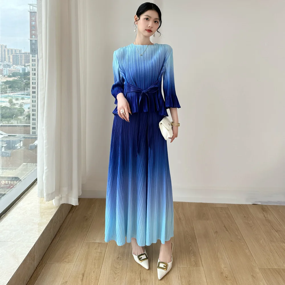 Miyake Gradient Pleated Two-Piece Set: Round Neck Flared Sleeve Top with Wide-Leg Pants Elegant Party Outfit Women's Set