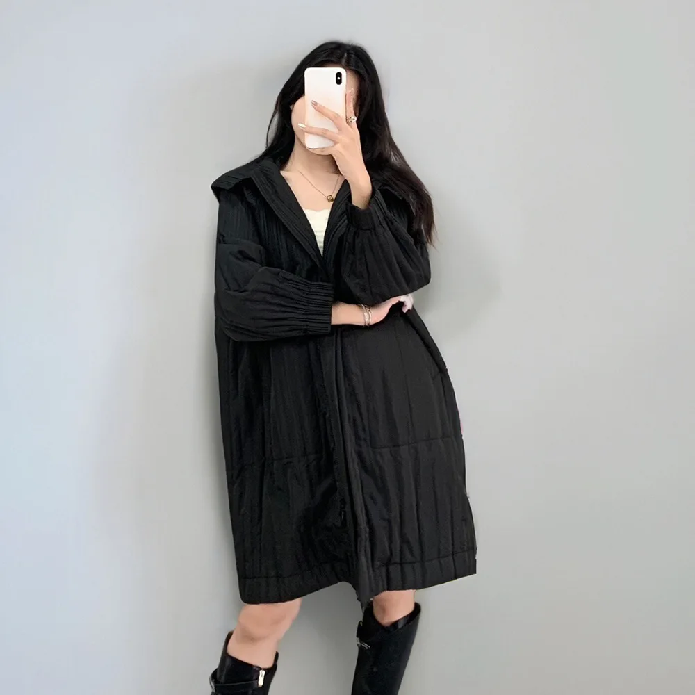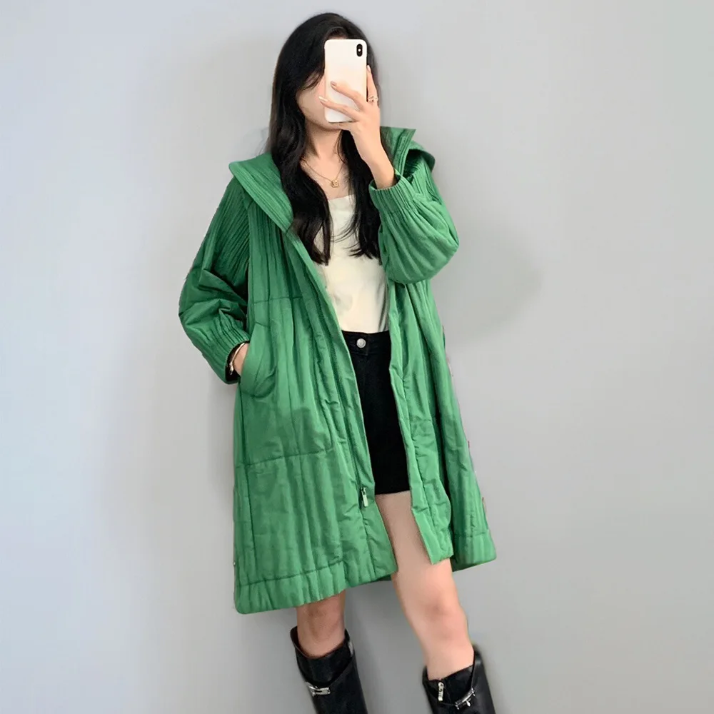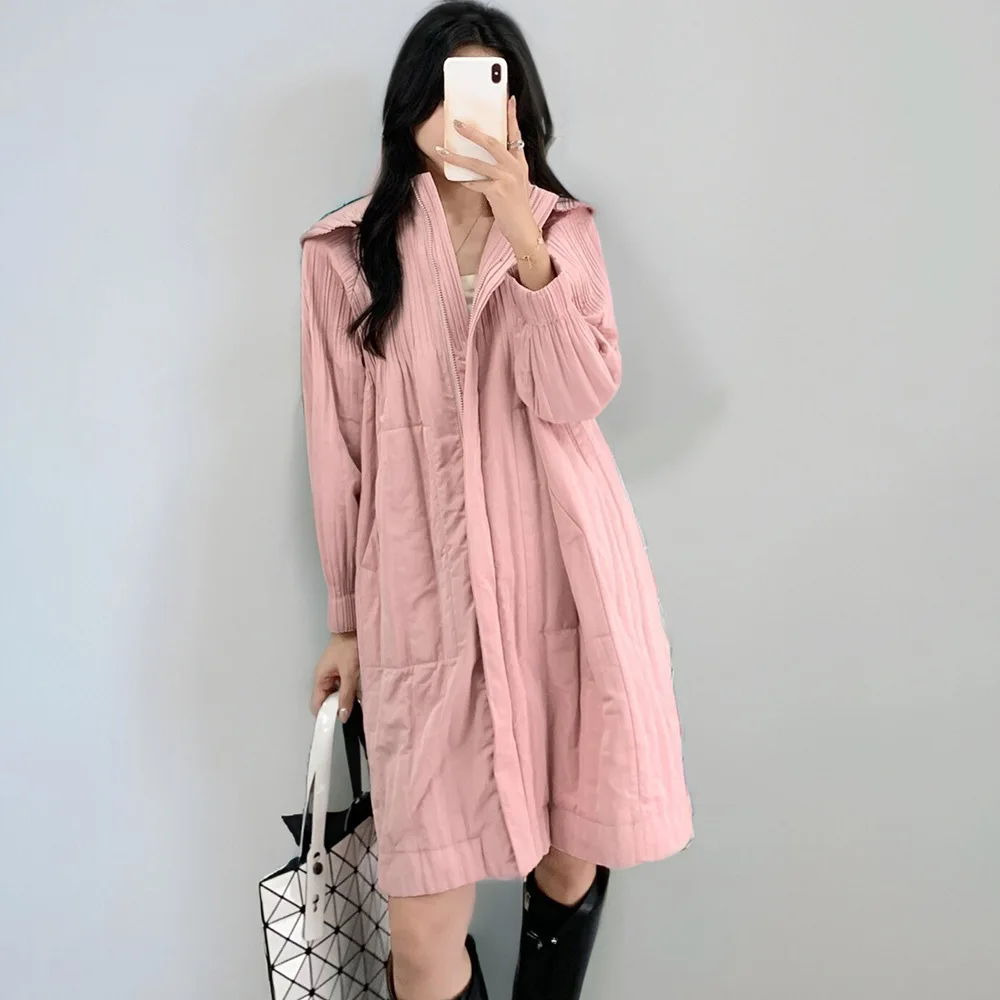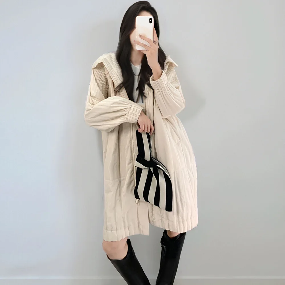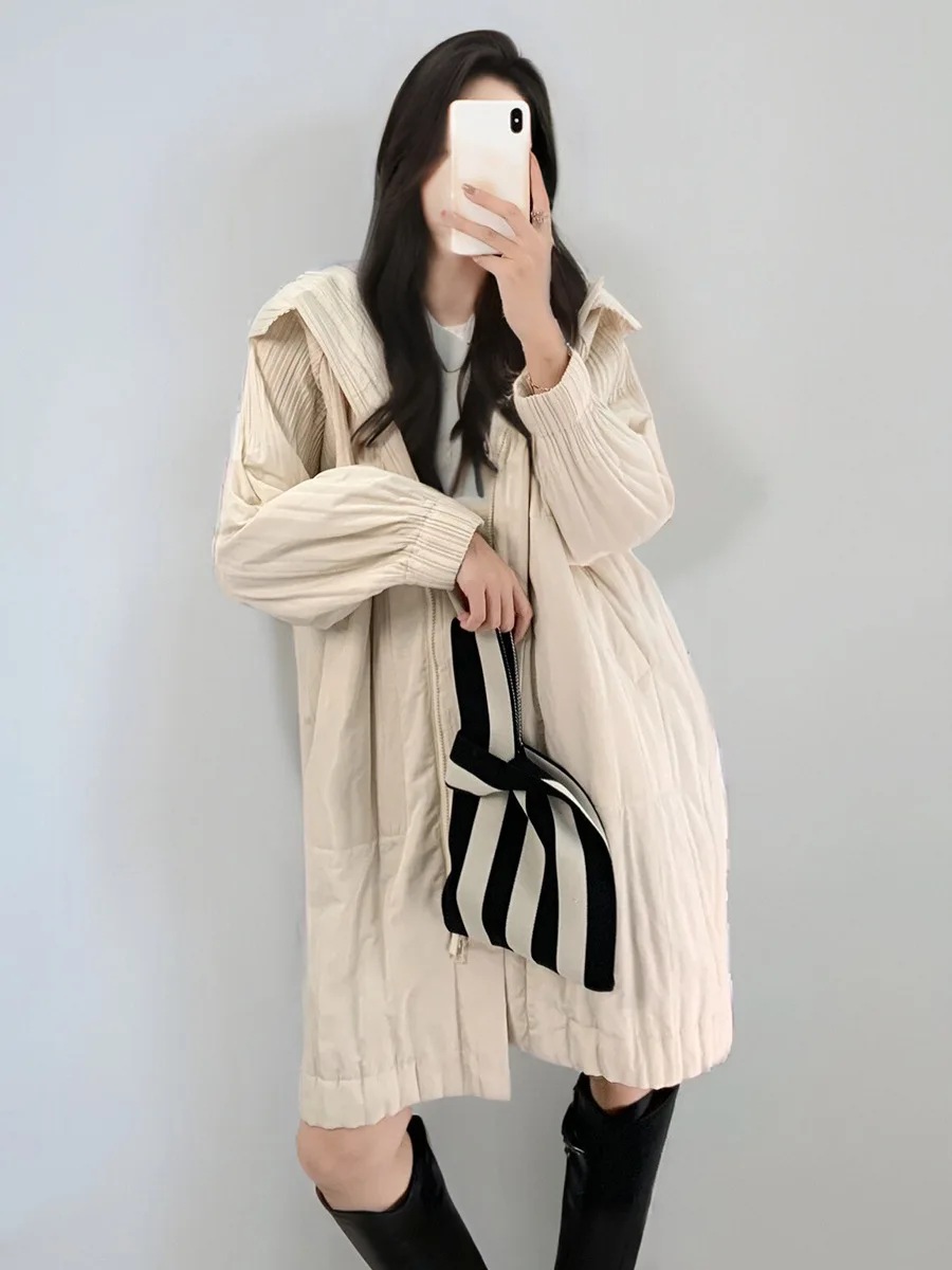 2025 New Women's Casual Mid-Length Winter Coats Thick Warm Pleated Design Waterproof Zipper Outerwear Hooded Pattern Polyester