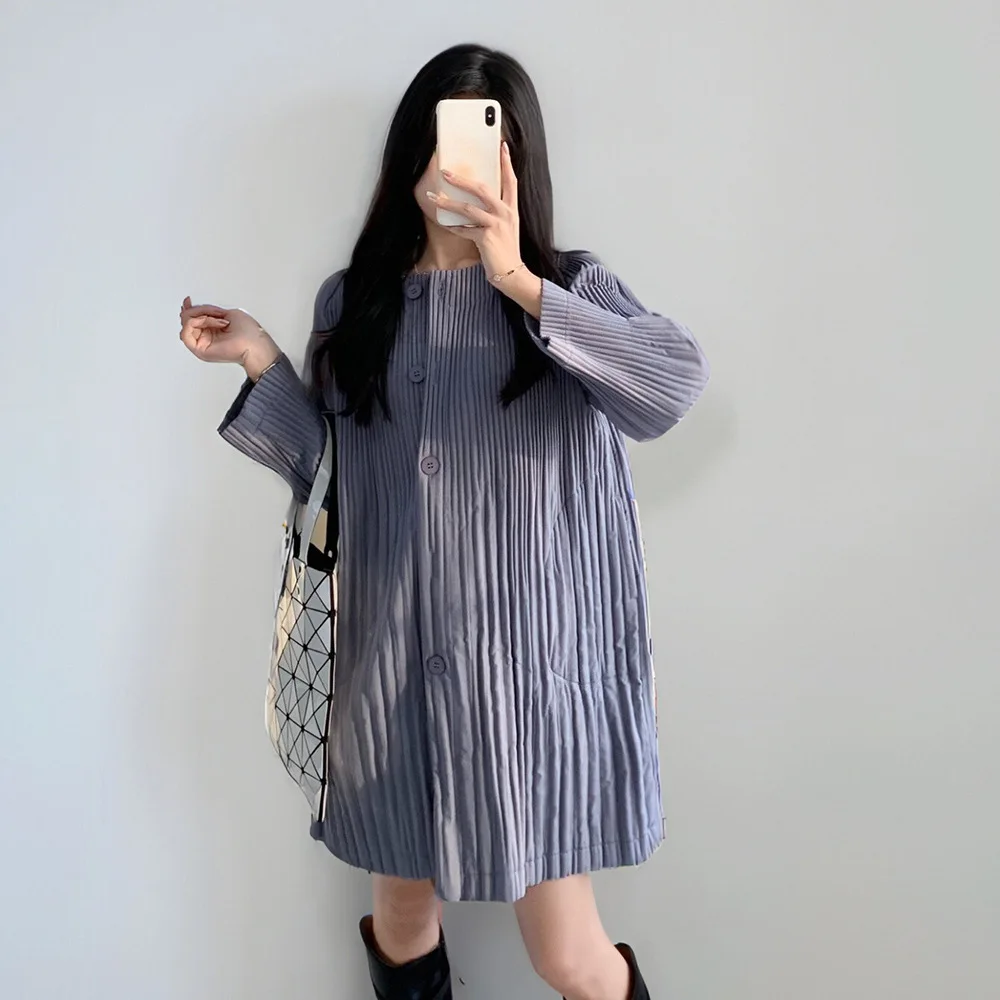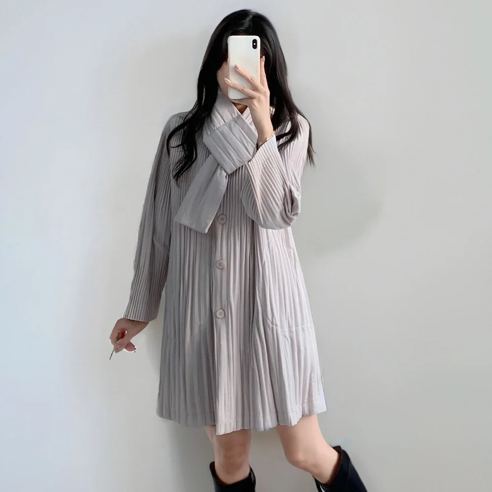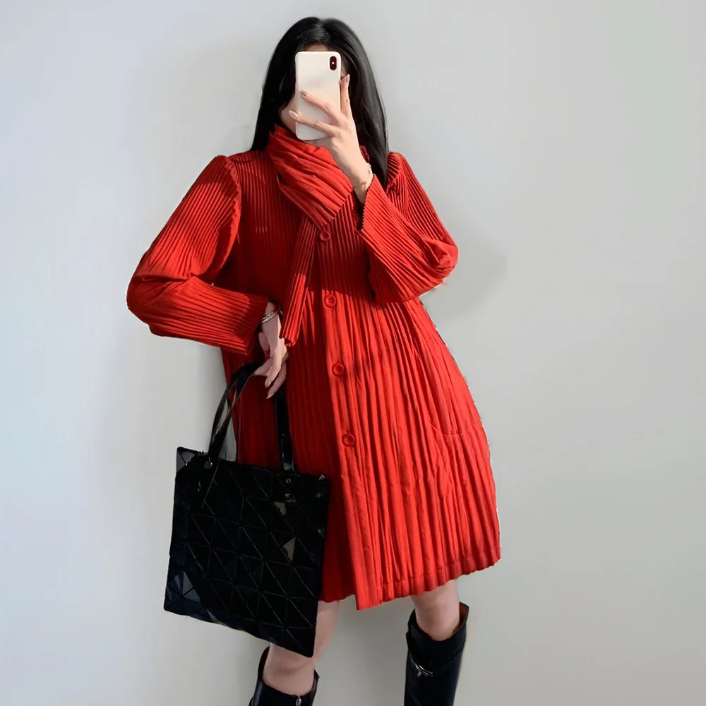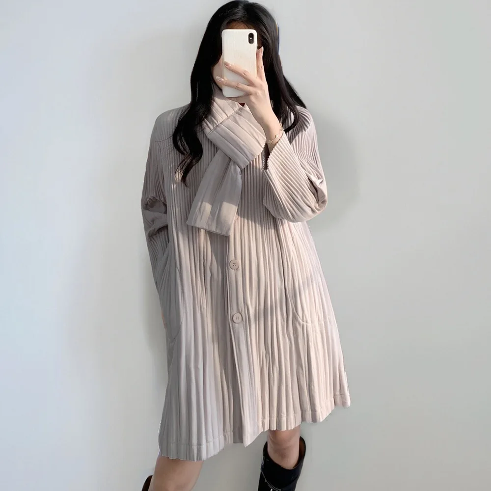 2024 Winter New Pleated Design Spliced Lapel Loose Casual Long Length Coat for Women Thickened Cotton Pleated Jacket Polyester