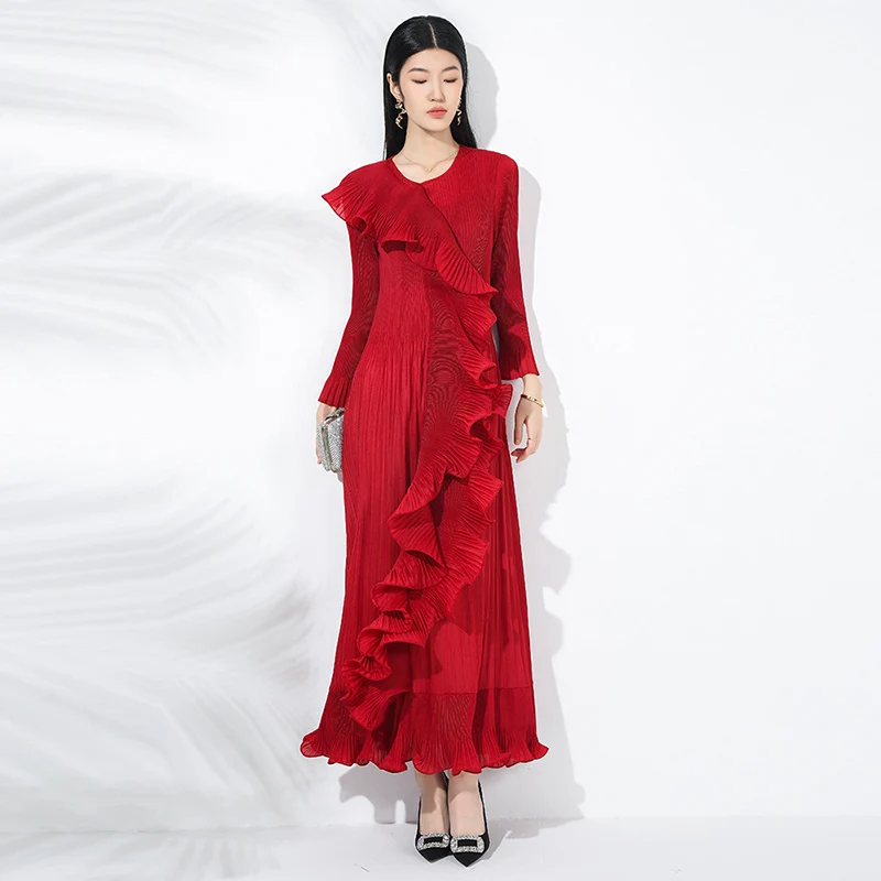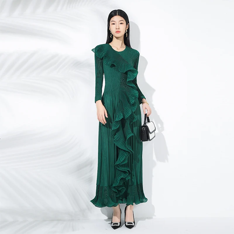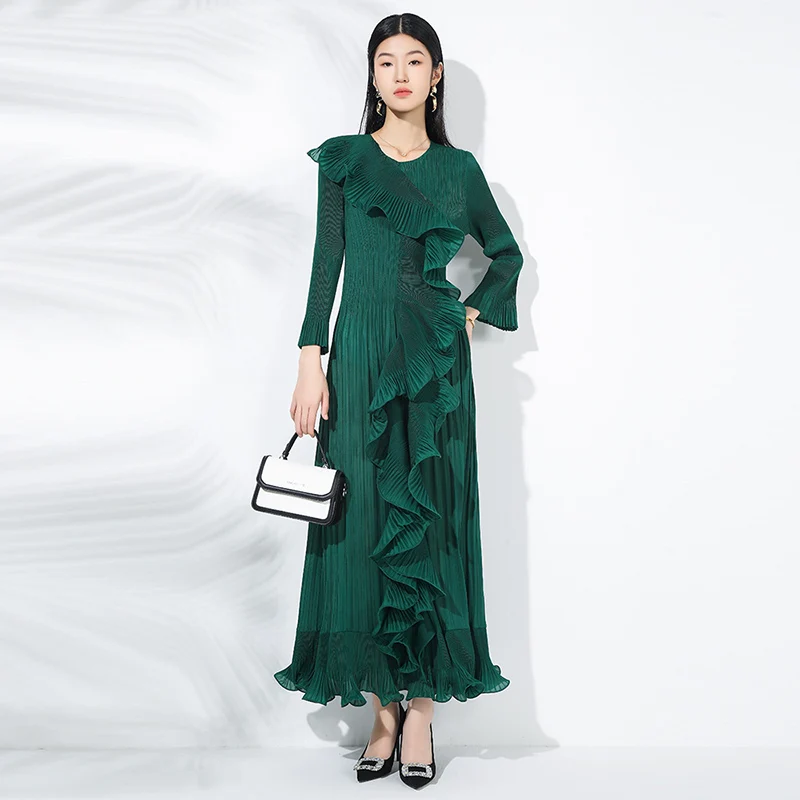 Pleated Clothing Supplier 2025 Latest Design Pleated Ruffled Maxi Dress Ladies Irregular Layered Ruffle Woven Casual Party Dress