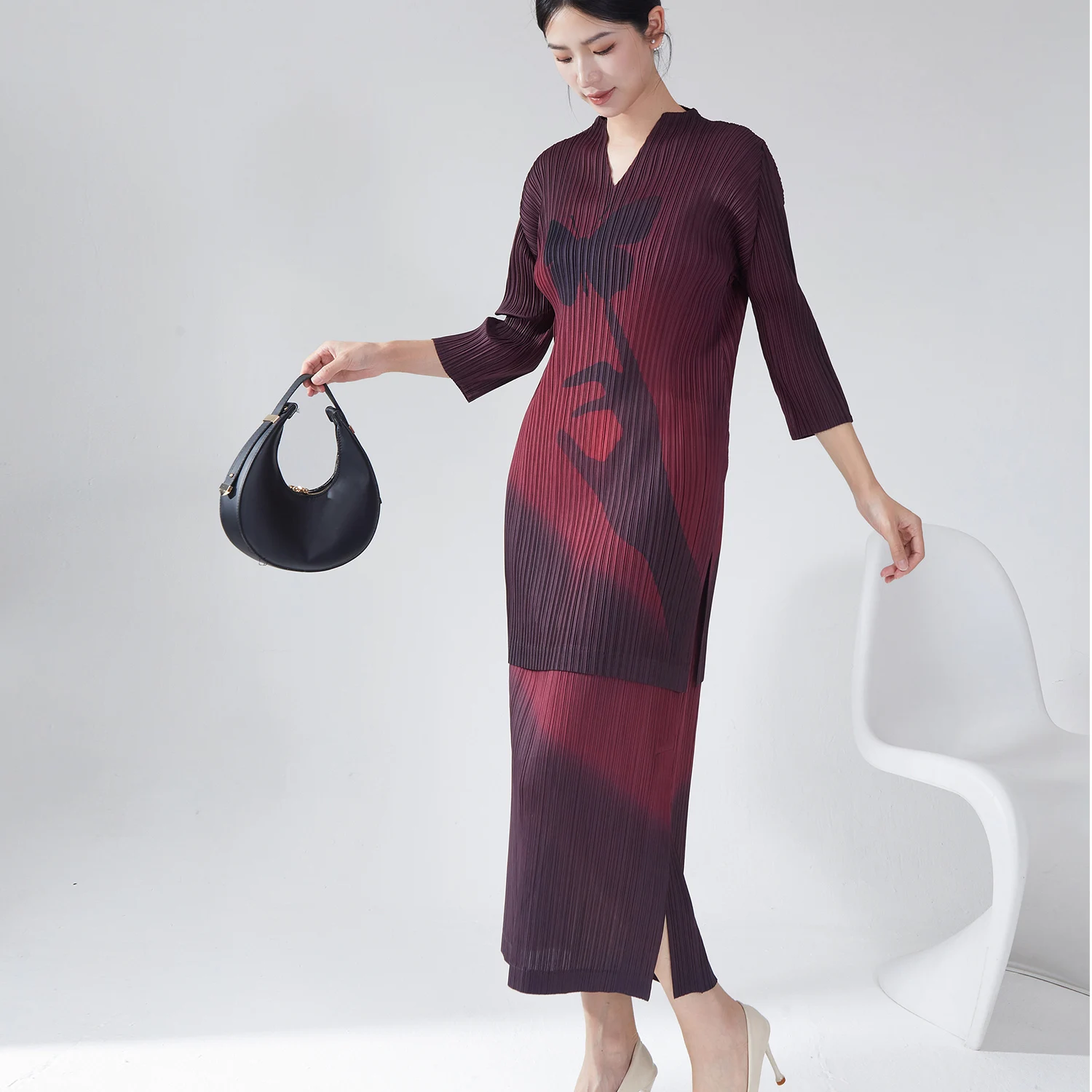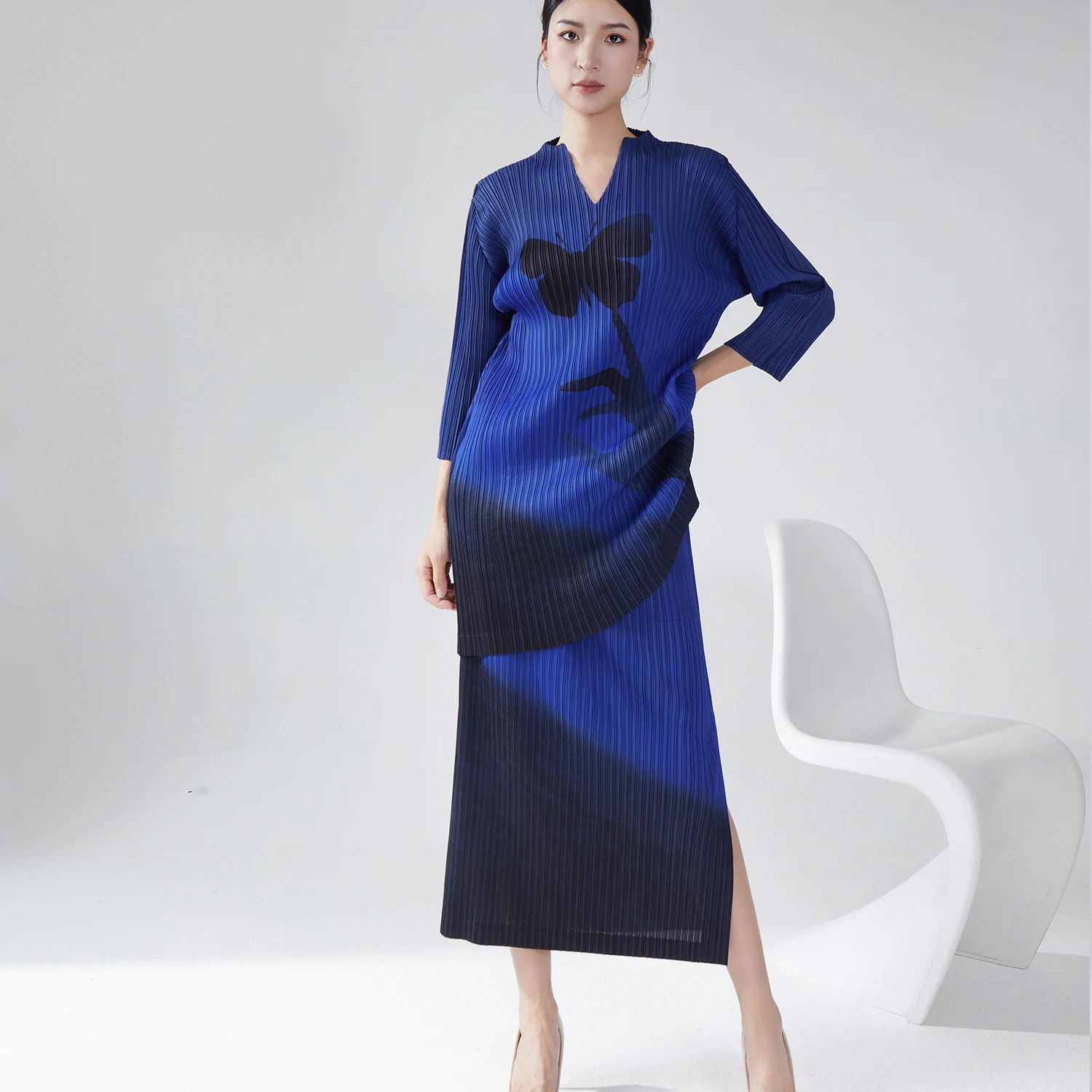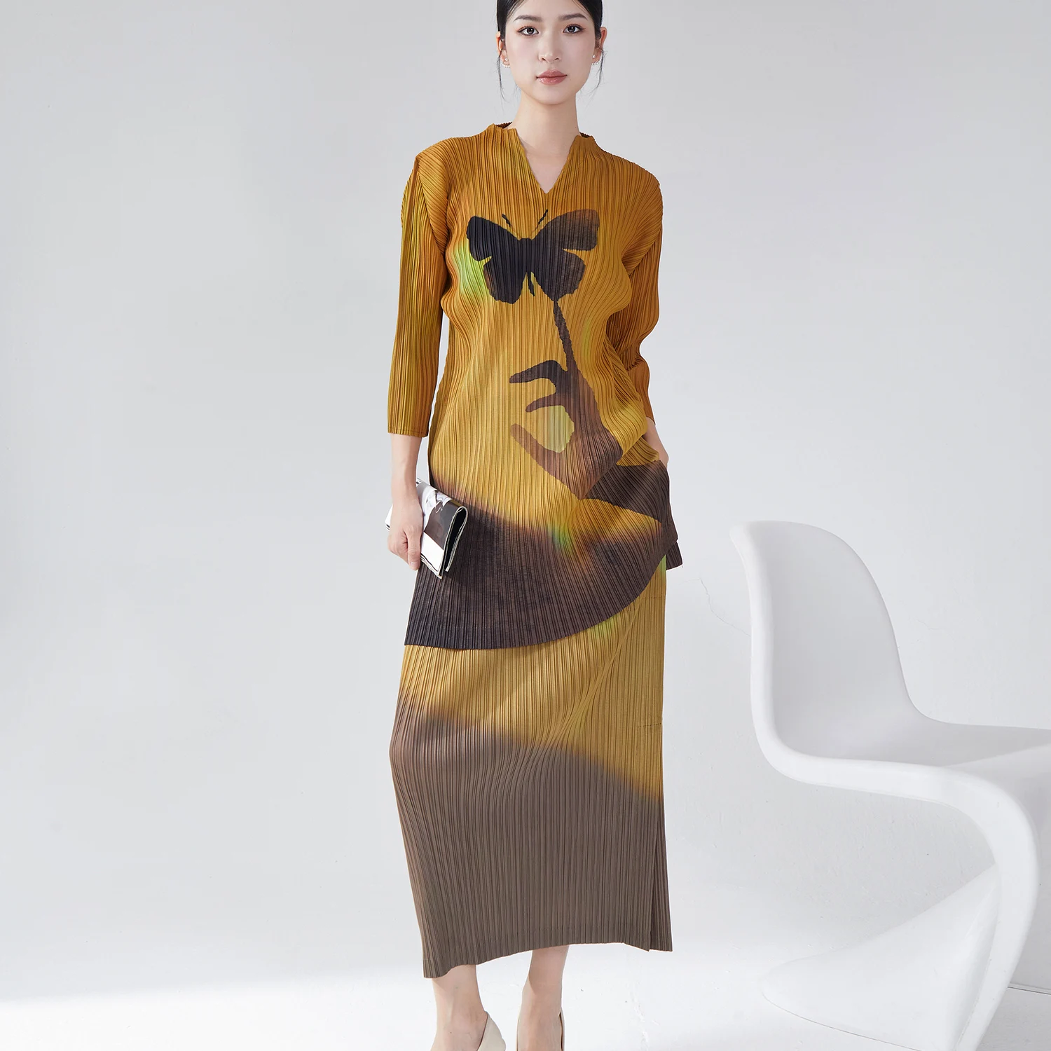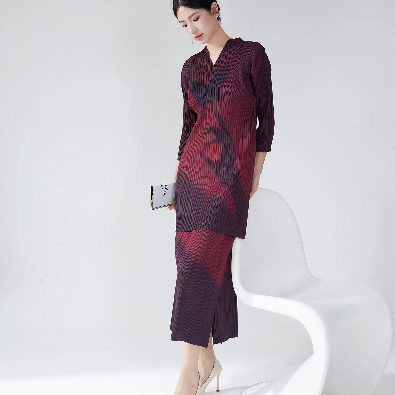 Miyake Casual Printed Pattern Two-Piece Clothing Set Pleated V-Neck Long Shirt Top Straight Midi Skirt Woven Polyester Fitness