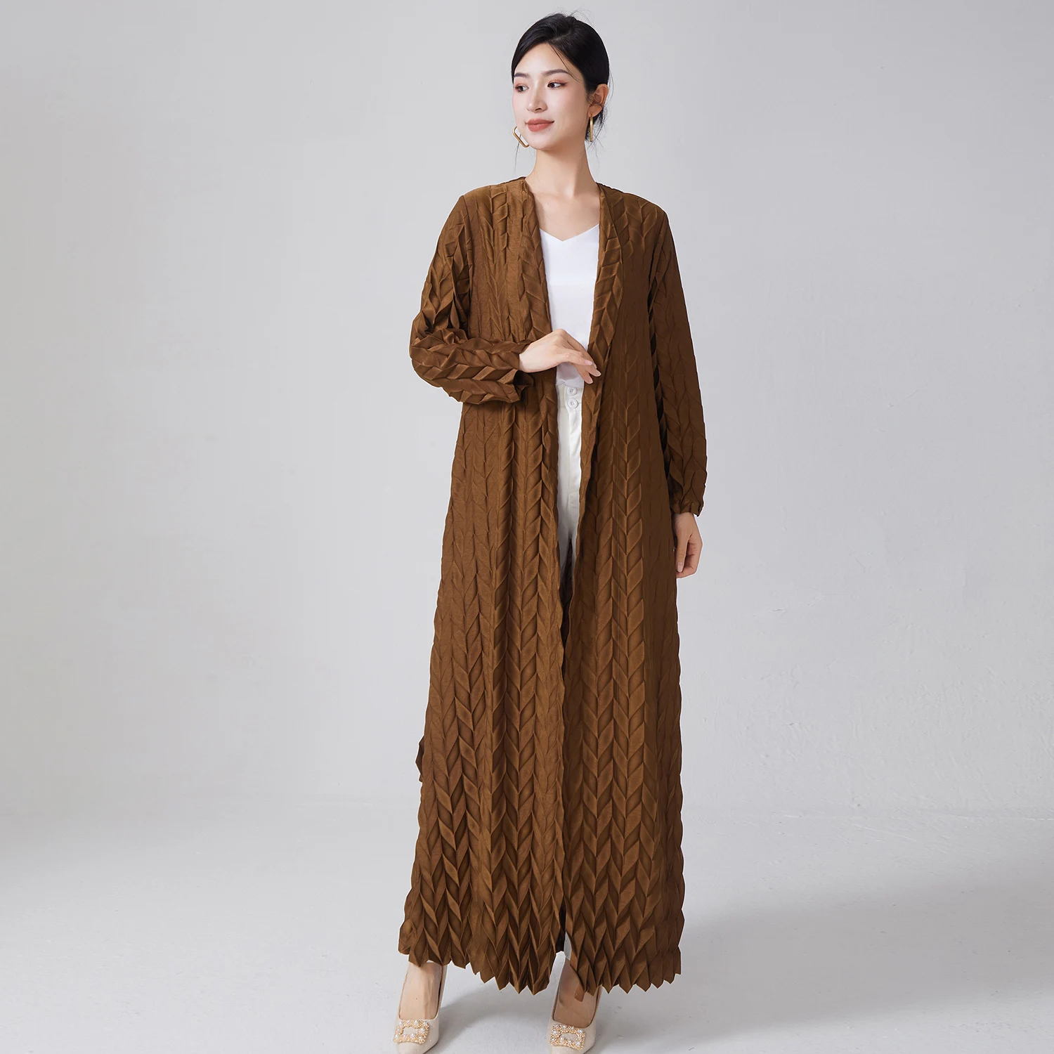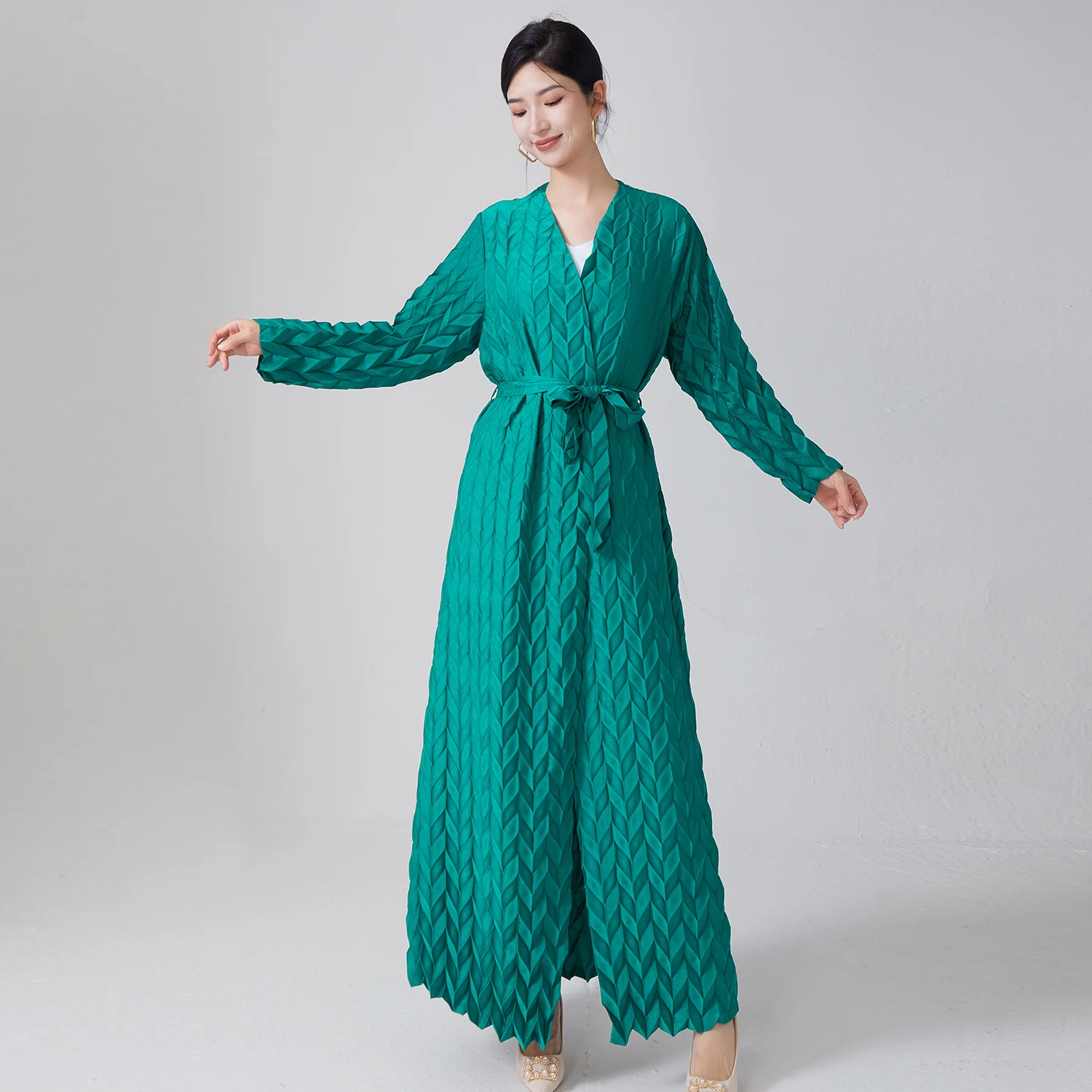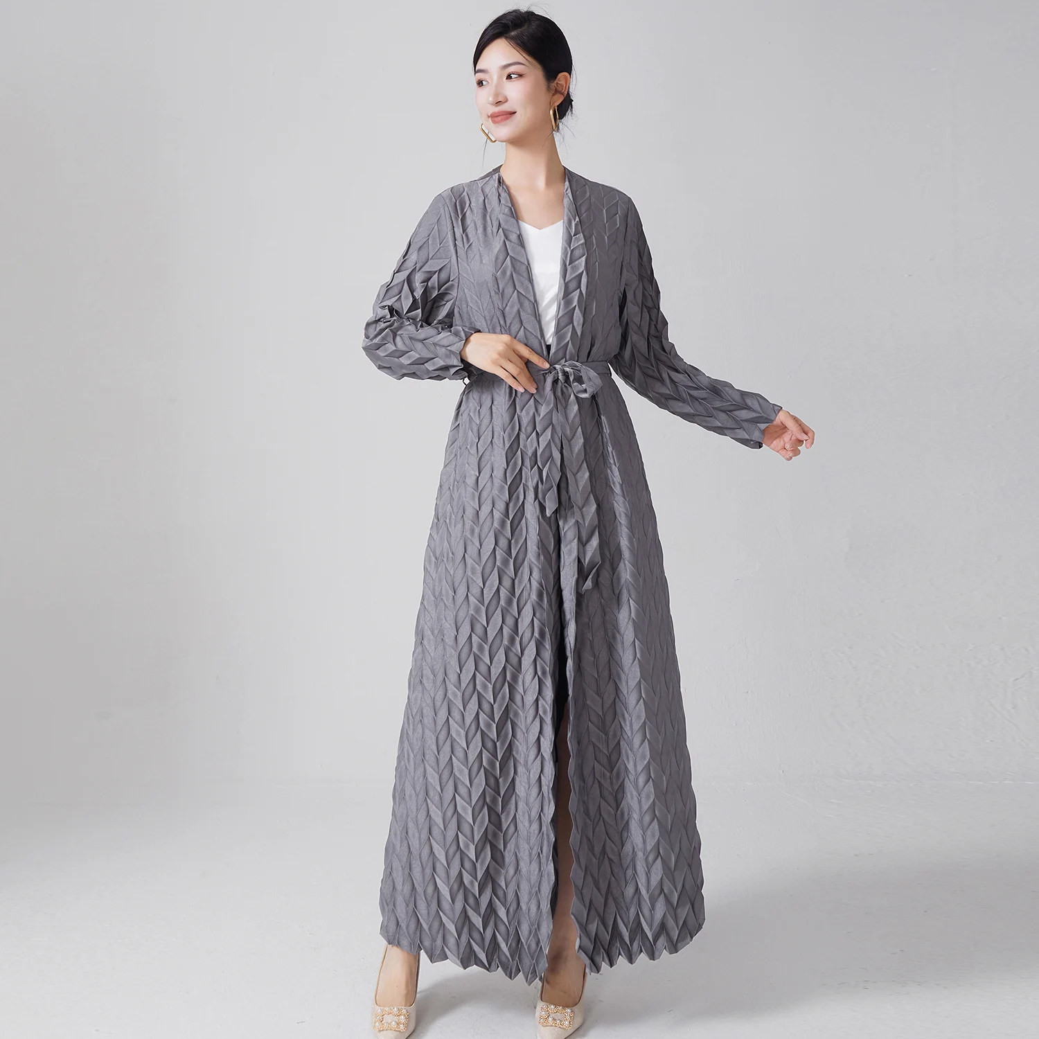2025 Latest Elegant Pleated Abaya Women's Long Cardigan with Belt - Grey Textured Islamic Fashion Robe for Daily Wear
