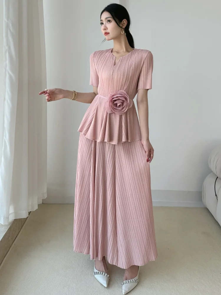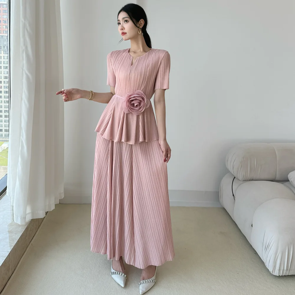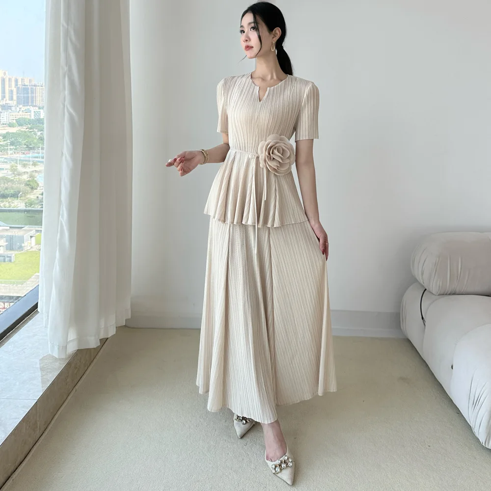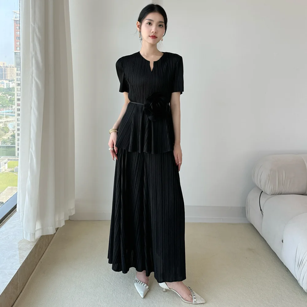 Miyake Pleated Two-Piece Set: Short Sleeve Notch Neck Top with Wide-Leg Pants + Floral Belt Elegant Casual Outfit Women's Set