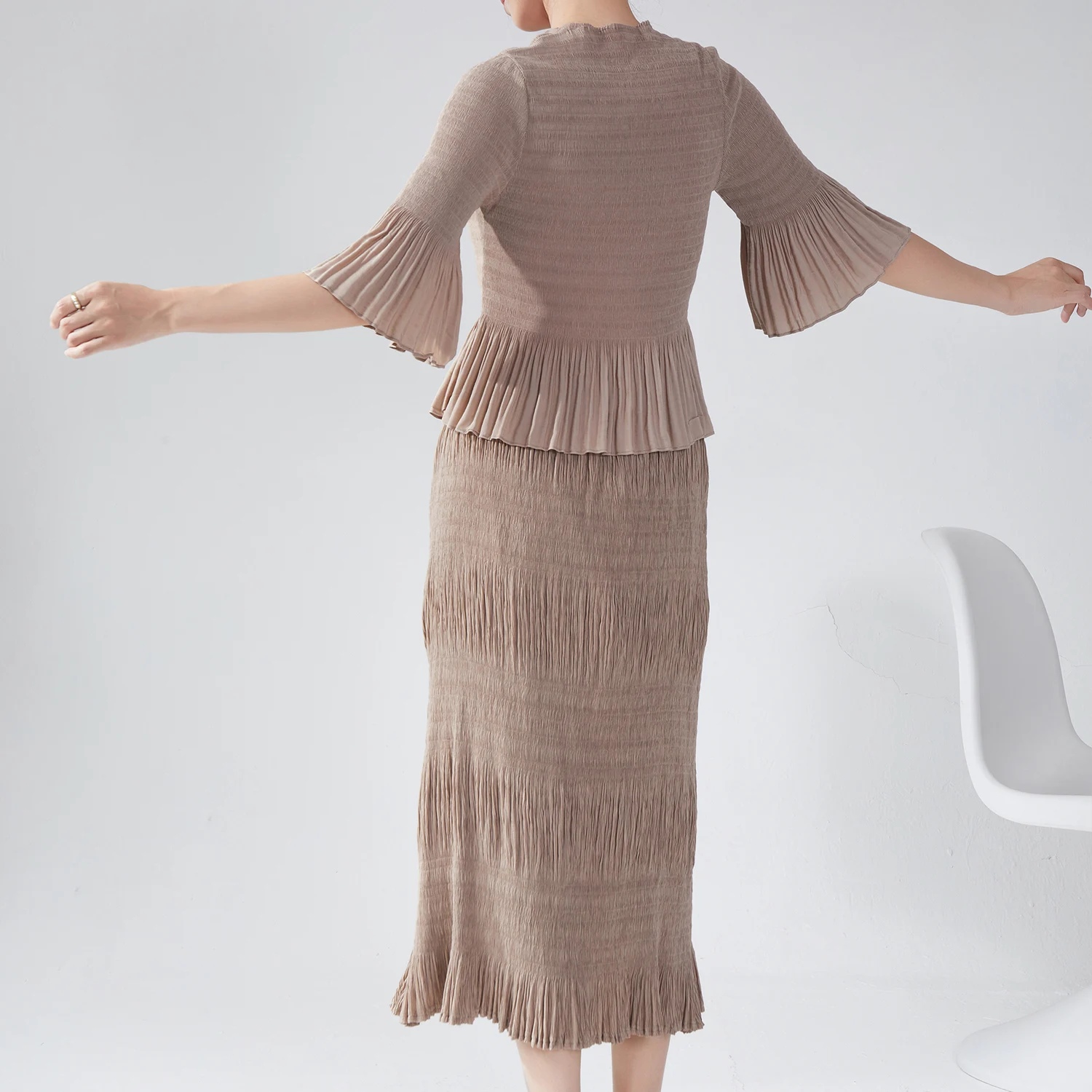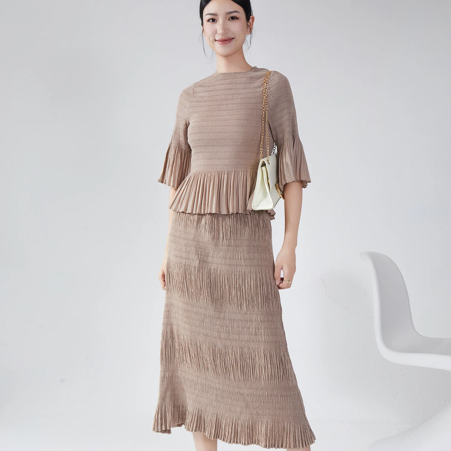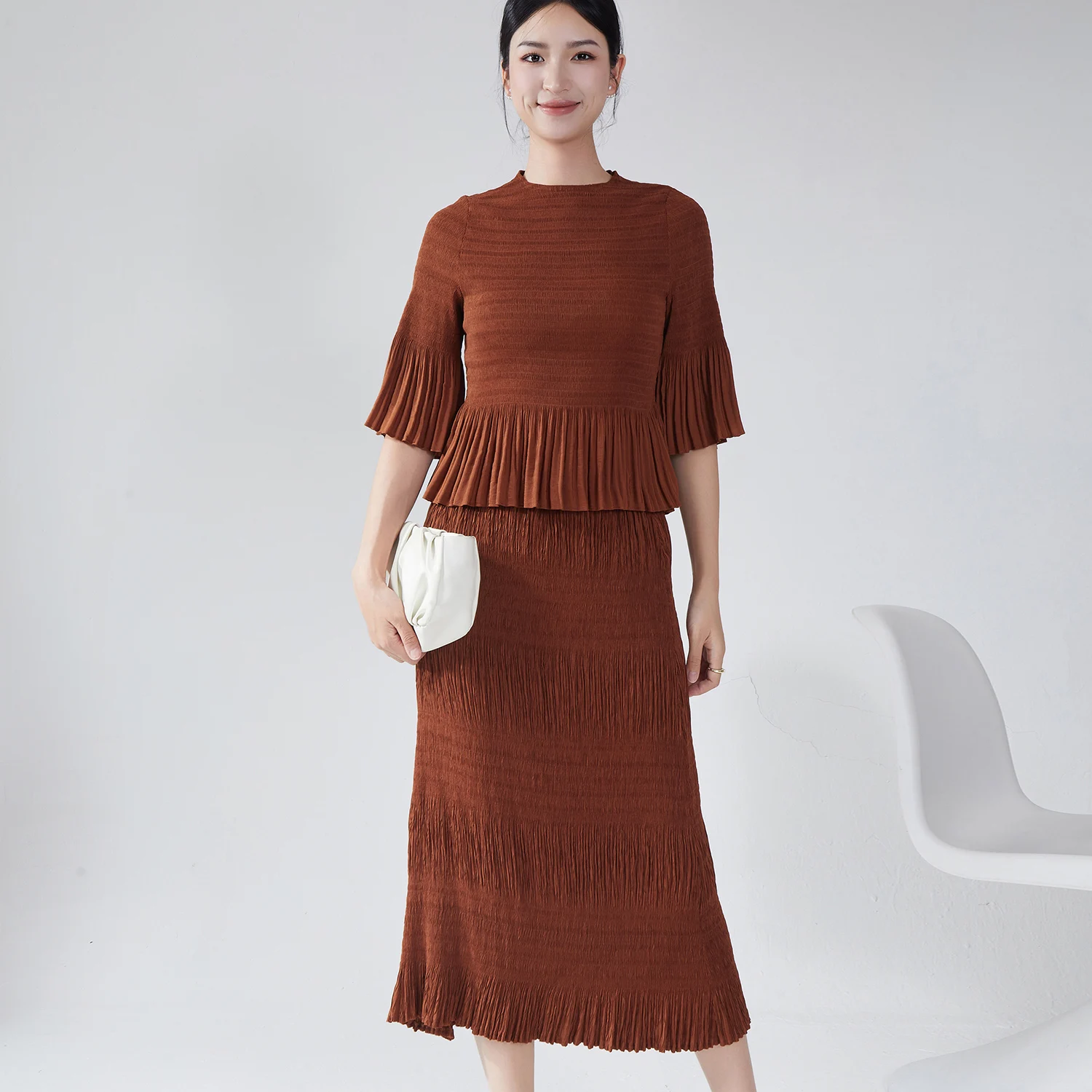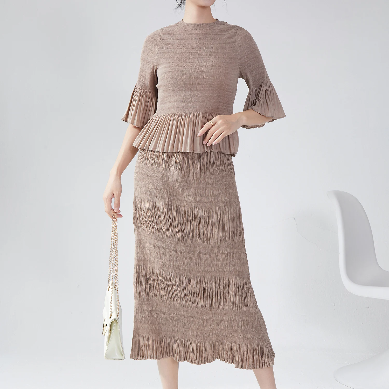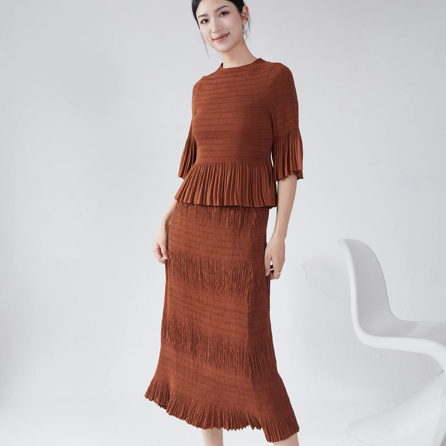 Miyake 2024 Women's Casual Two-Piece Suit Factory Wholesale Print Fabric Top Skirt for Summer Office Wear Pleated Decoration