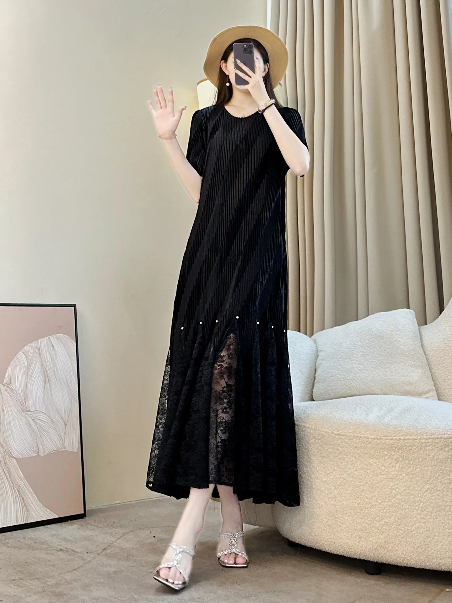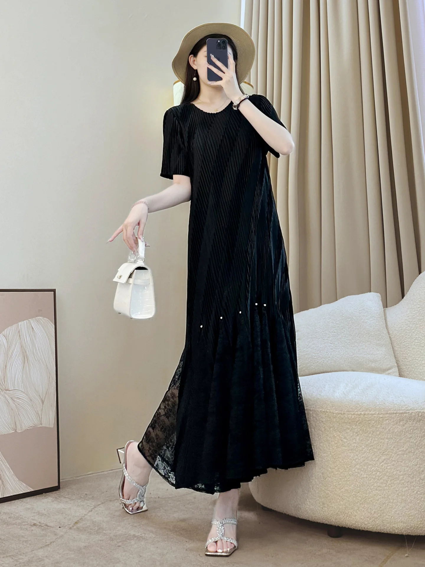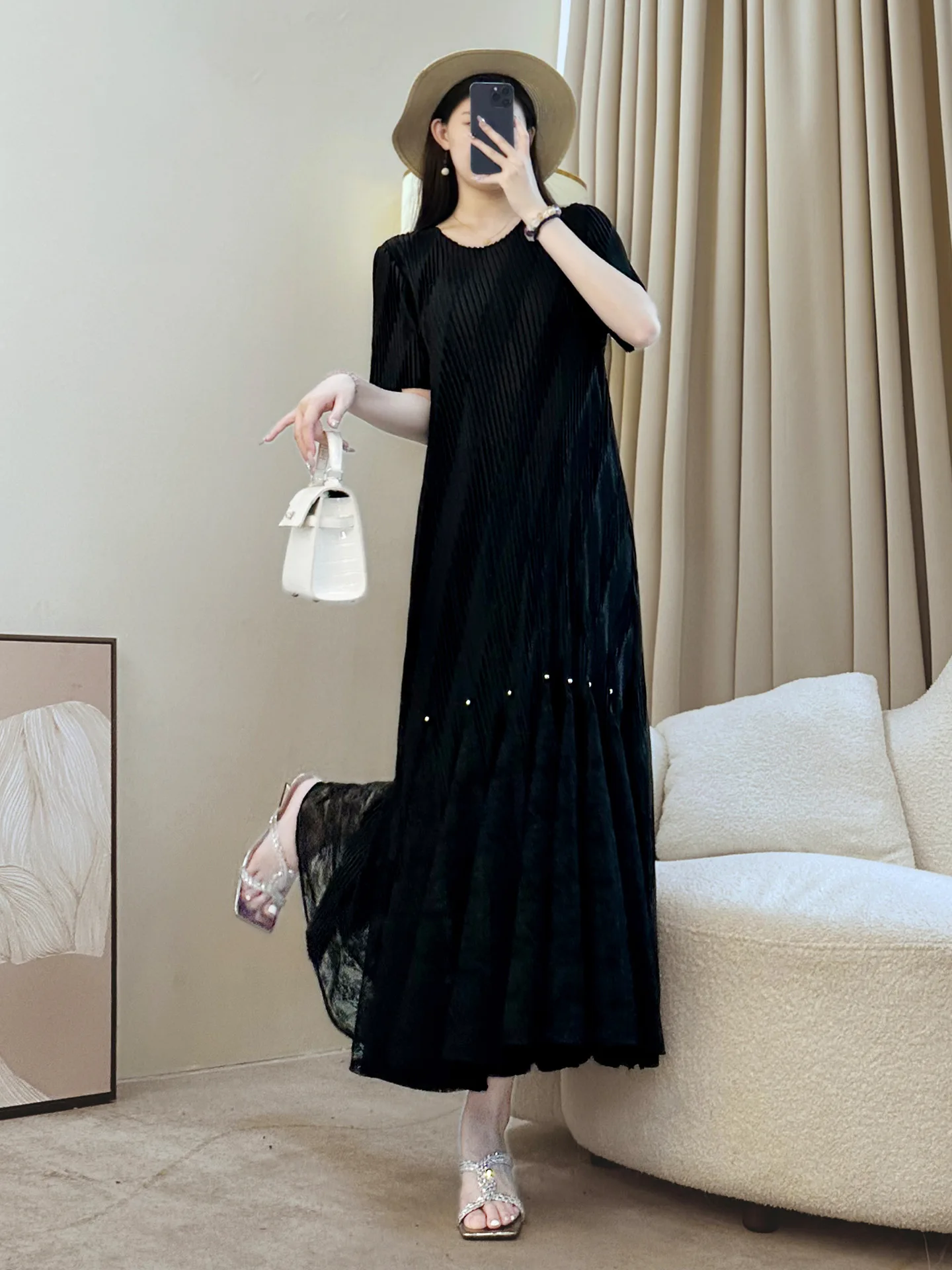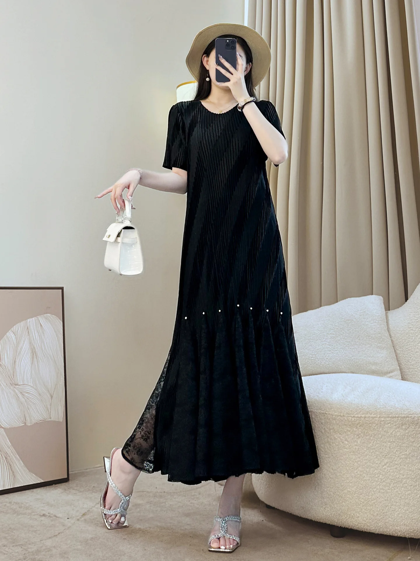 Miyake High-End Women's Casual Dress Elegant Short-Sleeved Pleated Dress for Summer