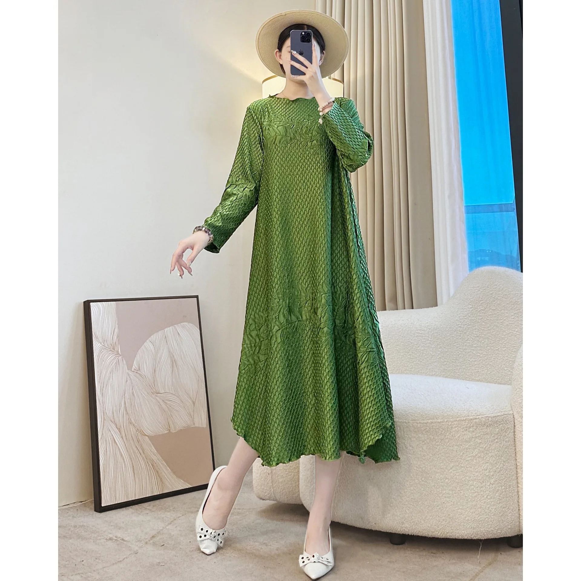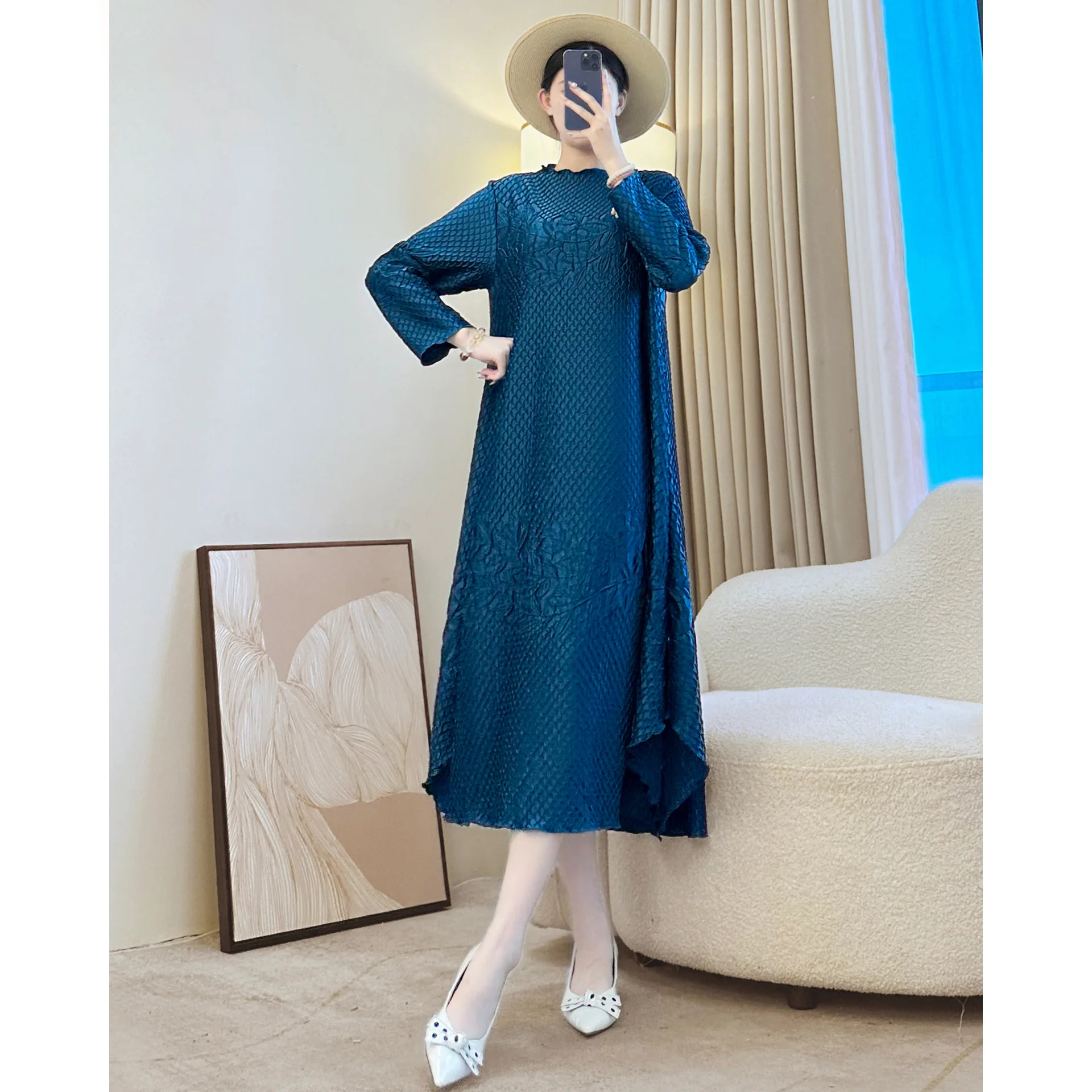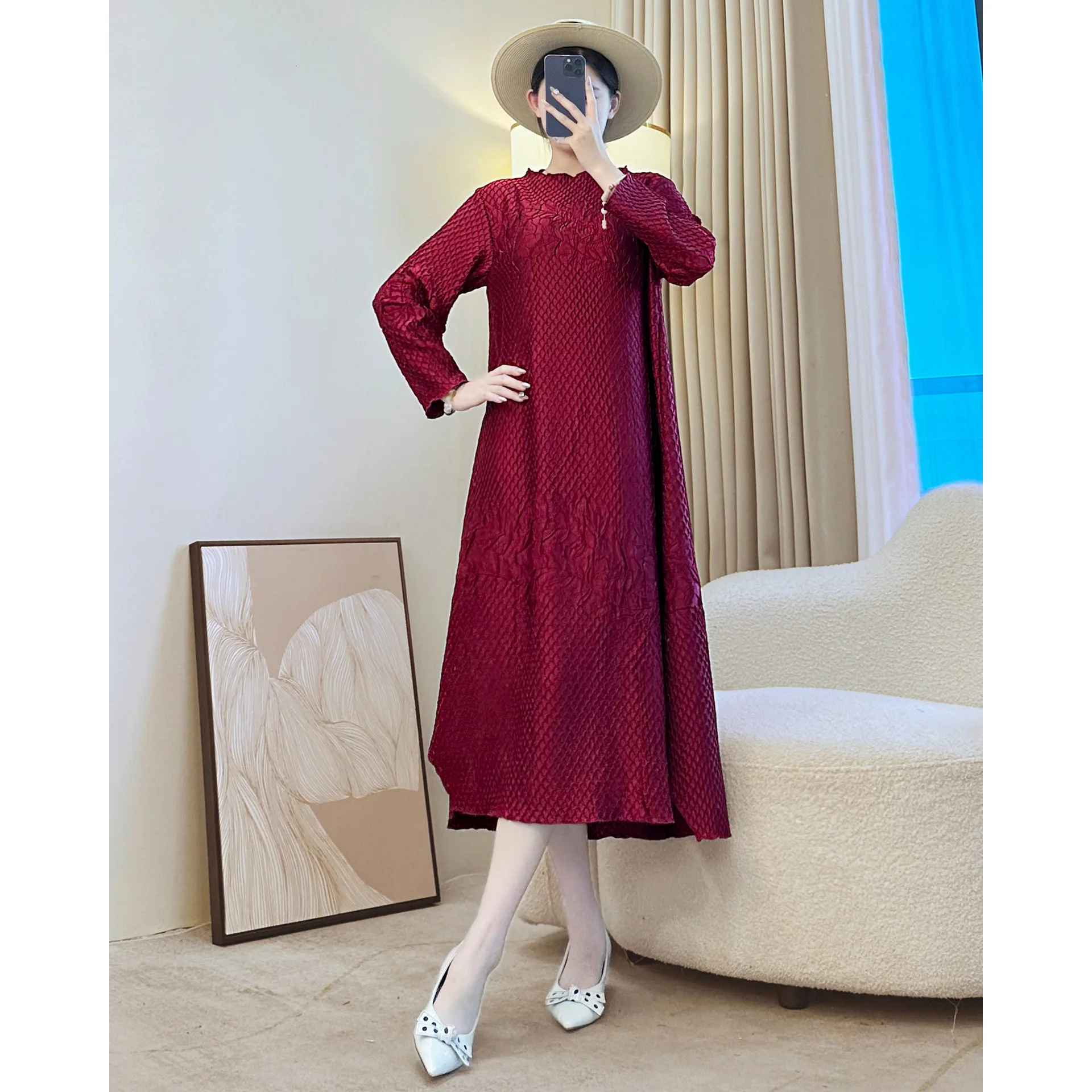2025 Autumn Miyake Sweet Style Embroidered Loose Casual Dress for Women Pleated Dress