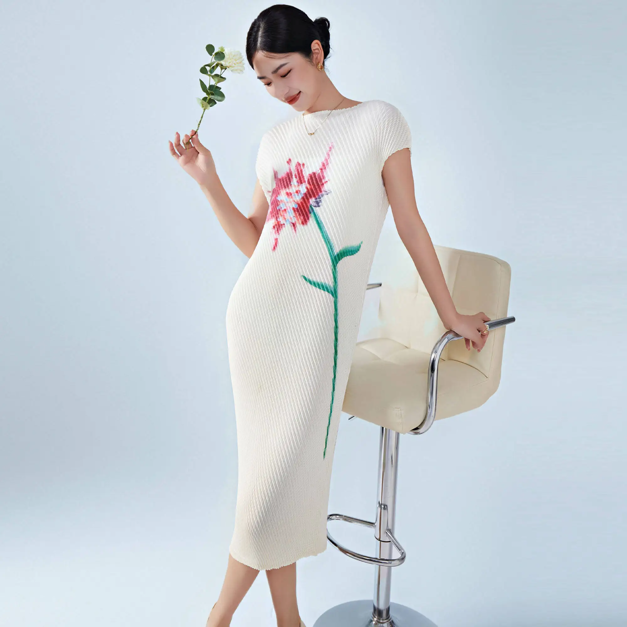 Miyake Pleated Sleeveless Elegant Design Dress New Arrival Stretchy Floral Print Casual Women's Dresses