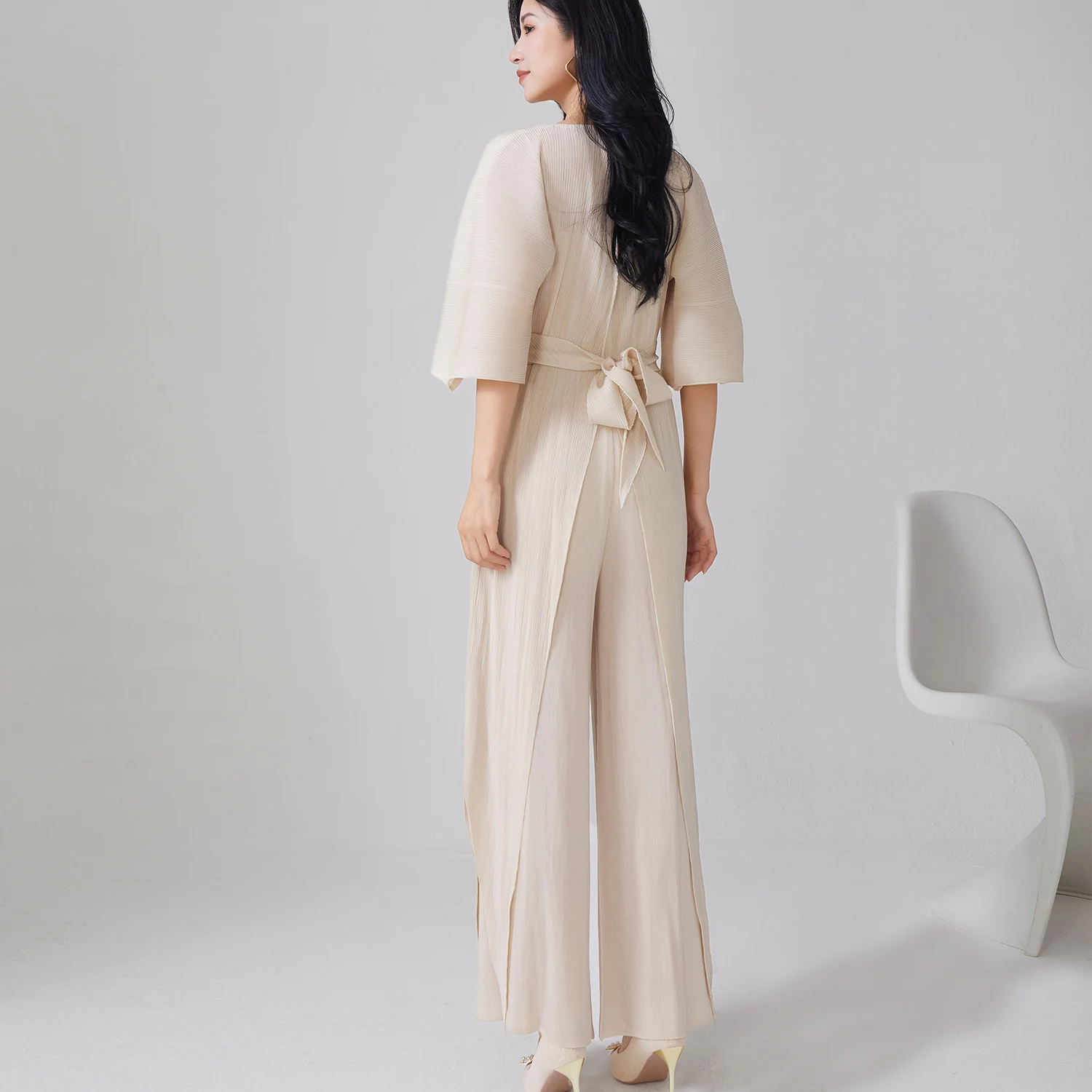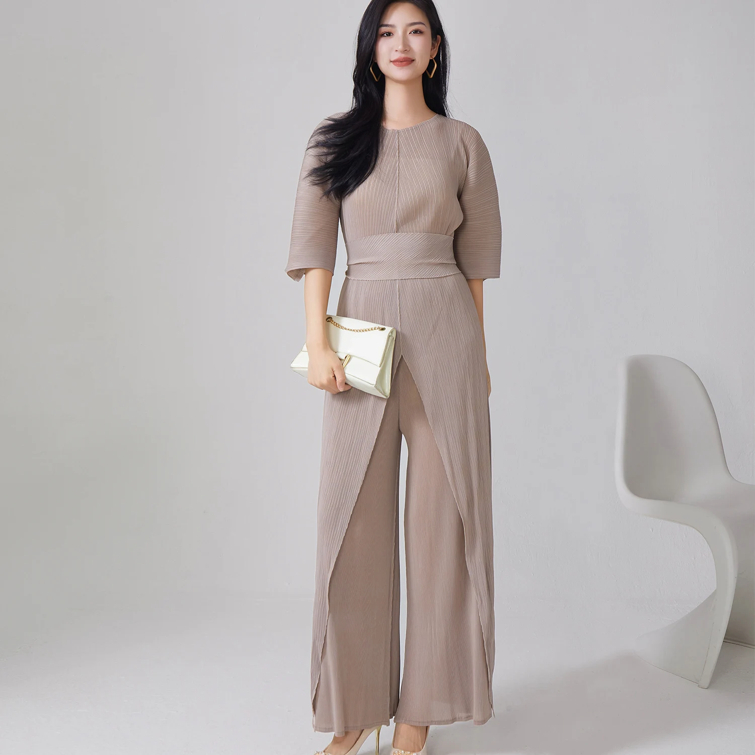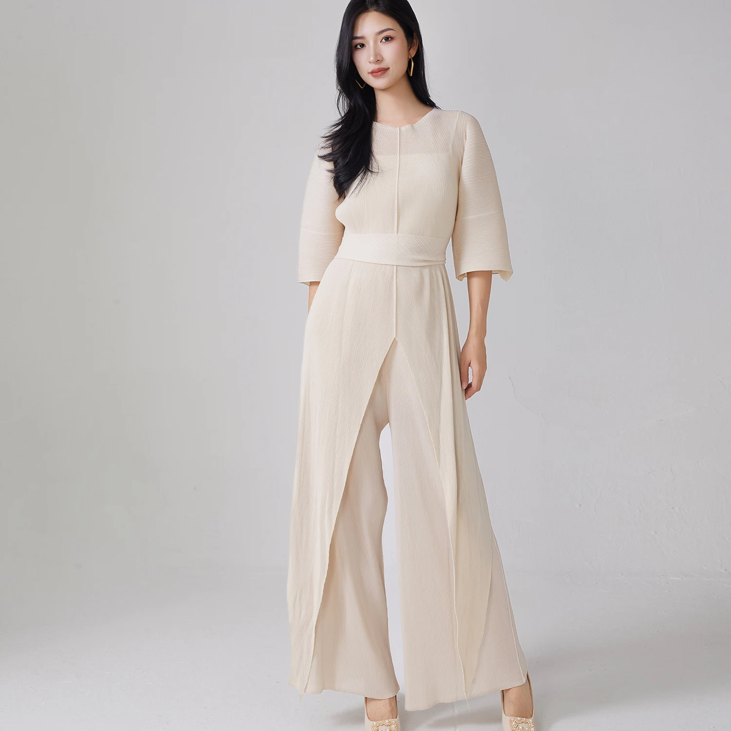 Women's Miyake Pleated Two-Piece Jumpsuit Set - Irregular Elegant Wide Leg Jumpsuit with Waist Belt for Office & Party Wear