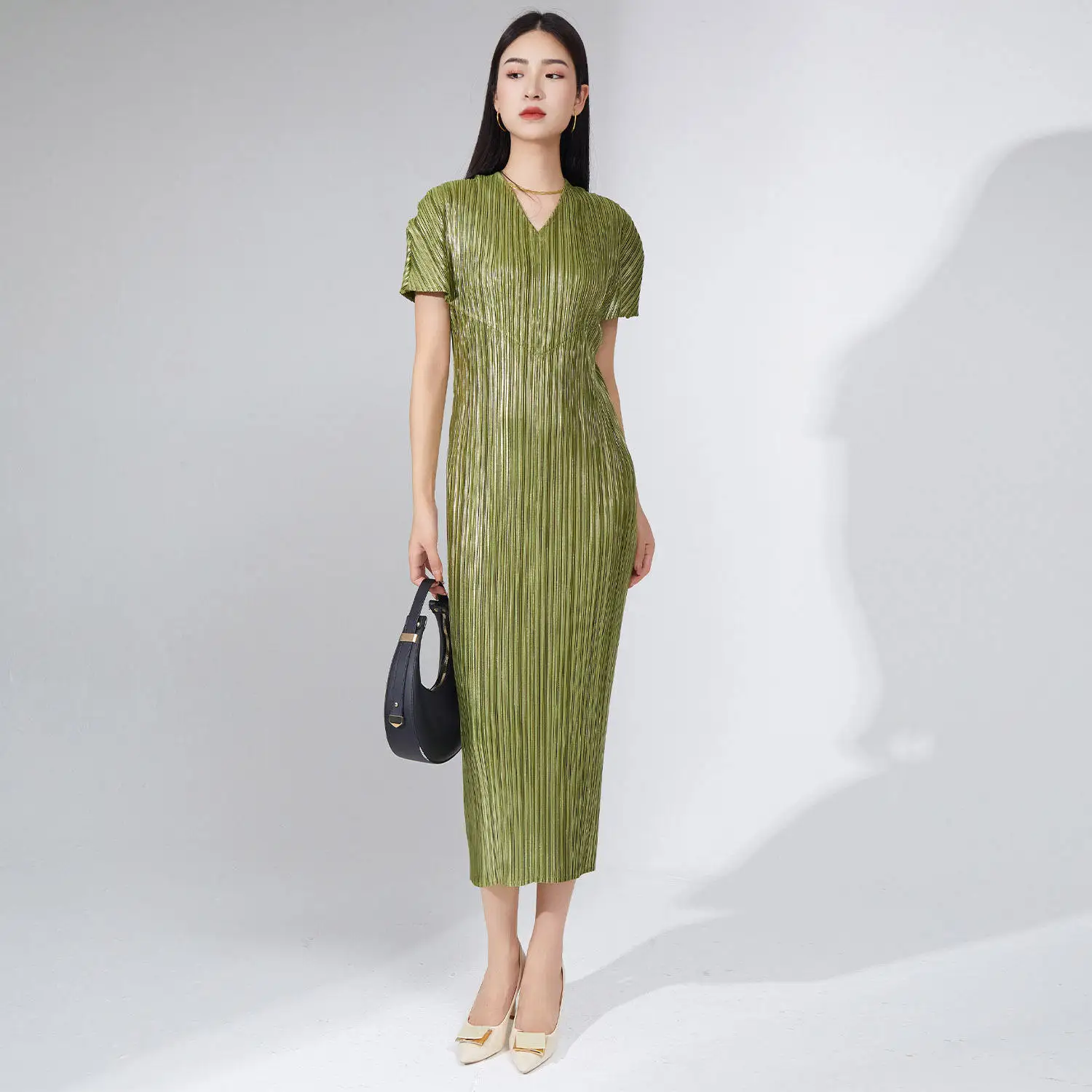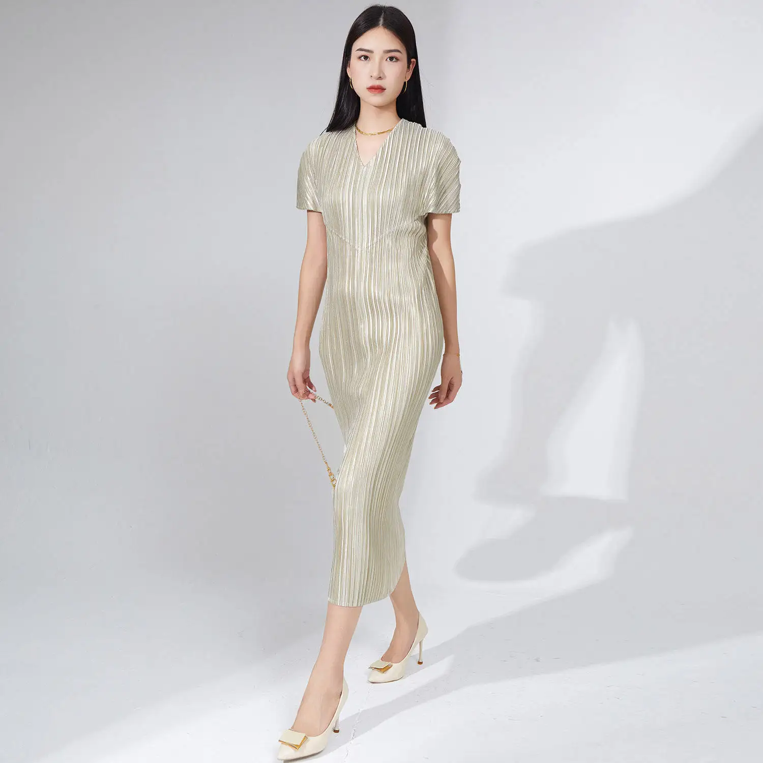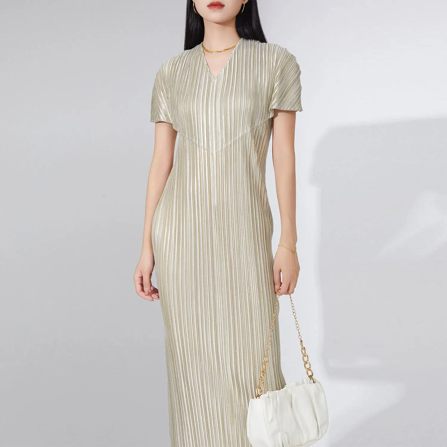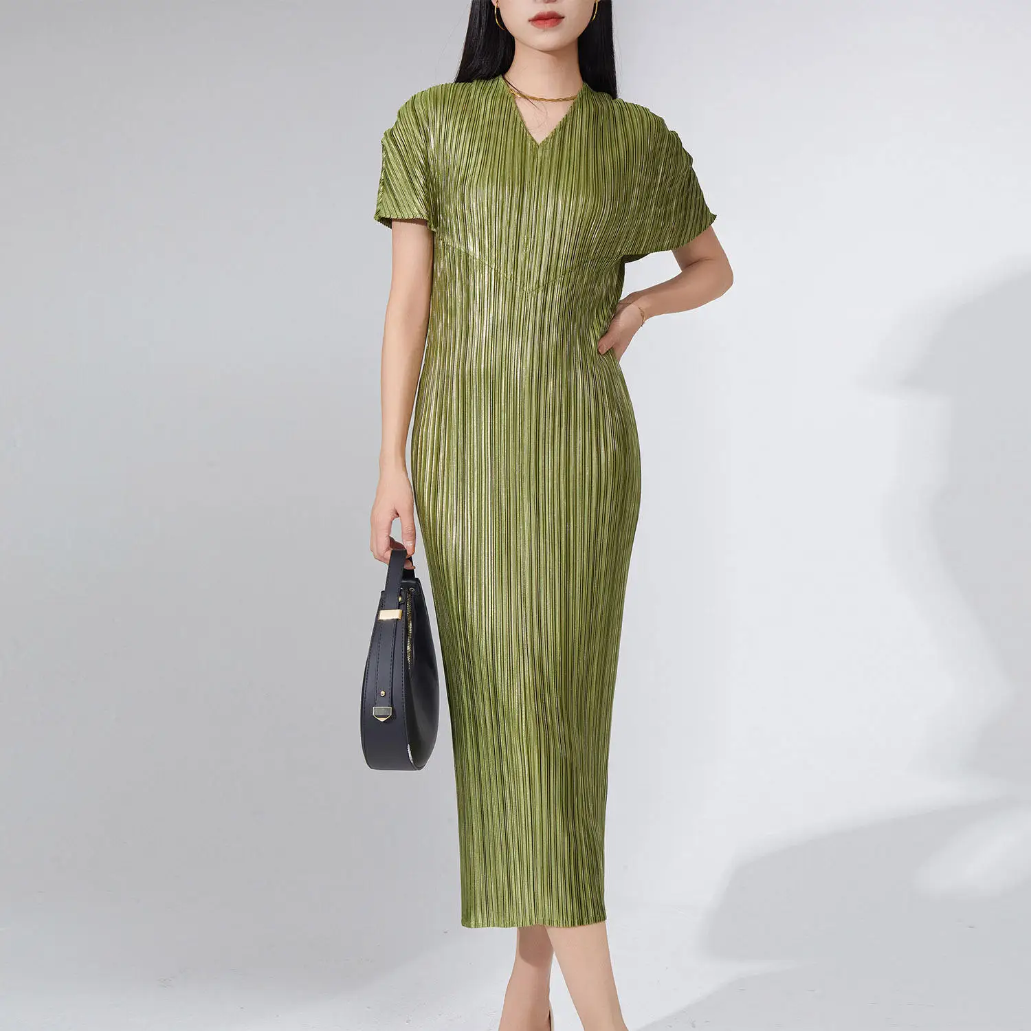 2025 Summer New Design High-End Women's Casual Dress Straight Midi Dress Metallic Polyester Miyake Pleated Dress