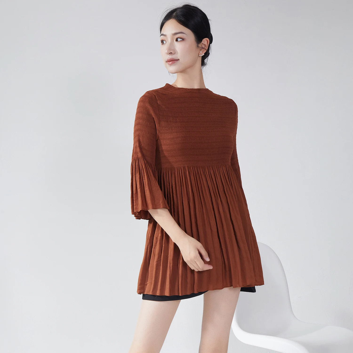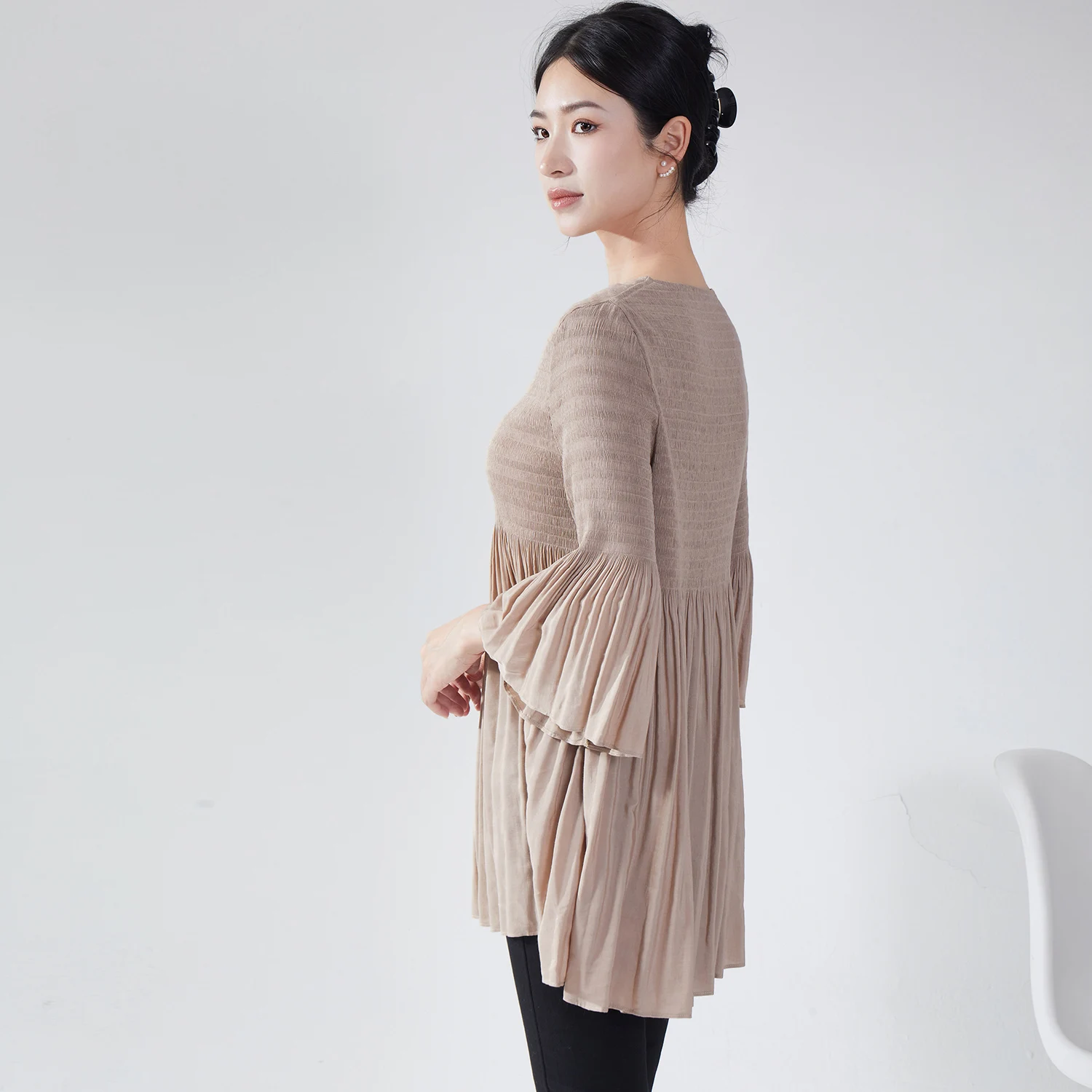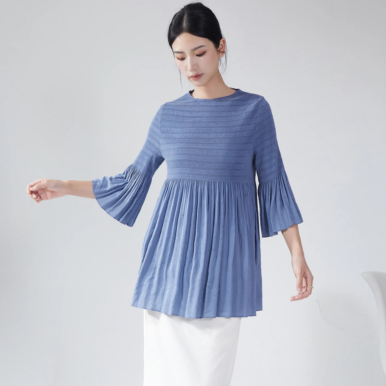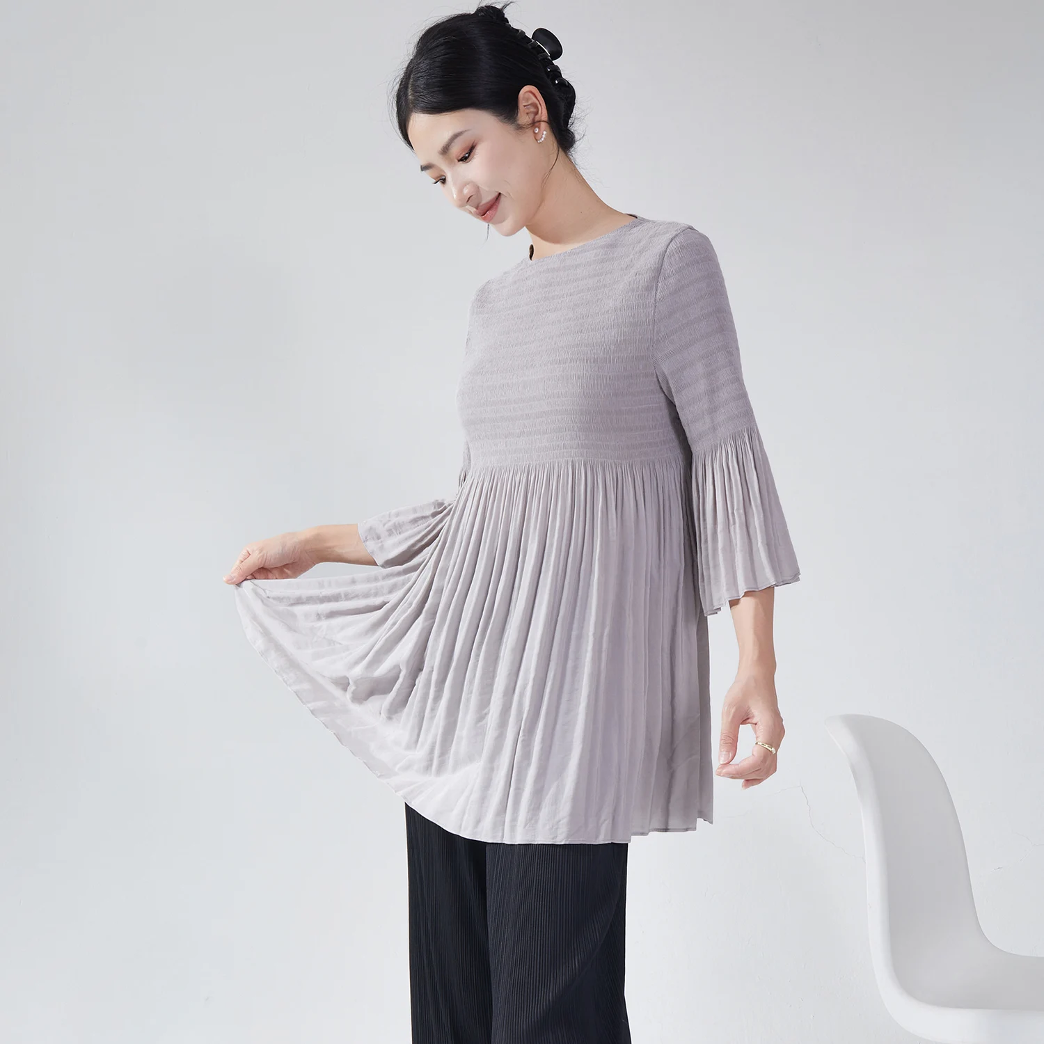 2025 Latest Design Miyake Pleated Top High Quality Woven Fabric Casual Crew Neck Long Sleeve Shirt Vintage Women's Shirt